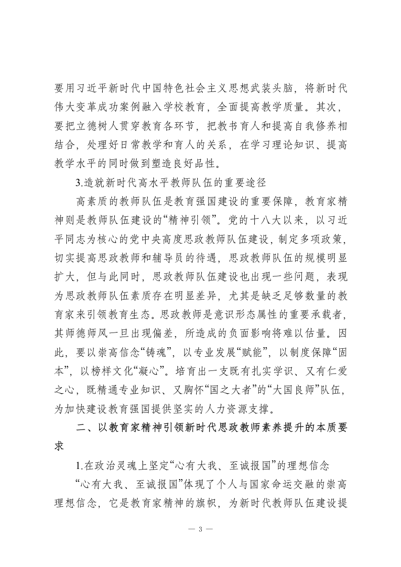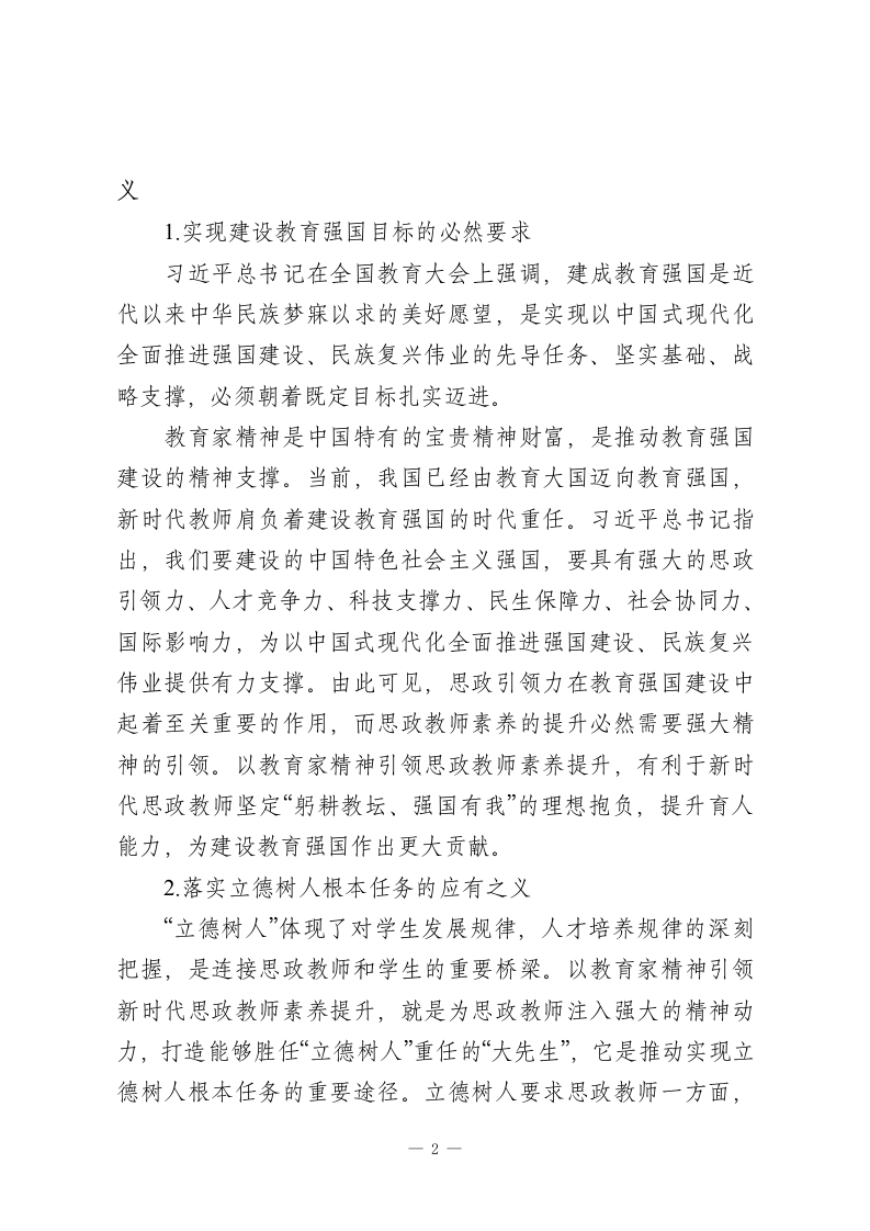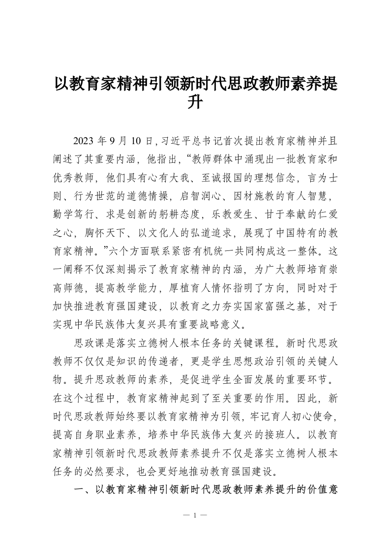 以教育家精神引领新时代思政教师素养提升2023年9月10日,习近平总书记首次提出教育家精神并且阐述了其重要内涵,他指出,“教师群体中涌现出一批教育家和优秀教师,他们具有心有大我、至诚报国的理想信念,言为士则、行为世范的道德情操,启智润心、因材施教的育人智慧,勤学笃行、求是创新的躬耕态度,乐教爱生、甘于奉献的仁爱之心,胸怀天下、以文化人的弘道追求,展现了中国特有的教育家精神。”六个方面联系紧密有机统一共同构成这一整体。这一阐释不仅深刻揭示了教育家精神的内涵,为广大教师培育崇高师德,提高教学能力,厚植育人情怀指明了方向,同时对于加快推进教育强国建设,以教育之力夯实国家富强之基,对于实现中华民族伟大复兴具有重要战略意义。思政课是落实立德树人根本任务的关键课程。新时代思政教师不仅仅是知识的传递者,更是学生思想政治引领的关键人物。提升思政教师的素养,是促进学生全面发展的重要环节。在这个过程中,教育家精神起到了至关重要的作用。因此,新时代思政教师始终要以教育家精神为引领,牢记育人初心使命,提高自身职业素养,培养中华民族伟大复兴的接班人。以教育家精神引领新时代思政教师素养提升不仅是落实立德树人根本任务的必然要求,也会更好地推动教育强国建设。一、以教育家精神引领新时代思政教师素养提升的价值意1