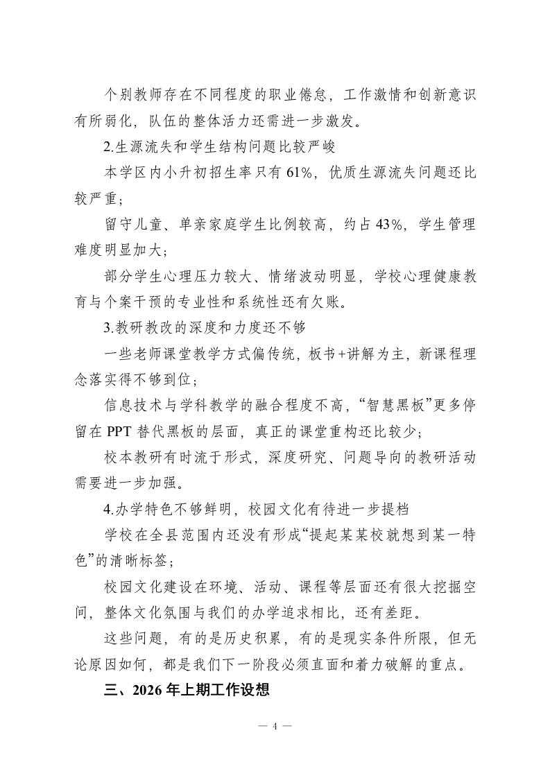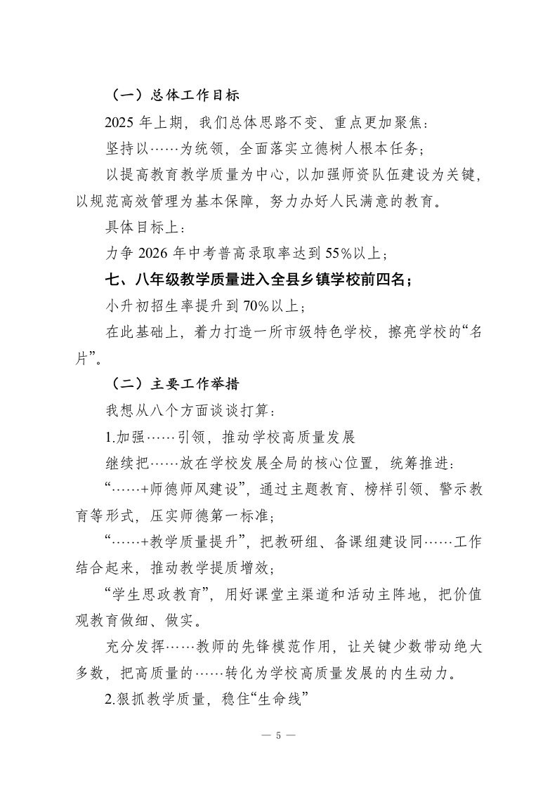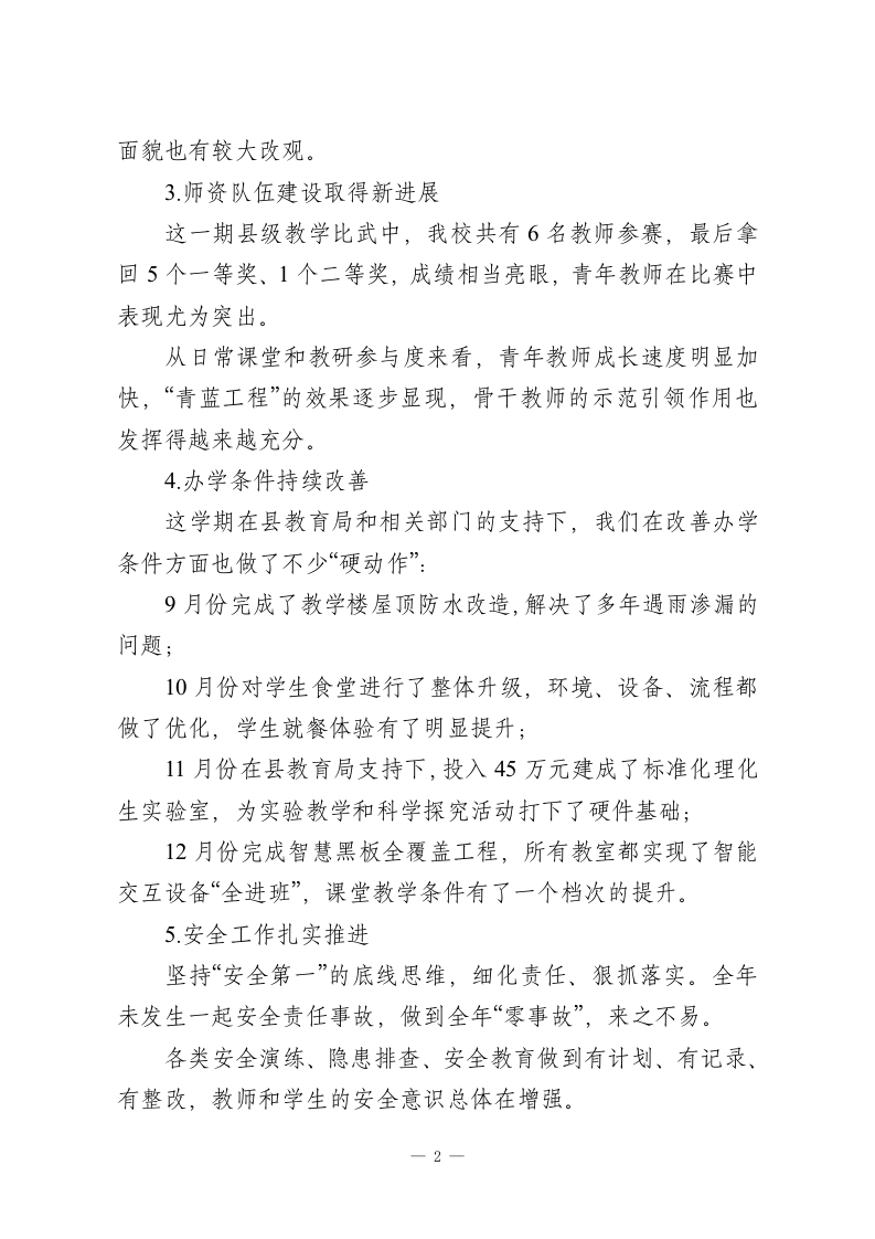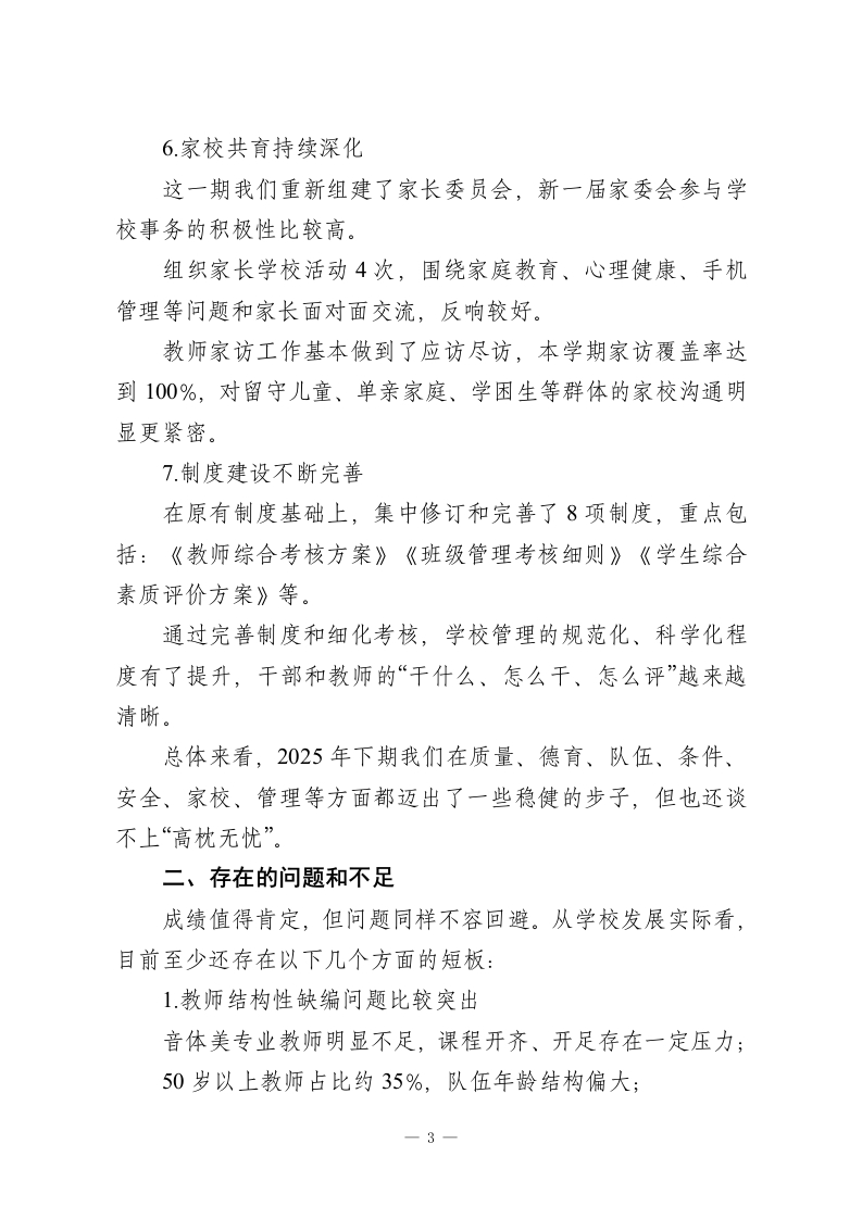 在2025年县教育局务虚会上的发言:在总结中鼓干劲,在忧患中求发展根据会议安排,我就学校有关工作情况,向各位领导、各位同仁作个汇报。大致分三块来说:一是回顾一下2025年下期的主要工作和成绩;二是实事求是地谈谈存在的问题;三是汇报2026年上期的思路和打算。一、2025年下期工作回顾这一期,在县教育局的坚强领导和悉心指导下,在…等有关部门的大力支持下,全校教职工可以说是拧成一股绳、铆足一股劲,学校整体工作稳中有进、亮点不少。简单概括,有这么几方面情况:1.教学质量稳步提升中考方面,2025年中考普高录取率达到52.3%,比上一年提升了6.8个百分点,说明我们这两年的教学基础和过程管理还是见到了一些成效的。七、八年级期末统考,整体成绩排在全县乡镇学校第5名,比我们年初预估的位置略有前移,虽然离目标还有差距,但趋势是向好的。2.德育工作成效比较明显学校顺利通过创建验收,荣获县级“文明校园”称号,这既是对我们德育工作的肯定,也是对学校整体办学水平的认可。大课间活动在全县评比中再次拿到一等奖,说明我们的阳光体育、大课间组织已经形成了一定特色和经验,学生的精神1