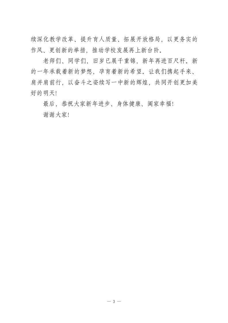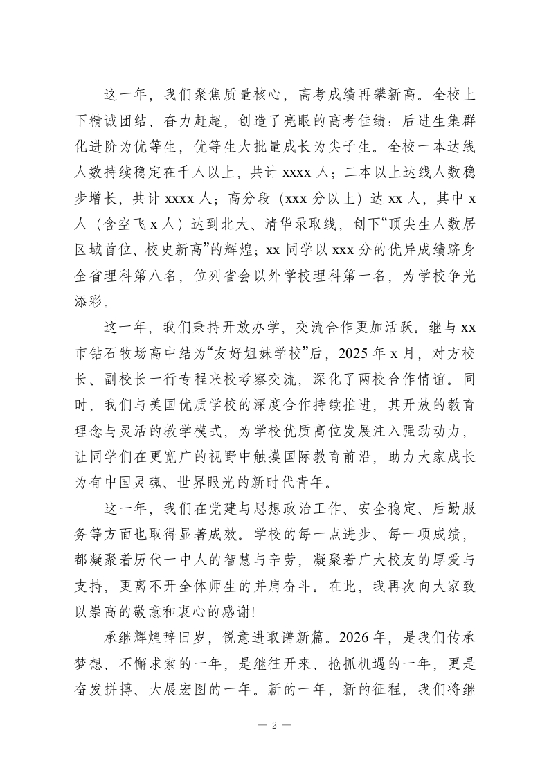 在2026年元旦全体师生大会上校长讲话:辞旧岁续辉煌,迎新年谱新篇亲爱的老师们、同学们:大家好!律回春晖渐,万象始更新。在2026年元旦佳节来临之际,我谨代表校委会、党总支,向辛勤耕耘、乐于奉献的全体教职员工,向朝气蓬勃、勤奋进取的同学们,致以最诚挚的新年问候和美好的祝福!向长期以来关心、支持学校事业发展的社会各界人士,表示最衷心的感谢!Xx载沧桑砥砺,一甲子春华秋实。今年,我们迎来了城区一中建校xx周年的重要时刻。xx年来,学校与国家民族命运休戚与共,与区域教育事业同步发展,积淀了优良的精神传统、鲜明的办学特色和厚实的办学优势。一代代一中人开拓创新、务实进取,为国家培育了大批学术精英、治国栋梁、兴业英才,为引领区域教育高质量发展作出了重要贡献。尤其在刚刚过去的2025年,全校师生团结奋斗、奋勇争先,学校各项工作亮点纷呈、硕果累累:这一年,我们深化内涵发展,教学改革走深走实。坚持“解放、还权、回归、高效”原则,持续深化课堂教学改革,将成熟的自主学习模式延伸至管理与评价领域。大力推进学生自主管理、自主评价,让同学们走向前台展示个性风采,既增强了主人翁责任感与荣誉感,更提升了自我发展、自主管理能力,为树立正确人生观、实现终身发展筑牢根基。1