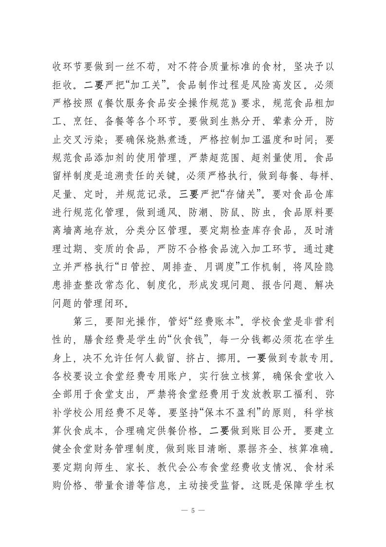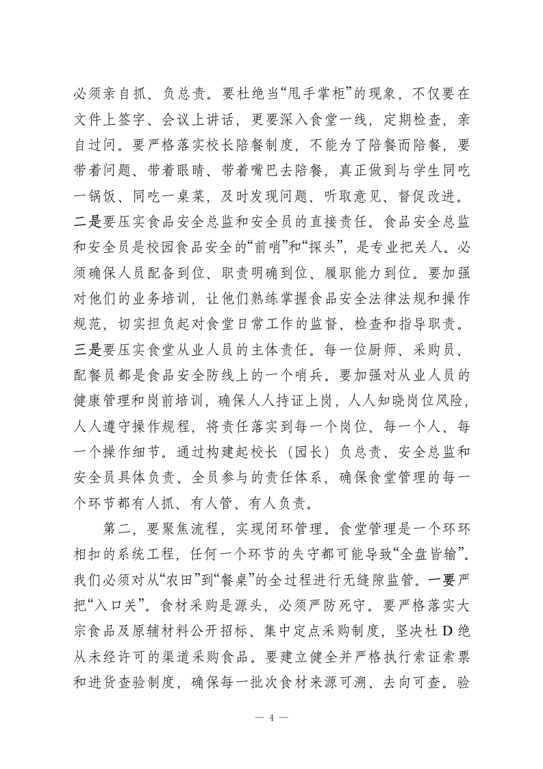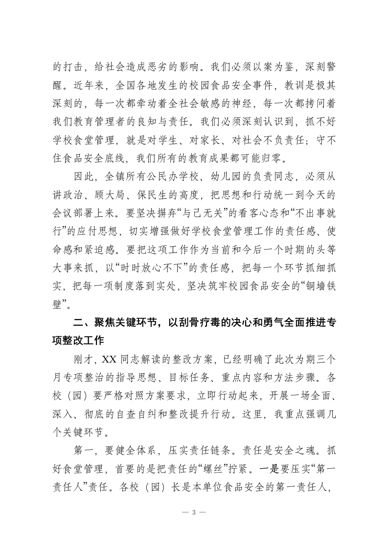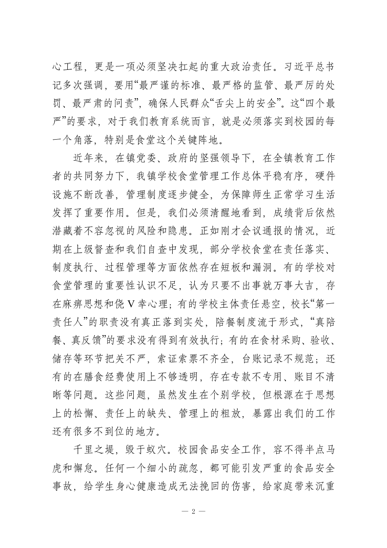 在XX镇基层学校食堂管理专项工作会议上的讲话同志们:今天,我们在这里召开全镇基层学校食堂管理专项工作会议,主要任务是深入贯彻落实上级关于校园食品安全工作的系列重要指示精神,全面分析我镇当前基层学校食堂管理中存在的突出问题,安排部署为期三个月的专项整改工作,动员全镇上下以最坚决的态度、最严格的标准、最有力的举措,打一场校园食品安全管理的攻坚战、持久战,切实保障广大师生的身体健康和生命安全。刚才,XX同志传达了上级部门的相关文件精神,XX同志对我们精心制定的《关于加强和改进XX镇基层学校食堂管理工作整改方案》进行了详细解读,几位校(园)长代表也作了很好的表态发言,态度坚决,措施具体。总的来看,这次会议准备充分,主题鲜明,目标明确,是一次统一思想、凝聚共识、压实责任的动员会,也是一次直面问题、刀刃向内、铁腕整治的誓师会。下面,我结合会议主题和下一步工作,再讲三点意见。一、提高政治站位,深刻认识抓好学校食堂管理工作的极端重要性和现实紧迫性民以食为天,食以安为先。校园食品安全,一头连着千家万户的幸福安宁,一头系着社会的和谐稳定。它不是一项普通的业务工作,而是一项关系到下一代健康成长的民生工程、民1