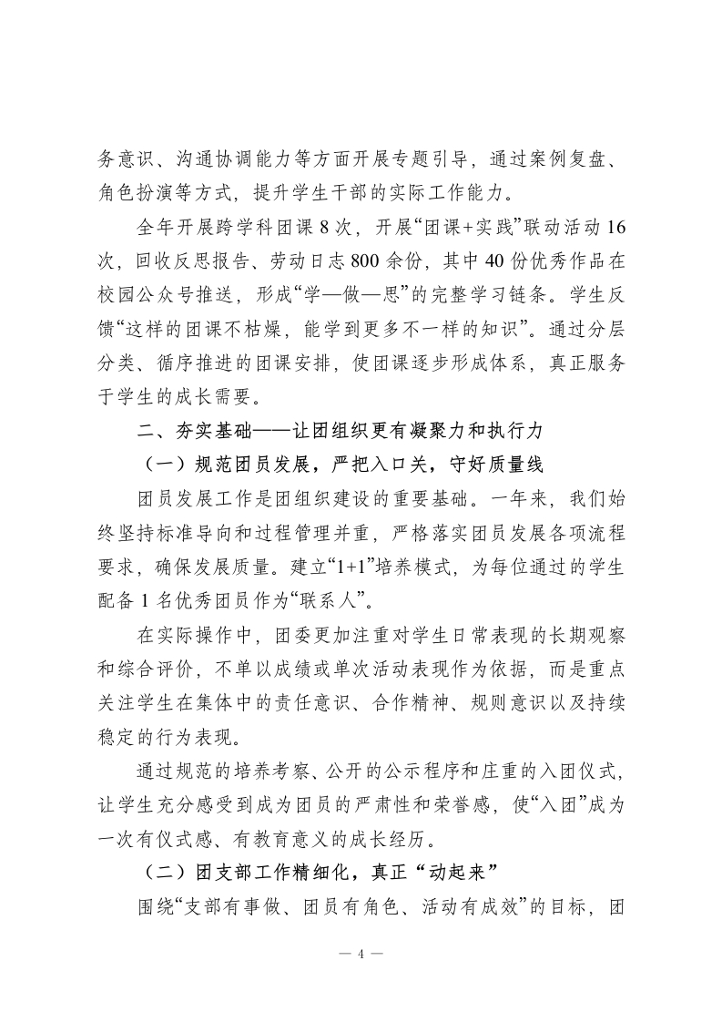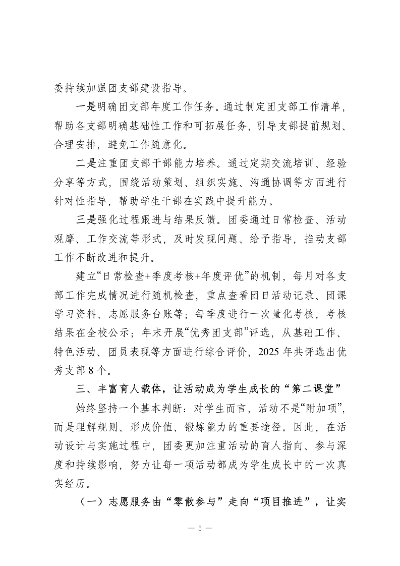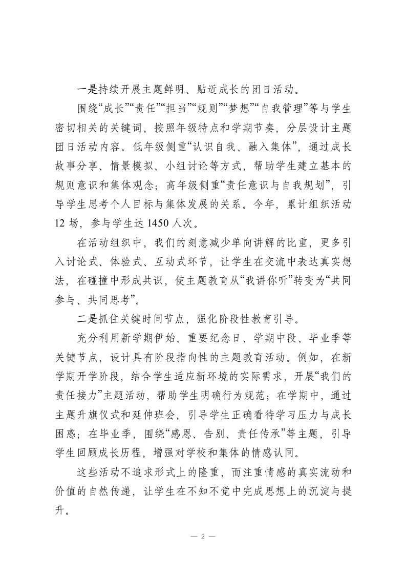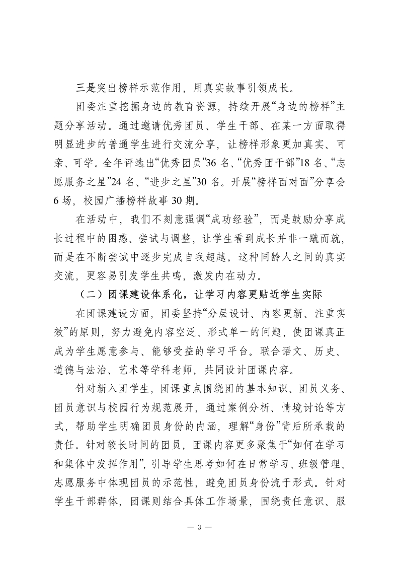 在陪伴中引领,在实践中成长2025年学校团委工作述职报告2025年,是我校团委工作深化推进的一年,也是进一步回归育人本质、贴近学生实际的一年。一年来,学校团委在学校整体工作引领下,紧紧围绕学生身心特点和成长需求,坚持以立德树人为根本任务,以服务学生成长为工作核心,以活动育人、实践育人、文化育人为主要路径,在“陪伴中引领、在实践中成长”的工作理念指引下,不断夯实工作基础,丰富育人载体,拓展育人空间,努力让团的工作更加真实、更加温暖、更加有力量。在实际工作推进过程中,团委始终坚持把学生放在工作的中心位置,不急于求成、不追求形式上的热闹,而是更加注重工作的过程质量和育人实效,注重在日常中渗透引导,在实践中促进成长,让团组织真正成为学生成长道路上可信赖、可依靠的重要力量。现将2025年度学校团委主要工作情况述职如下。一、做好引领一一让价值引领“看得见、摸得着”(一)主题教育常态化,把“说教”变成“共鸣”针对学生思想活跃、情绪敏感、自我意识逐步增强、价值观正在形成的阶段性特点,在工作中始终坚持“贴近学生、尊重差异、循序渐进”的原则,努力避免简单化、口号化的教育方式,探索将主题教育融入学生日常学习生活和真实体验之中。1