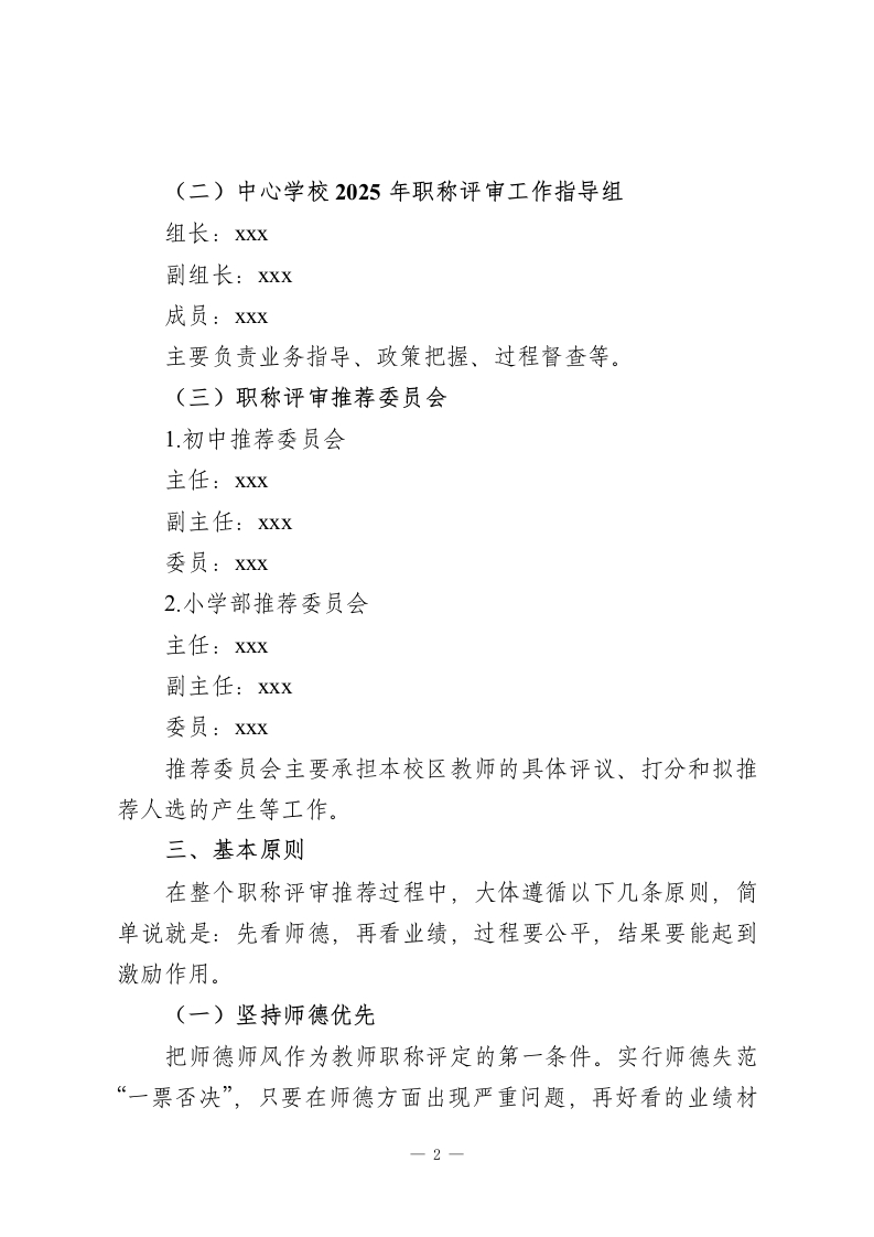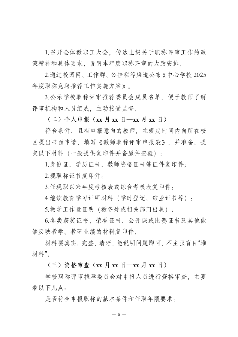 中心学校职称竞聘推荐工作实施方案(2025.12)为进一步推进职称制度改革,把我校教师职称评审推荐工作做得更细致、更踏实,同时也尽量调动广大教师的积极性,按照省、市、县教育主管部门关于职称评审推荐工作的有关文件精神,结合我校的实际情况,现制定本实施方案。可以理解为:上面有总体要求,我们根据自家情况,把操作细则说清楚。一、指导思想以落实立德树人的根本任务,把育人放在首位,坚持德才兼备、以德为先的用人标准。通过建立一个尽量科学、规范,又尽可能公平公正的教师职称评审制度,来激励大家安心教书、潜心育人,真正做到爱岗敬业、守好讲台,为学校高质量发展提供可靠的人才保障和队伍支撑。二、组织机构为了让职称评审推荐工作有条不紊、有人负责,学校成立职称评审工作领导小组、指导小组和推荐委员会,分层负责、各司其职。(一)2025年职称评审工作领导小组(中心学校)组长:XXx副组长:Xxx成员:XXx主要负责全局统筹、重大事项把关、结果审定等工作。-1