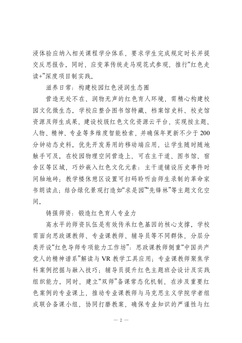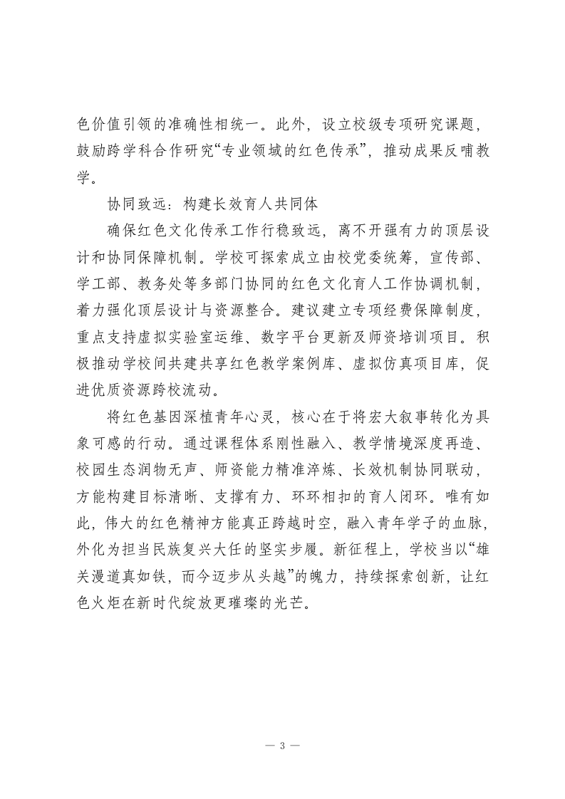 铸魂育人赋新能:学校推动红色文化传承的时代使命在中华民族伟大复兴的新征程上,红色文化作为党领导人民创造的宝贵精神财富,其传承与弘扬面临着深刻变革的时代语境。机遇与挑战交织,呼唤传承模式的与时俱进。学校作为育人高地,肩负着激活红色基因、创新传播路径、筑牢文化自信的光荣使命,是推动红色精神从历史符号转化为时代动能的主阵地。淬炼课堂:让红色基因融入学科沃土学校推动红色文化入脑入心,深耕课堂教学是基础性环节。在思政课程建设上,可探索设立“中国共产党人的精神谱系”固定教学单元,建议理论教学与实践环节分别不少于4学时。教学过程中,在依托权威教材的同时,应积极挖掘本校特有的红色资源,如校史中感人的英雄事迹,将其汇编成校本课程案例补充进教材,能有效增强理论的亲和力与感染力。活化历史:数字赋能红色文化育人提升育人实效的关键在于让历史从书本走入心灵。学校可考虑投入专项资金,建设配备先进虚拟现实(VR)、增强现实(AR)技术设备的红色故事情境模拟实验室。每年联合技术团队,共同开发3一5个高还原度、强交互性的虚拟场景。例如,学生可化身“通信兵”,体验紧急情报传递的忠诚坚守;或参与红旗渠开凿,在感受集体协作伟力的过程中深化认知。此类沉1