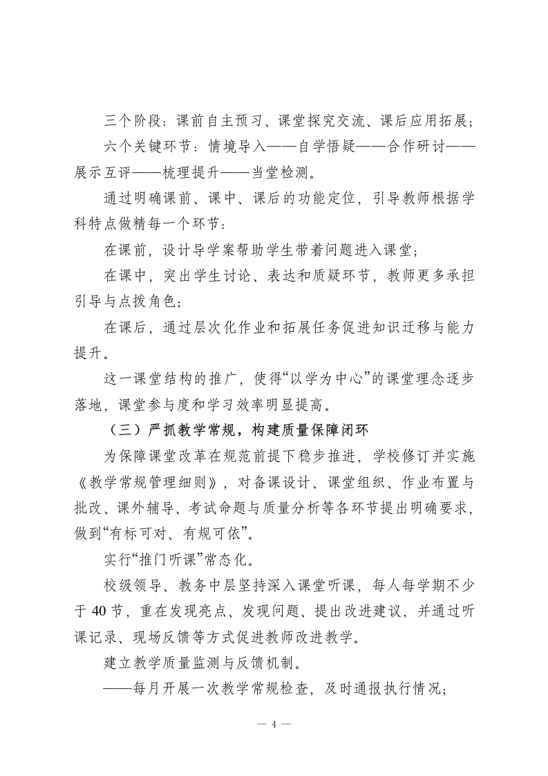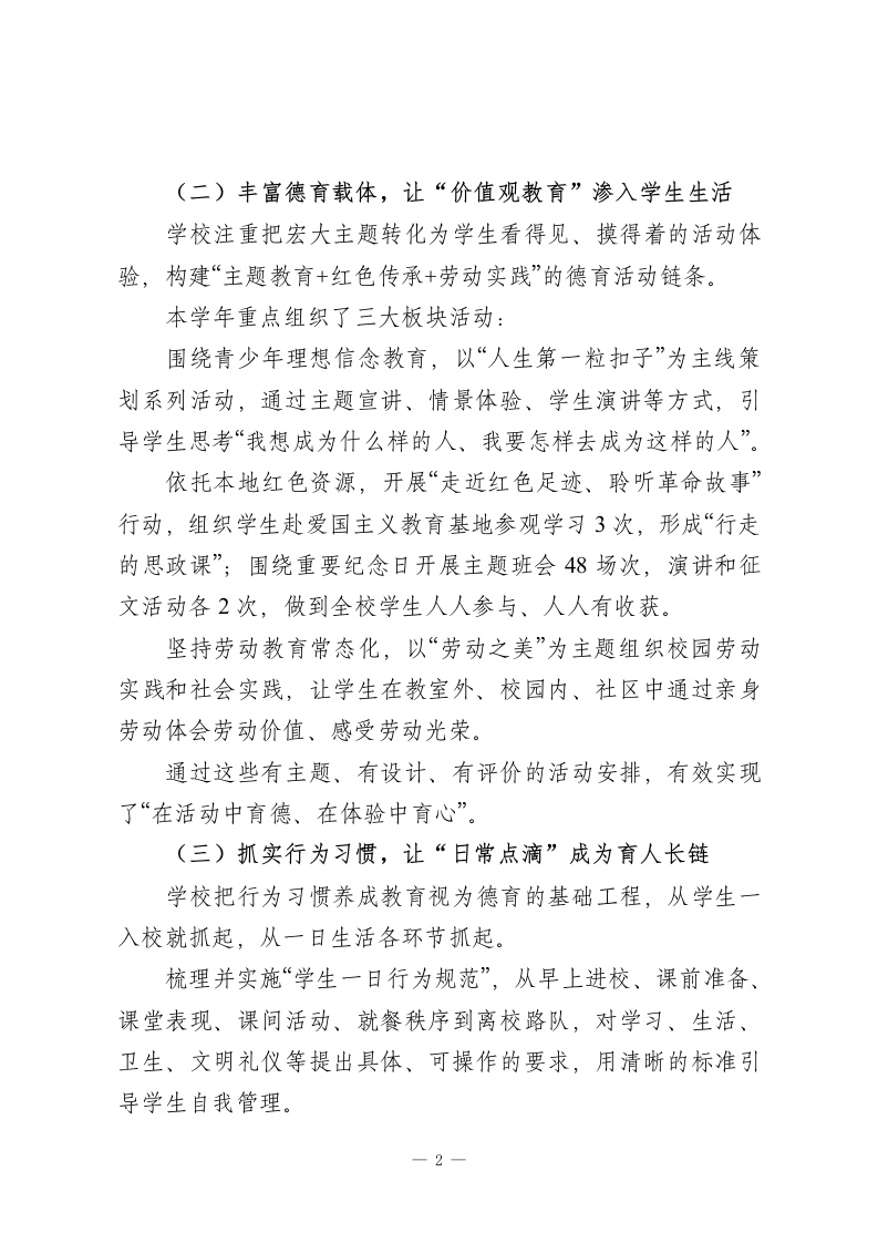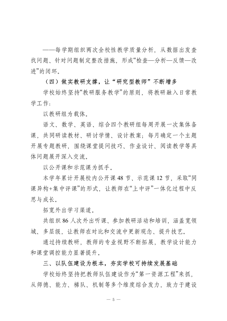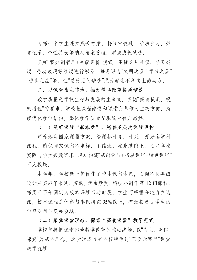 总结一年来的工作,校长发言:校各方面工作取得了显著成效一年来,在市教育局、区教育办公室的坚强领导和悉心指导下,在区教育办公室的关心支持下,学校始终把办人民满意的教育作为根本追求,全体教职员工同心同向、担当实干,认真贯彻落实上级教育方针和决策部署,紧扣“立德树人”这一根本任务,稳步推进教育教学改革,各项工作取得了阶段性成效和新的进步。现将本学年主要工作情况梳理如下:一、以立德树人为统领,织密“三全育人”育人网学校始终坚持把“培养德智体美劳全面发展的社会主义建设者和接班人”作为根本目标,主动重构育人体系,从体制机制、实践载体到日常管理多点发力,基本形成了全员、全程、全方位协同育人的新格局。(一)重构德育机制,让“有人抓、有章可依”落到实处围绕立德树人中心任务,学校组建了由校长担任组长、副校长和德育中层为副组长,德育处、少先队大队部、各年级班主任为成员的德育工作领导小组,明确了“学校统筹、部门协同、班级落实”的育人责任链条。在此基础上,系统制定和完善了《德育工作实施方案》《班主任工作考核办法》《学生日常行为规范管理细则》等制度,将德育目标细化为可操作的岗位职责和工作流程,使德育工作有标准、有抓手、有考核,真正做到“制度管德育、机制促落实。1