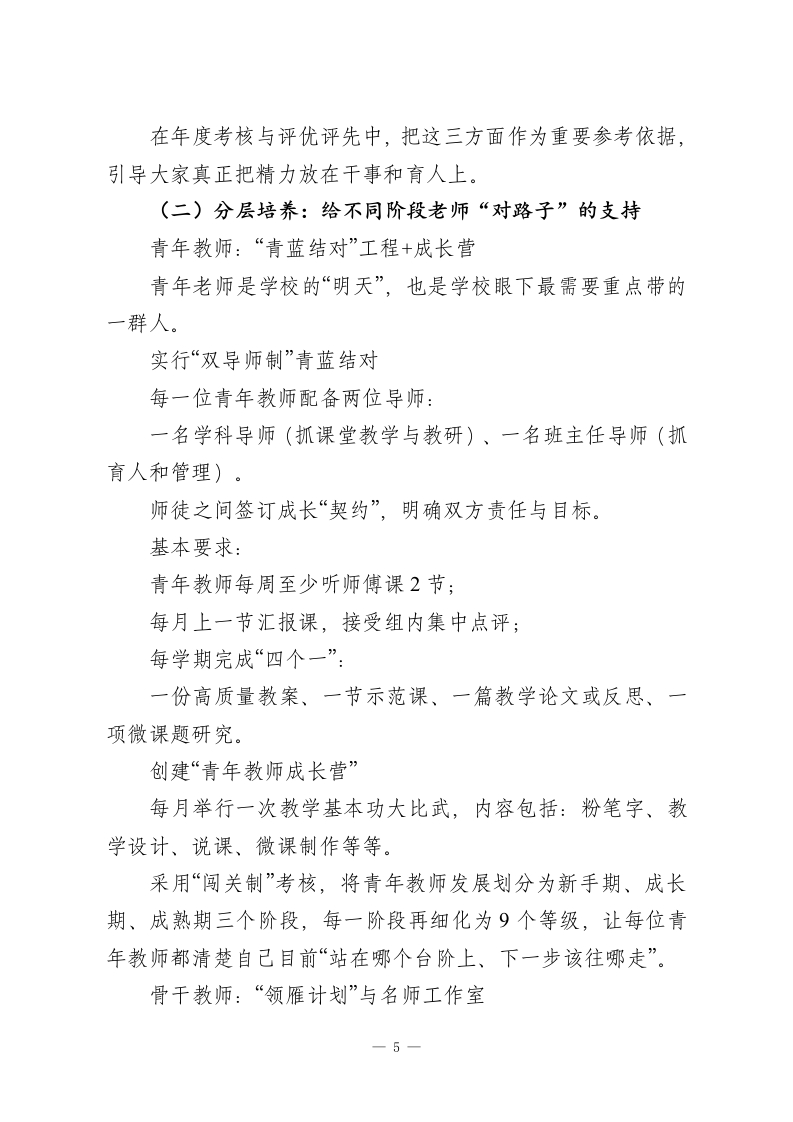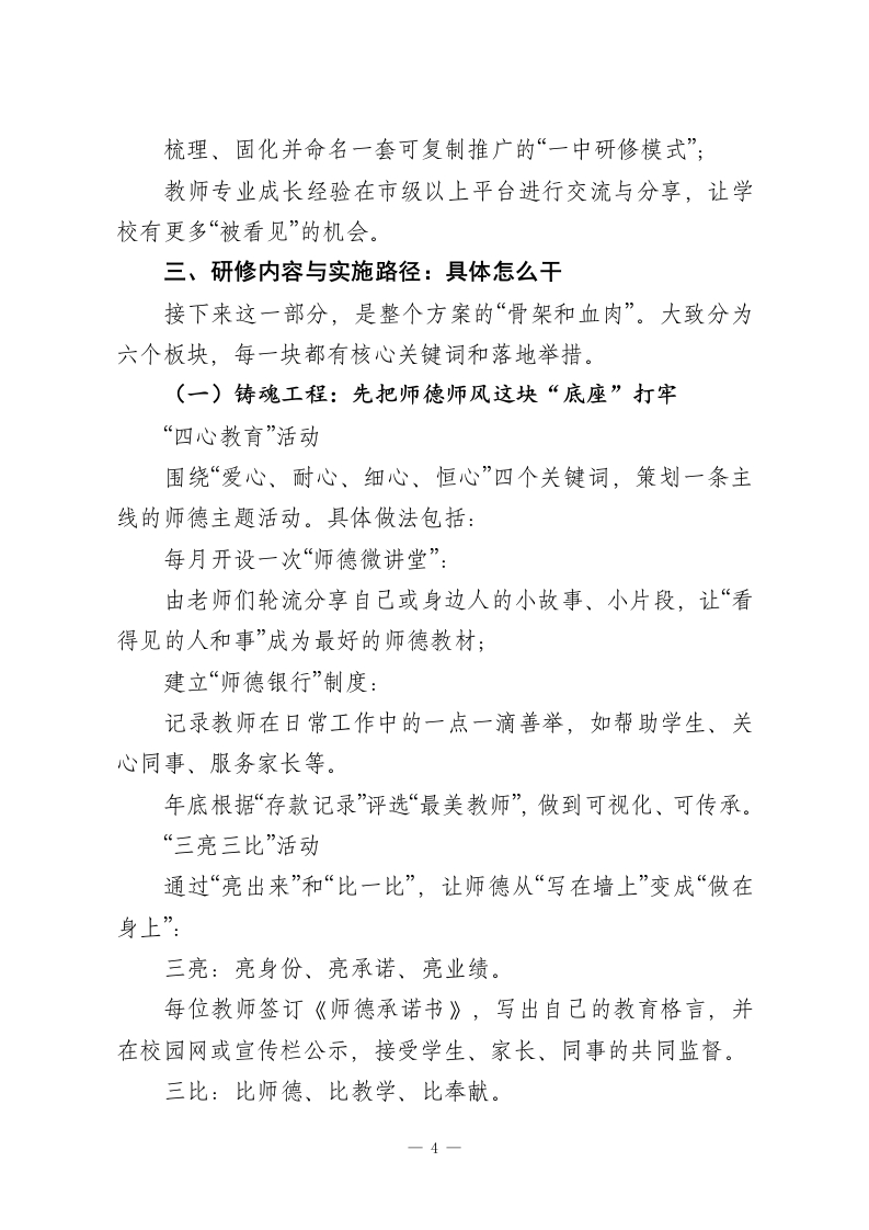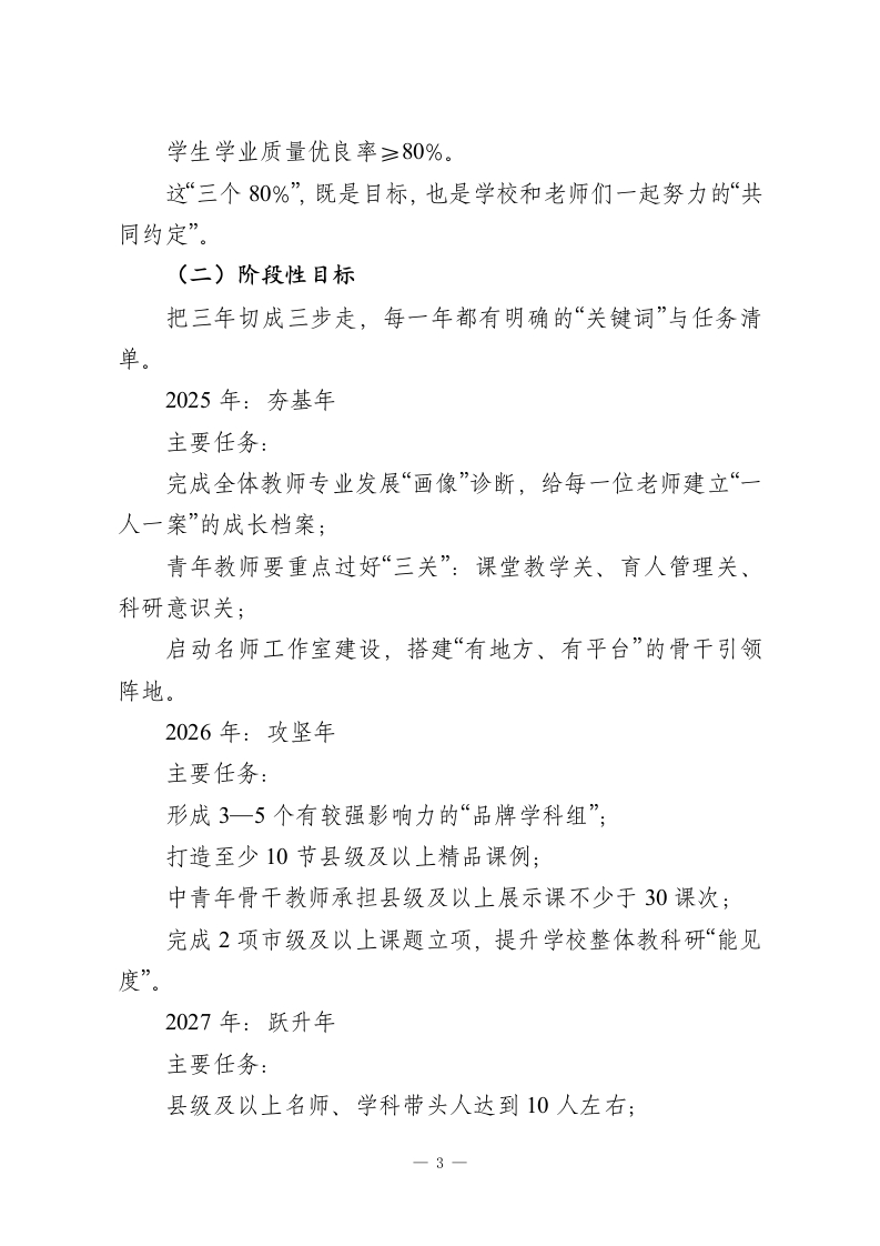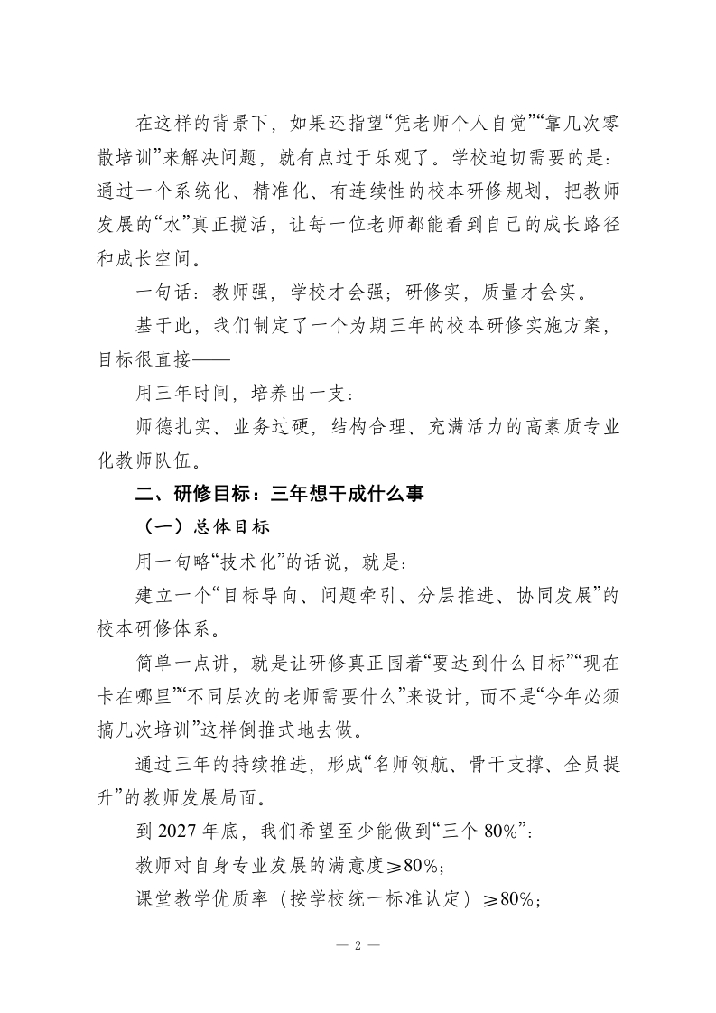 2025-2027年度校本研修实施方案:基于教师专业成长校本研修主题一、研修背景:为什么非做这件事不可先把底子交代清楚。我们学校是一所县属完全中学,在校学生2400多人,教职工180多人。整体盘子不算小,但发展到了现在这个阶段,确实也遇上了一些新的“拐点”和“堵点”:一是教师结构的矛盾比较突出。35岁以下青年教师已经占到45%,队伍朝气足,但经验还不够、积淀不够,需要尽快成长起来;真正意义上的骨干教师只有15%左右,成熟名师资源偏少,“能带队、能领跑”的人还不够多。二是教学质量遇到了“平台期”。这几年整体成绩在县域里一直保持前列,但离我们心里想要达到的“优质均衡”还有差距。尤其在学生核心素养培养、深度学习组织与引导等方面,明显还有提升空间,不能只停留在“分数好看”这一层。三是教育数字化转型的压力越来越大。政策在往前推,硬件条件也在慢慢跟上,但有些老师的信息素养还不够高,对智慧教育手段的应用也比较谨慎甚至有点排斥,整体推进速度偏慢。再加上“双减”落地、新课标实施、中高考改革等多项任务叠加,我们可以说是站在一个“不得不变、必须变好”的节点上。一1-