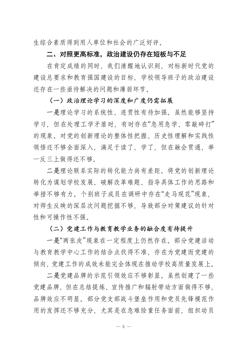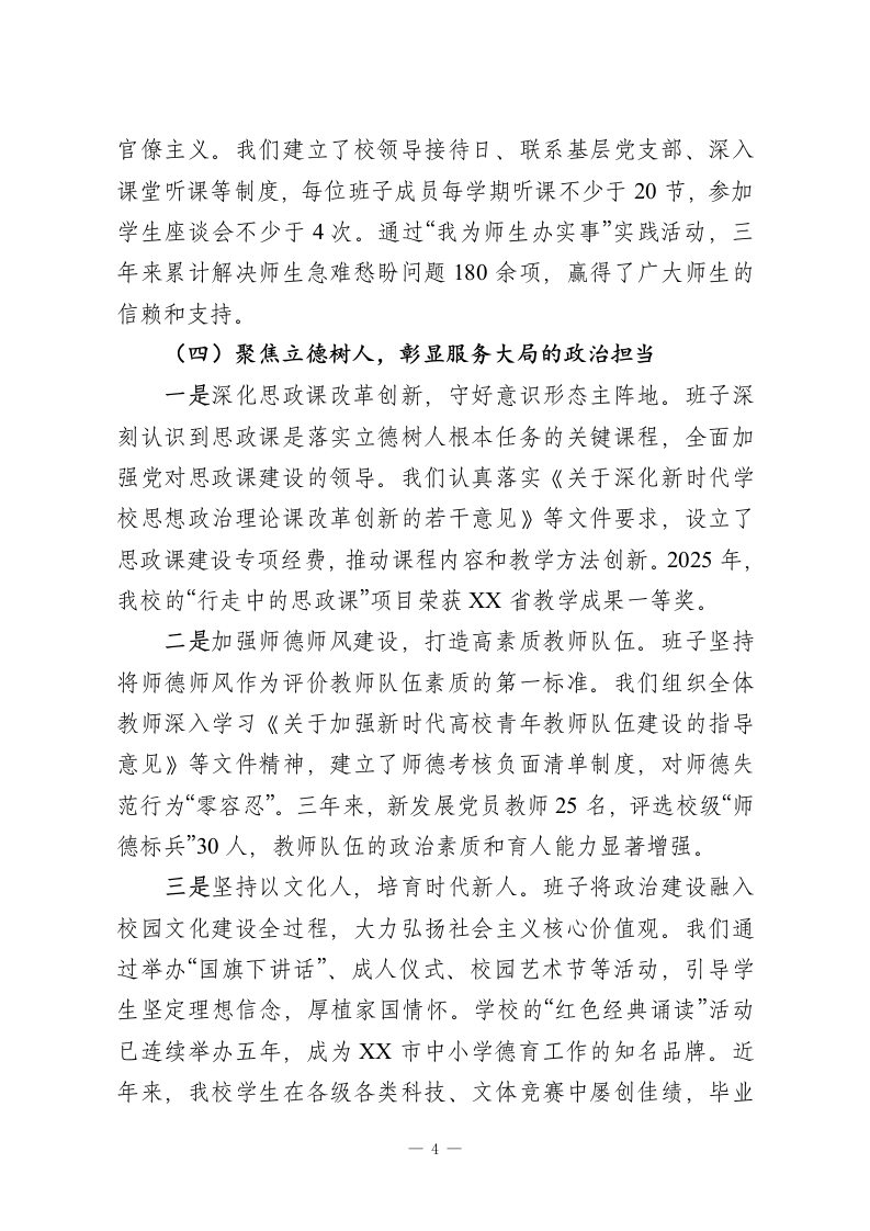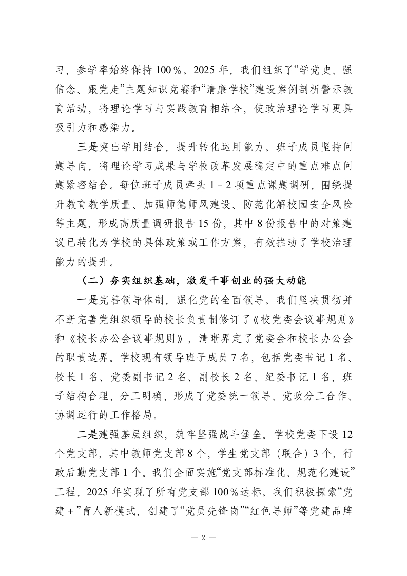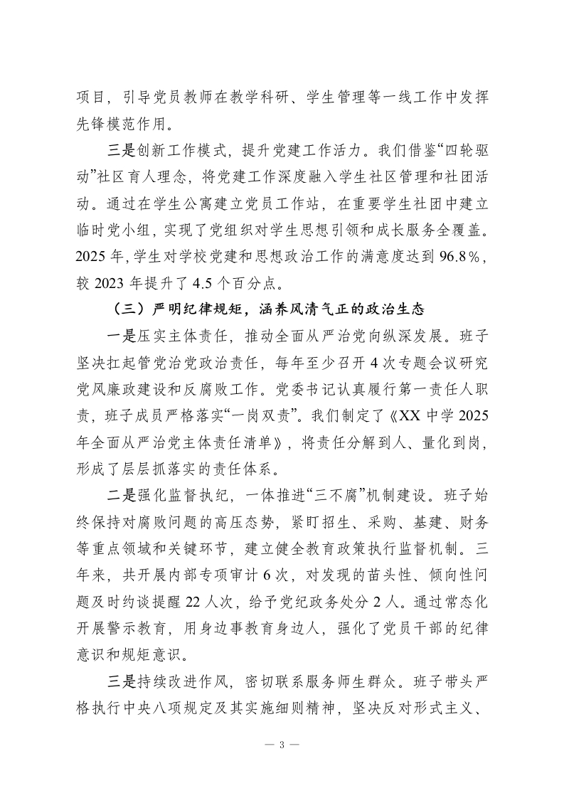 XX中学领导班子政治建设自查自评报告根据上级党委关于加强领导班子政治建设的统一部署和要求,XX中学党委领导班子对照《关于加强党的政治建设的意见》等文件精神,聚焦2023年至2025年期间的工作实践,进行了系统、全面、深入的自查自评。现将有关情况报告如下。一、坚持政治引领,管党治校能力建设取得新成效2023年以来,学校领导班子始终将党的政治建设摆在首位,坚持以习近平新时代中国特色社会主义思想为指导,深入学习贯彻党的XX大及历次全会精神,深刻领悟“两个确立”的决定性意义,增强“四个意识”、坚定“四个自信”、做到“两个维护”,不断提高政治判断力、政治领悟力、政治执行力,确保党的教育方针和上级决策部署在学校不折不扣地得到贯彻落实。(一)强化理论武装,筑牢政治忠诚的思想根基一是坚持学习为先,拧紧思想“总开关”。班子始终将理论学习作为首要政治任务,严格执行“第一议题”制度。2023年至2025年,共组织党委理论学习中心组集体学习78次,专题研讨25次,内容涵盖习近平新时代中国特色社会主义思想、党的XX大精神、《教育强国建设规划纲要》等。班子成员平均每年撰写学习心得和调研报告6篇以上,在学思践悟中不断筑牢信仰之基、补足精神之钙、把稳思想之舵。二是创新学习形式,增强教育实效性。在坚持集中学习的基础上,积极探索多样化的学习模式。我们利用“智慧党建”平台,开设线上学习专栏,推动班子成员利用碎片化时间自主学1