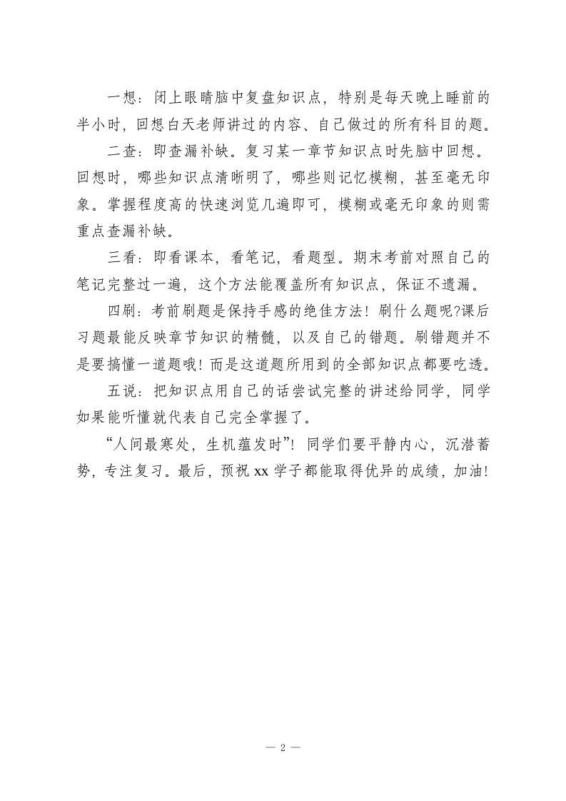 副校长在期末考试动员会上国旗下讲话:复之有道习之有效亲爱的老师们、同学们:大家早上好!今天我跟大家分享的主题是《复之有道习之有效》。光阴似箭,日月如梭,期末将至,相信我们又多了一份紧张和期待。紧张是来源于父母那热切的目光;来源于老师那淳谆的教导;也来源于我们面对考试的那份压力。俗话说“压力就是动力”,有了这份必要的紧张,我们的思维会更加敏捷,我们的表现会更加出色。我们期待,是因为到了验证自我的时刻,凭着这种积极的心态,我们瑞初学子一定能够做到更加认真,更加努力!那么我们如何做好复习呢?设置目标,复之有道。孔子日:“取乎其上,得乎其中;取乎其中,得乎其下;取乎其下,则无所得矣。”追求很高的目标,最终得到中等结果;追求中等目标,最终就只会得到很差的结果。追求低等目标的话,那恐怕是一无所得了。高效听课,行之有效。不论哪个科目,上课带着问题听讲,要紧跟老师思路,积极思考问题并回答,老师反复强调的重点要吃透。更重要的是在课堂上弥补自己的知识漏洞,比如一知半解的知识点,思路不清晰的题型等等。白天的课堂效率远远高于晚上自己熬夜狂补,学霸从来都不会浪费课堂上的一分一秒。还有几点建议:一想、二查、三看、四刷、五说。-1