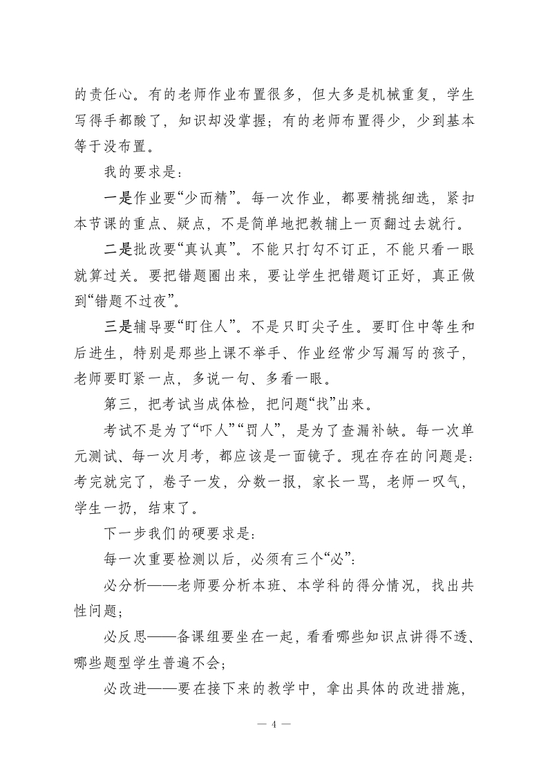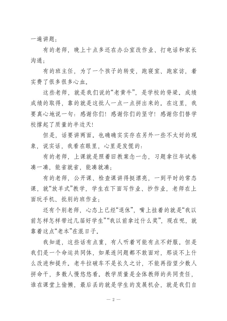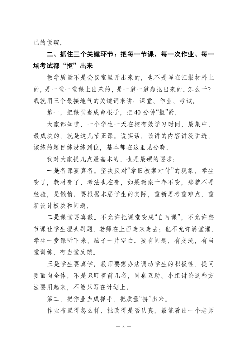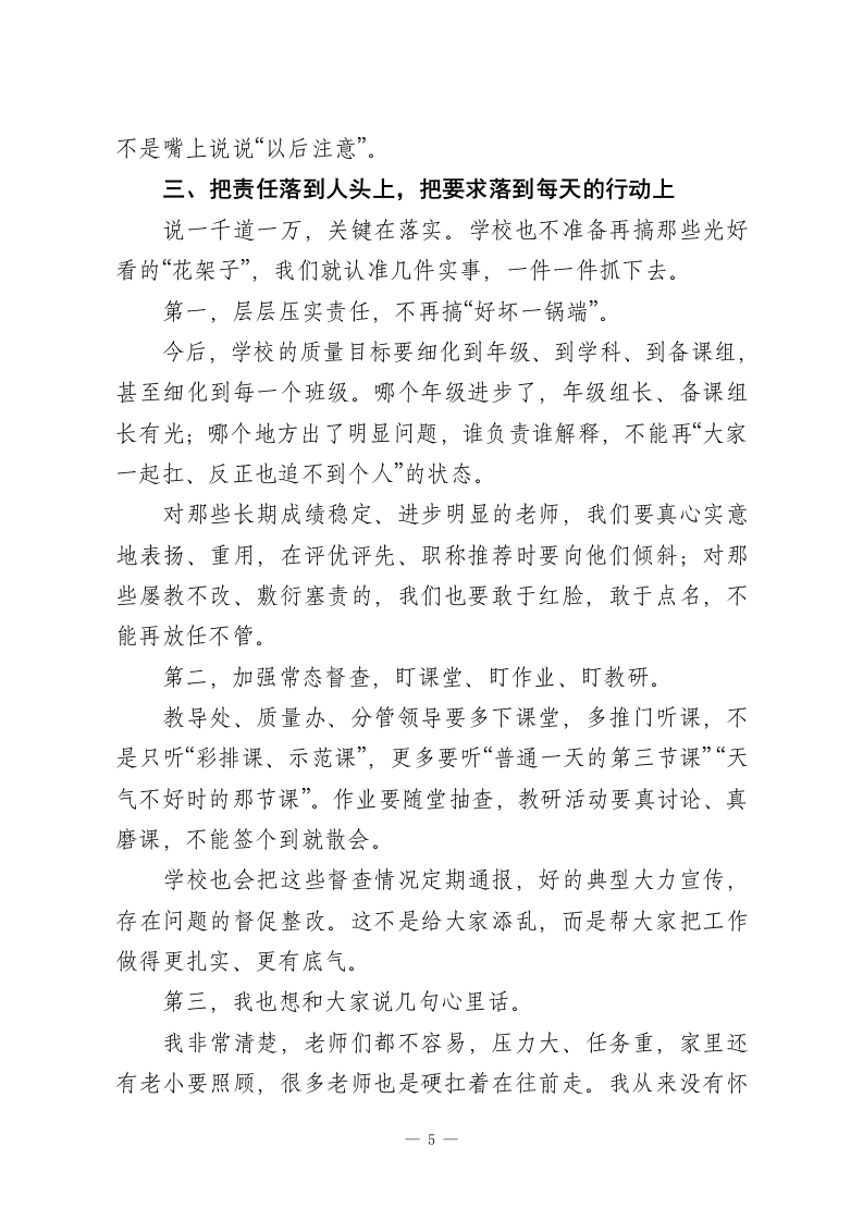 教学质量提升专题会议上,校长讲话:课上得不扎实,作业批得不走心,考试完了不反思一一质量滑坡不是没有理由!各位老师、同志们:大家下午好!光阴似箭,日月如梭,一个学期又走过了大半程。今天把大家集中起来开这个教学质量提升专题会,说心里话,不是为了多开一个会、说几句空话,而是到了非讲不可的时候了。学校这几年,也有成绩,也有荣誉,但是从最近几次考试、几次质量检测看,我们的教学质量,说好听点是“稳中有升不明显”,说直接一点,就是有下滑的危险,有“逆水行舟不进则退”的感觉。今天,我不想跟大家讲太多高大上的概念,也不想再翻什么“课程改革、核心素养”的那些文件,大道理大家都懂。我要讲的,就一句大白话:老牛拉破车、磨洋工、混日子、吃老本,这些现象如果再不下决心解决,最后压垮的,就是我们学校最后的希望!一、先把话说明白:质量问题,归根到底是态度问题、是精神状态的问题这几年,我在校园里走得比较多,教室转得也比较勤。好的一面,我是看在眼里的:有的老师,身体有病还坚持在讲台上,嗓子哑了还在一遍