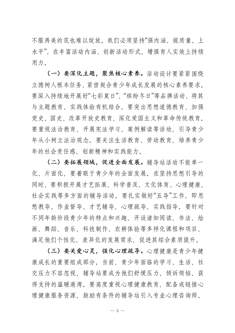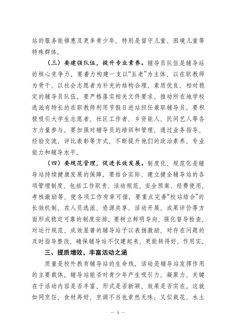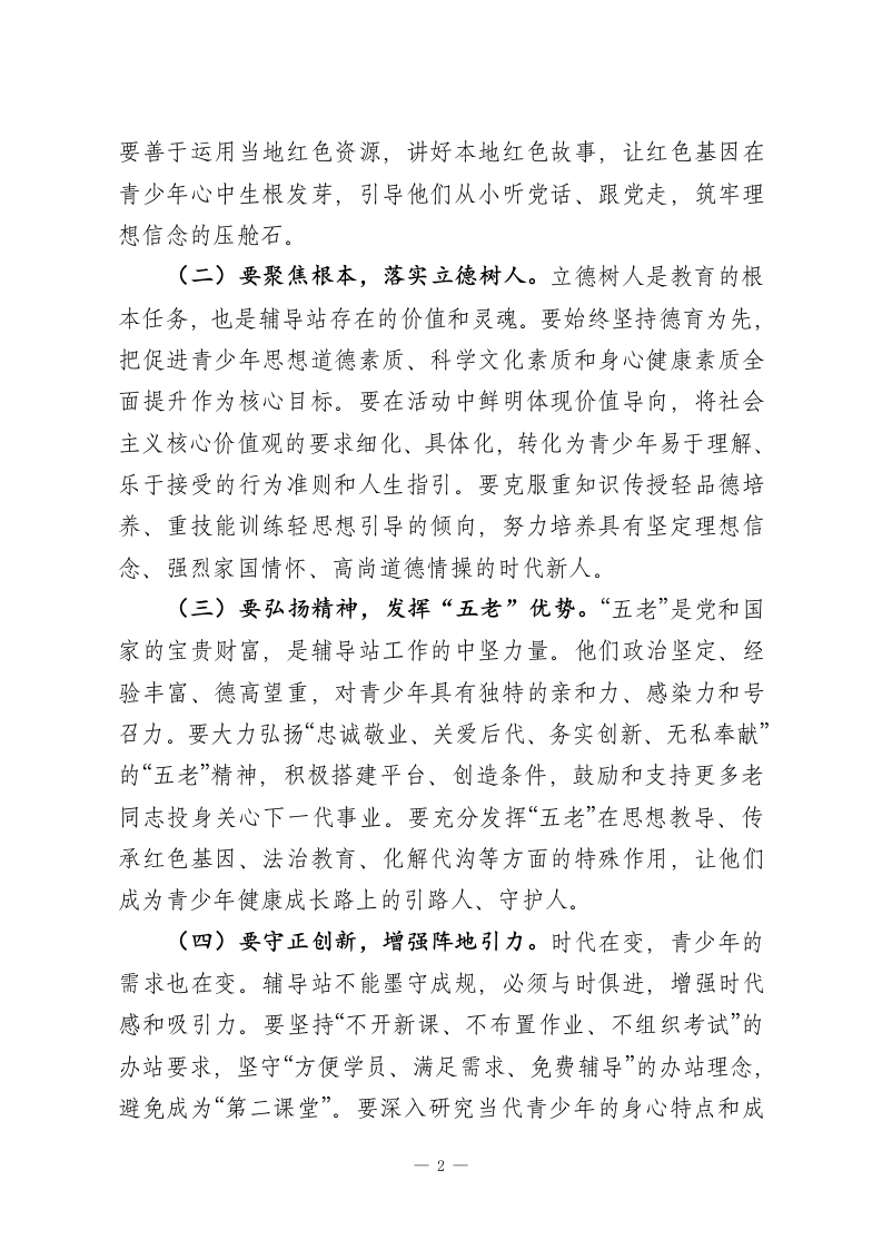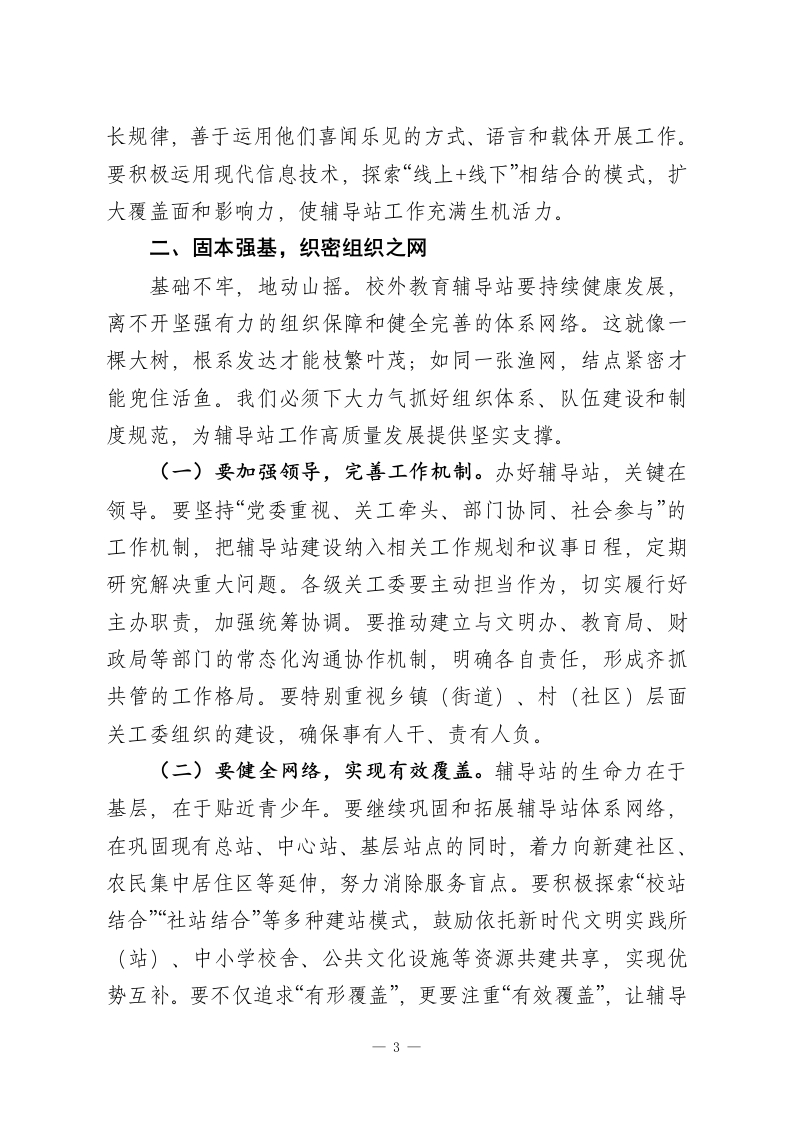 某市关工委主任在全市校外教育辅导站工作会议上的讲话同志们:刚才,我们顺利完成了全市校外教育辅导站工作会议的各项议程,传达了全省校外教育辅导站工作经验交流会精神,总结了近年来工作,分析了当前形势,部署了下一步任务。这次会议的主要目的是进一步统一思想、明确方向、凝聚合力,落实立德树人根本任务,研究部署工作,全力推进全市校外教育辅导站工作高质量发展。下面,我讲四点意见。一、铸魂育人,把稳思想之舵校外教育辅导站是青少年校外教育的重要阵地,是连接学校教育、家庭教育与社会教育的桥梁。做好辅导站工作,首要的是把准政治方向,筑牢思想根基,确保我们的事业始终沿着正确的航道前行。这就好比航行大海,没有罗盘就会迷失方向;建设高楼,地基不牢就会地动山摇。我们必须坚持从政治上看教育、从民生上抓教育、从规律上办教育,让辅导站真正成为党心民心交融、社情民意汇聚的坚强阵地。(一)要高举旗帜,强化政治引领。辅导站工作本质上是做人的工作,是做青少年思想引导的工作。必须始终将政治建设摆在首位,坚持用科学的理论武装青少年头脑,引导他们深刻认识时代责任和历史使命。要持续抓好主题教育活动,围绕重大节日、纪念日,设计开展形式多样、内容鲜活的教育实践,将爱国主义、集体主义、社会主义教育融入日常、做在经常。1