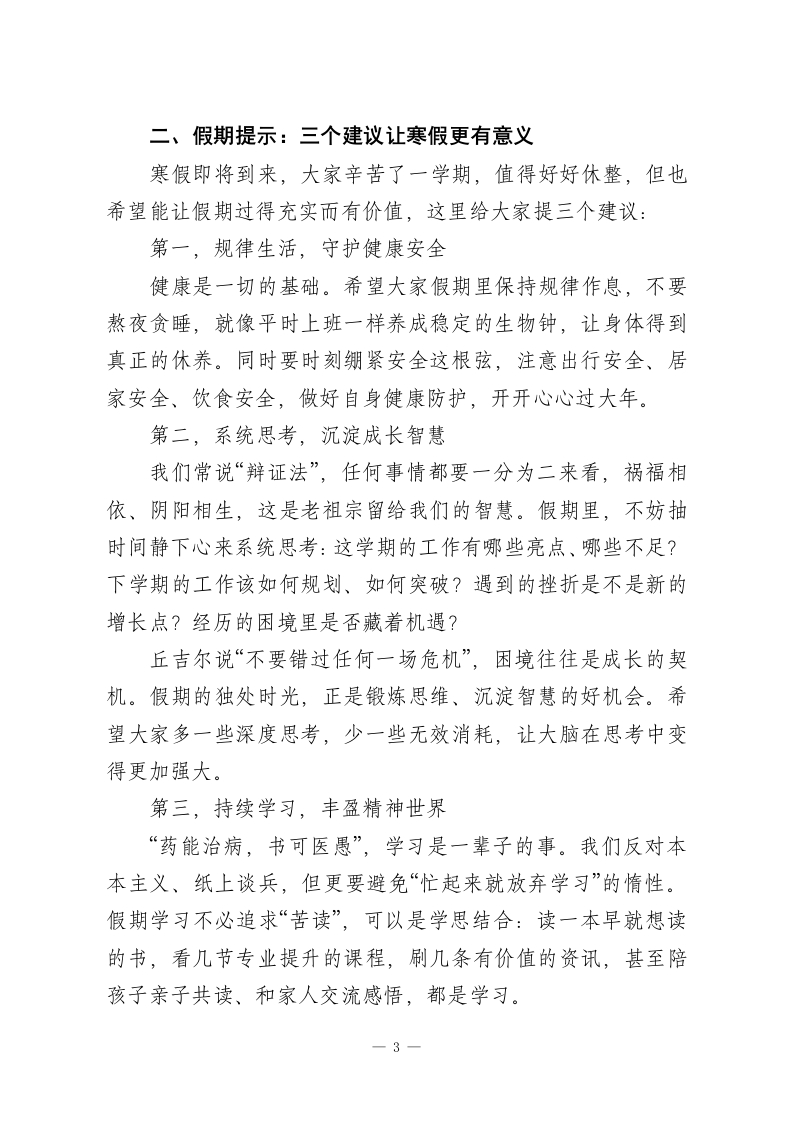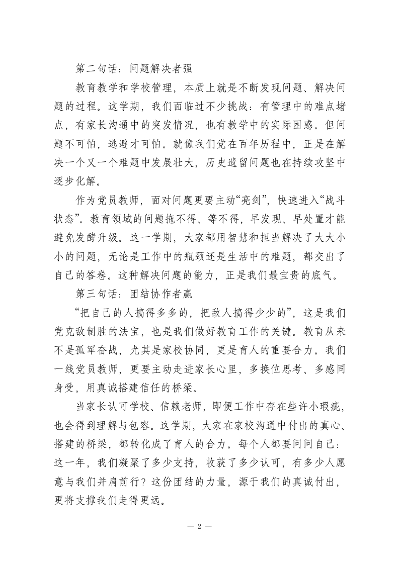 期末党员教师会议,主题党日活动上,校长党支部书记说话:入局者胜解题者强协作者赢同志们:岁月流转,这学期已近尾声。刚才大家的分享真挚务实、干货满满,很受启发。今天是期末的最后一次主题党日活动,也是春节前与大家的一次集中交流。这一年来,我们始终坚持常态化开展主题党日活动,凝聚了共识、锤炼了党性。今天我主要从“总结过往”和“假期提示”两个方面,跟大家分享几句心里话。一、总结这学期:三句话与大家共勉第一句话:躬身入局者胜做任何事,投入的状态决定最终的成效。我们对待工作,无非两种状态:一种是“心流状态”,备课钻研时全神贯注,策划活动时全力以赴,创作思考时沉浸其中,这种忘我的投入能让我们收获极致的成长与体验;另一种是“迷失状态”,被海量信息裹挟,刷短视频、聊闲天、东游西荡,看似忙碌实则毫无沉淀,难以进行深度思考。这一学期,大家躬身入局、真抓实干:认真带好一个班,深耕一门学科,管好一个团队,兼顾好家庭事务,在各自的岗位上沉浸式付出。这种全身心投入的状态,既是对工作的负责,也是对自己的成全,值得我们继续坚守。