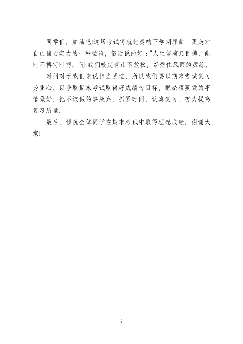 期末复习动员,校长国旗下讲话把不该做的事放弃,抓紧时间,认真复习,努力提高复习质量大家好!一个学期在不经意间又已匆匆逝去!今天是这个学期的最后一次升旗仪式了,同学将迎来本学期的最后一次考试,你们准备好了吗?其实考试对于我们并不陌生,经历了考试,我们获得了更多的知识。认真做好期未考试的复习,在掌握基本知识的基础上温故知新,拾遗补缺,注意复习方法,提高学习效率,争取取得优异成绩。在这个时候,大家是否也该认真问一下自己:在这段时间内,我的学习效果如何?上课认真听讲了吗?课后科学地复习所学的知识了吗?给自已制定合理的奋斗目标了吗?孔子日“学而时习之,不亦说乎温故而知新,可以为师矣。”仔细想想,这不是前人留给我们的经验吗?温习旧的知识,又能领悟到新东西,对我们的学习是很有帮助的。中国唐代书法家颜真卿也说过:三更灯火五更鸡,正是男儿发奋时。我想,我们可能没有足够大的能力来改变整个社会,但我们可以从自己做起,从改变自身的行为做起,从影响身边的人做起。与此相比,我们便知,那种怀有侥幸思想,闲时不烧香,急时抱佛脚,听天由命的做法是万万要不得的。