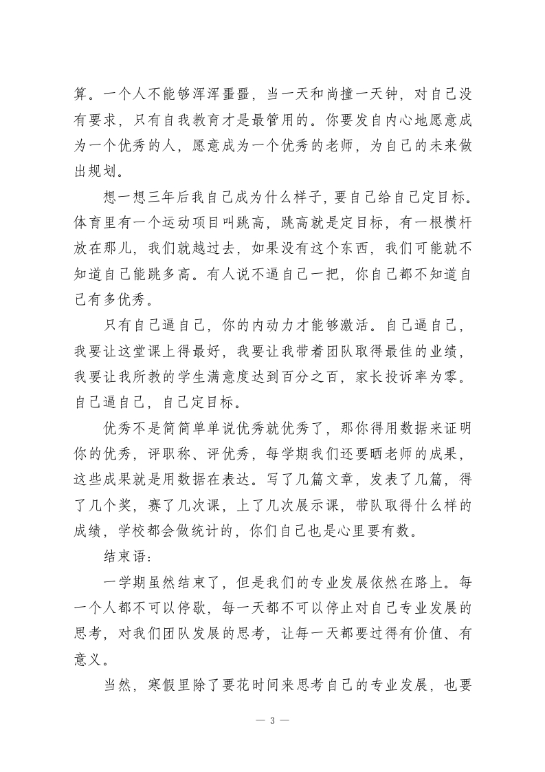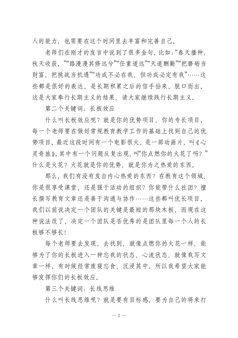 期末学科组教师会议,校长精彩讲话每一天都不可以停止对自己专业发展的思考,对我们团队发展的思考,让每一天都要过得有价值、有意义亲爱的老师们:“一叶荣华春秋意,如今回首费思量”,今天的总结会内容非常丰富,让我无限感慨。感谢大家分享这一学期我们共同经历的点点滴滴,分享你们的收获、你们的思考、你们的变化。今天你们的分享很精彩,这种做事的态度非常值得我们每一个人学习,包括我自己。下面跟大家分享三个关键词:第一个关键词:长期主义什么叫长期主义呢?就是做任何事情都不是随随便便的、临时性应付一下,而是长年累月用心付出。作为老师,长期主义就是一节课一节课认认真真准备,一个技能一个技能扎扎实实训练,一个字一个字去推敲琢磨。今天大家说到了很多,特别谈到了工作落地的问题。怎么样落地,那是需要一个长期的努力。未来三年我们能够取得什么样的成果,靠的是在座每一个人点点滴滴的付出。“合抱之木,生于毫木;九层之台,起于累土;千里之行,始于足下。”当我们有一个想法的时候,要立即去做,不要拖延,不要等待。每一个老师一定要信奉长期主义,持续不断地去做。有些事情没有做的,寒假里边抓紧时间去做。你需要提升你个