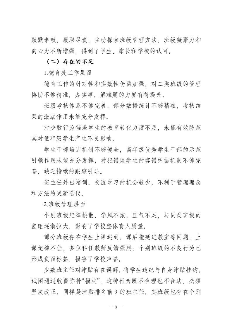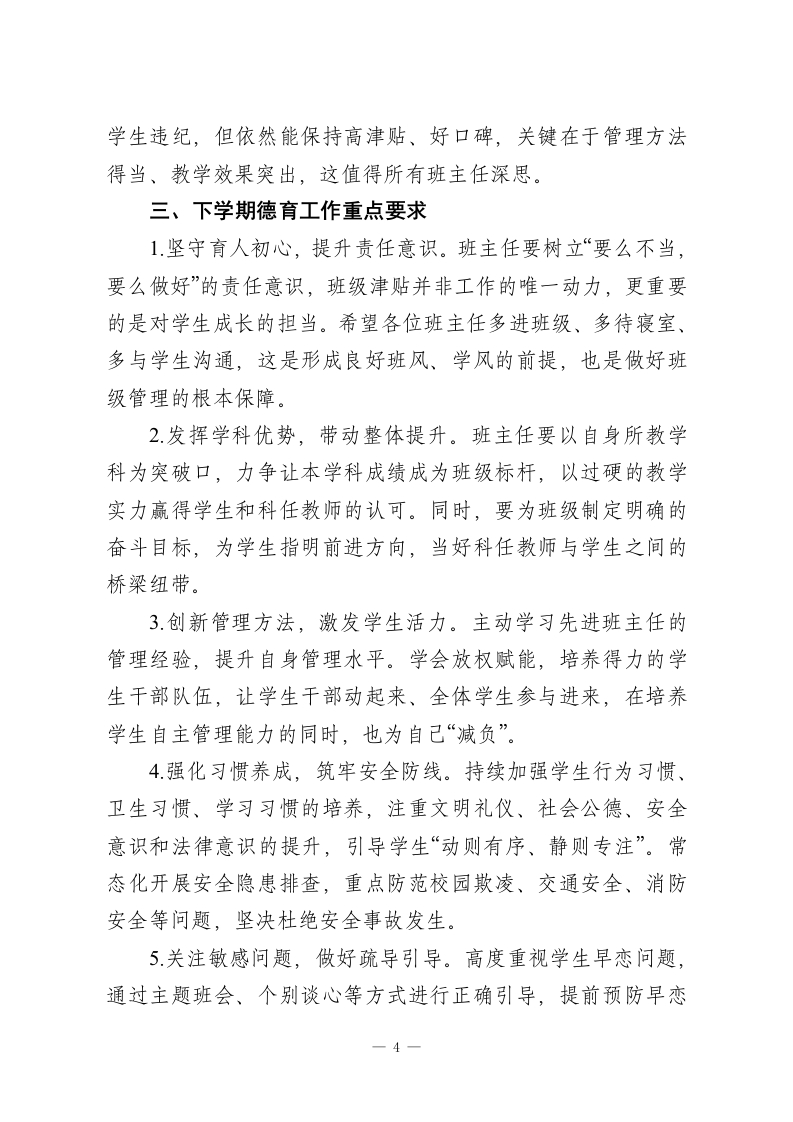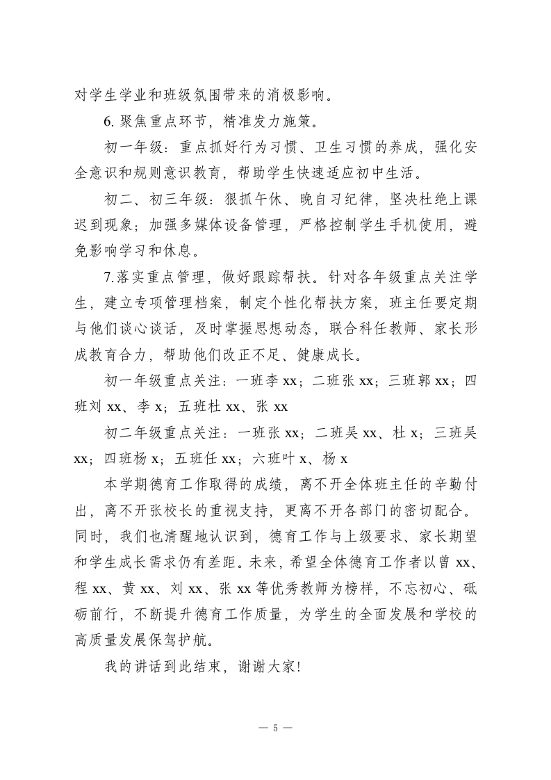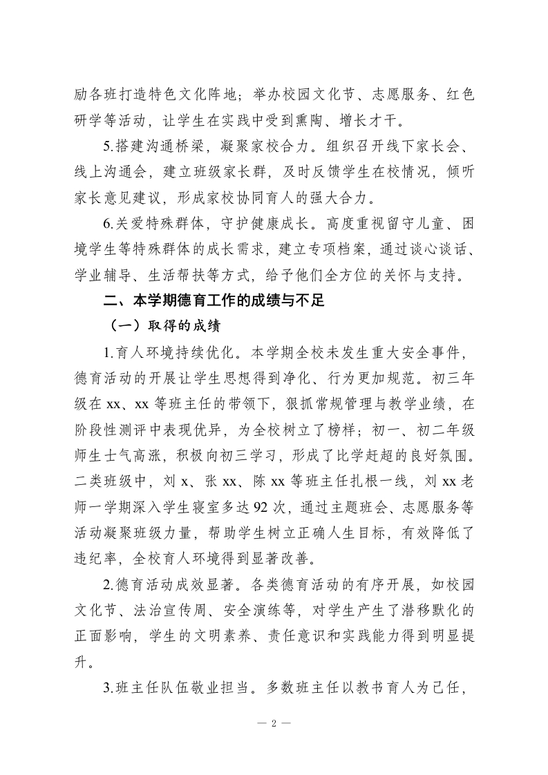 秋季第一学期德育工作总结暨下学期工作部署会德育副校长讲话:凝心聚力抓德育,砥砺奋进促成长老师们:大家好!本学期已近尾声,在学校的统筹领导下,在各部门的通力协作下,德育处围绕“立德树人”根本任务,聚焦学生行为习惯养成、班主任队伍建设、班级管理优化等核心工作,开展了一系列丰富多彩的德育活动,顺利完成了本学期各项德育目标。今天,我将从“主要工作回顾”“得失总结反思”“下学期工作部署”三个方面,与大家做详细交流。一、本学期德育工作主要开展情况1.筑牢思想根基,强化师德师风建设。始终将思想道德建设放在首位,通过专题培训、师德演讲、典型案例学习等形式,引导教师以身作则,践行育人使命,营造风清气正的育人氛围。2深化主题教育,提升学生综合素养。围绕法制、安全、“五爱”等核心主题,开展专题讲座、知识竞赛、主题班会等活动,增强学生的法律意识、安全防范能力和家国情怀。3.聚焦习惯养成,夯实成长基础。以日常行为规范检查为抓手,从文明礼仪、学习习惯、卫生习惯等方面入手,通过量化考核、榜样示范等方式,推动学生养成良好行为习惯。4.丰富德育载体,营造育人氛围。加强班级文化建设,鼓