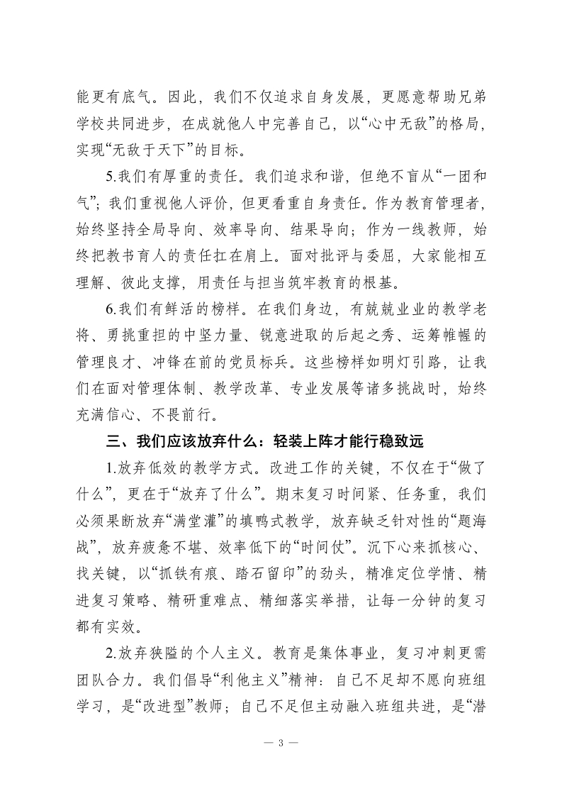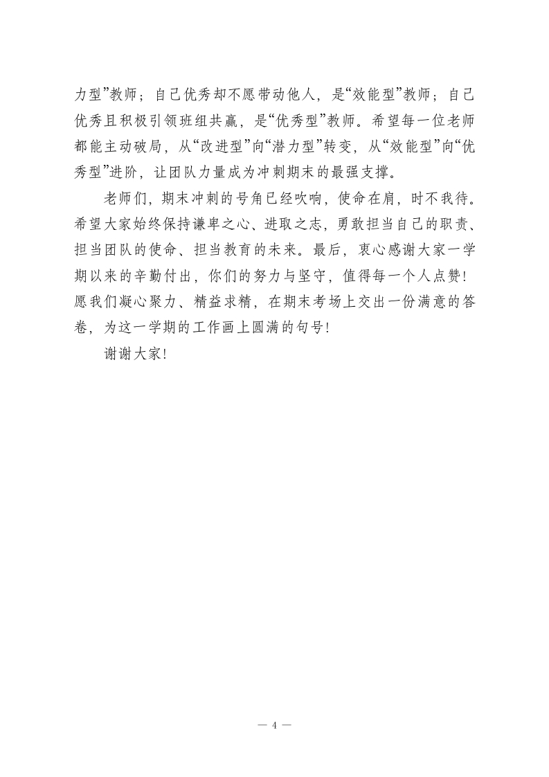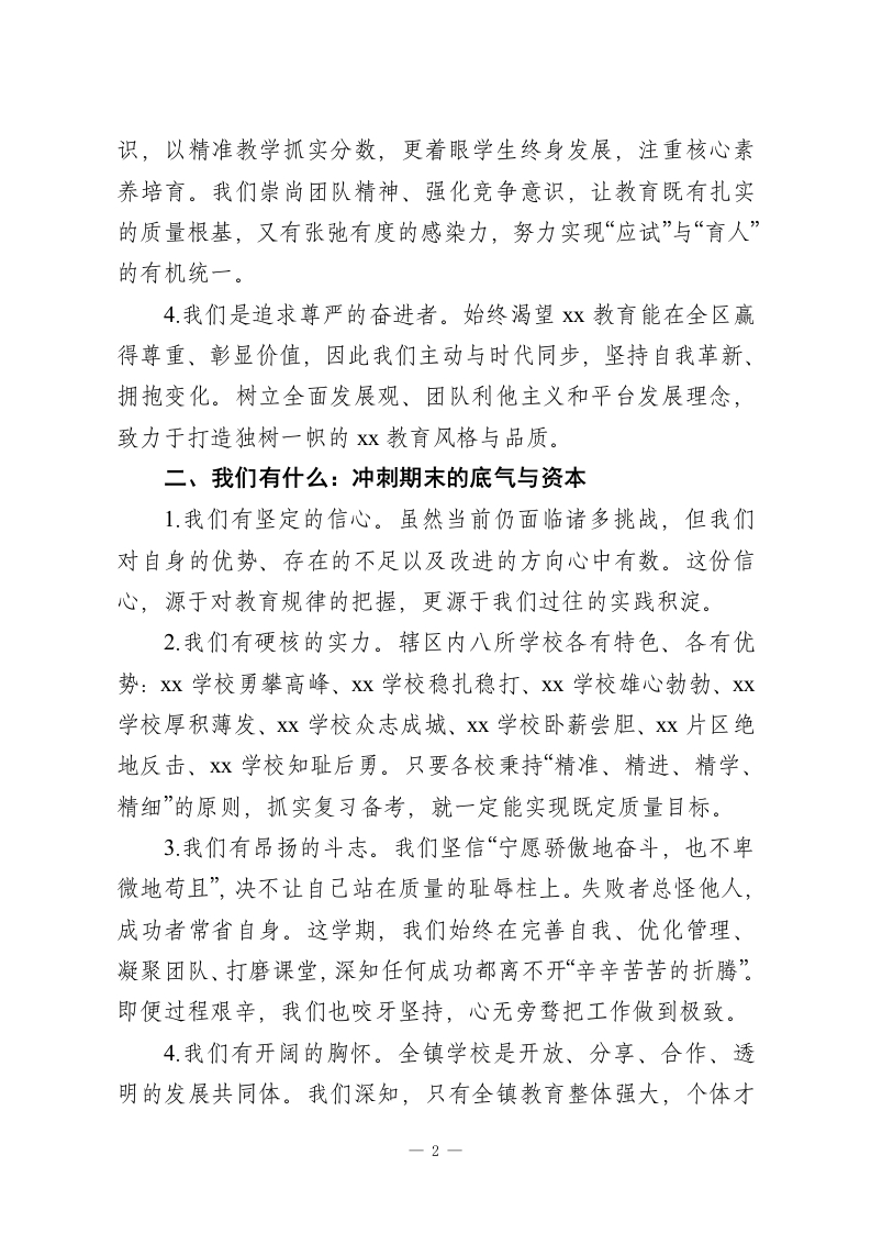 秋季第一学期期末复习冲刺动员教师会讲话:凝心聚力抓冲刺,精益求精创佳绩老师们:岁月不居,时光如流。转眼间,本学期已进入尾声,距离期末考试仅剩一个月时间。当前,全区教育系统正踔厉奋发、百舸争流,每一所学校、每一位教师都在负重前行、奋力拼搏。在这决战决胜的关键节点,我们没有理由懈怠,更没有资格“岁月静好”。今天,我想围绕“我们是什么、我们有什么、我们应该放弃什么”三个方面,与大家交流几点想法,既是动员也是共勉。一、我们是什么:一支有情怀、有担当、有追求的教育铁军1.我们是怀揣理想的追光者。心中有教育情怀,肩上有家国担当,始终保持策马奔腾、勇争第一的豪气与锐气。“马蹄教师精神”已内化为我们的集体共识,善良、仁爱、坚守的品质让我们充满感召力。我们勇于探索、乐于革新,在教育路上不断完善自我,用激情与愿景书写着属于xx教育的精彩。2.我们是敬畏事业的实干者。感恩时代赋予的教育使命,敬畏教育的未来与初心,始终保持反思与谦逊的态度。全校没有躺平、佛系、摆烂的懈怠者,即便偶有疲惫,也从未有人选择“混日子”。在困难面前,我们能吃苦、肯坚持,始终以集体人格的力量,向教育的深处探索,向质量的高峰攀登。3.我们是兼顾当下与长远的育人者。既尊重课堂、敬畏知1