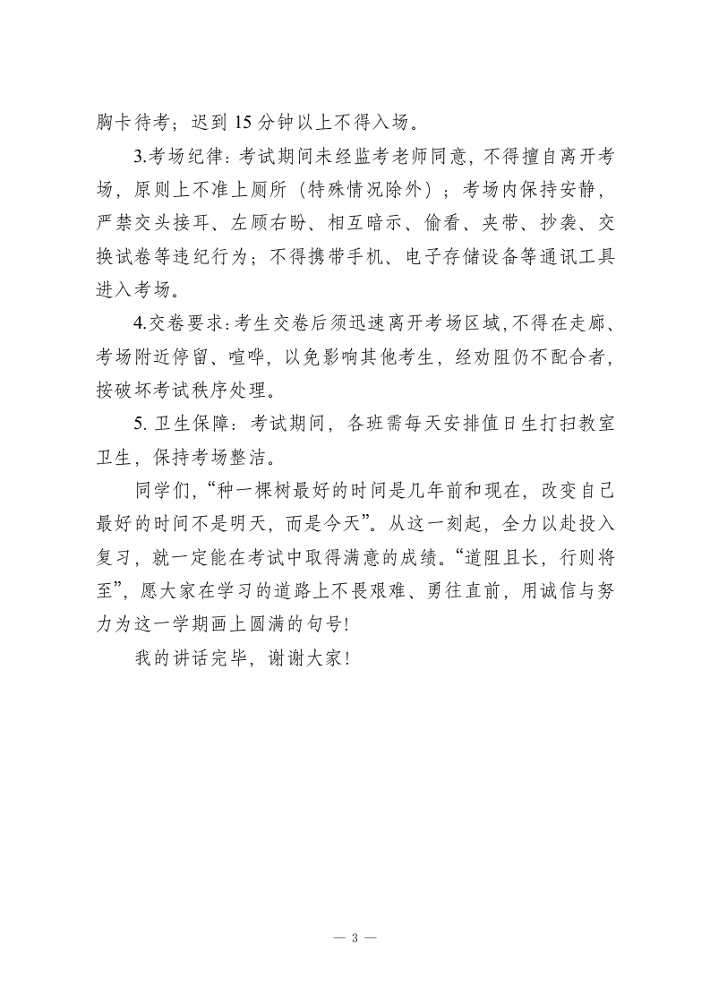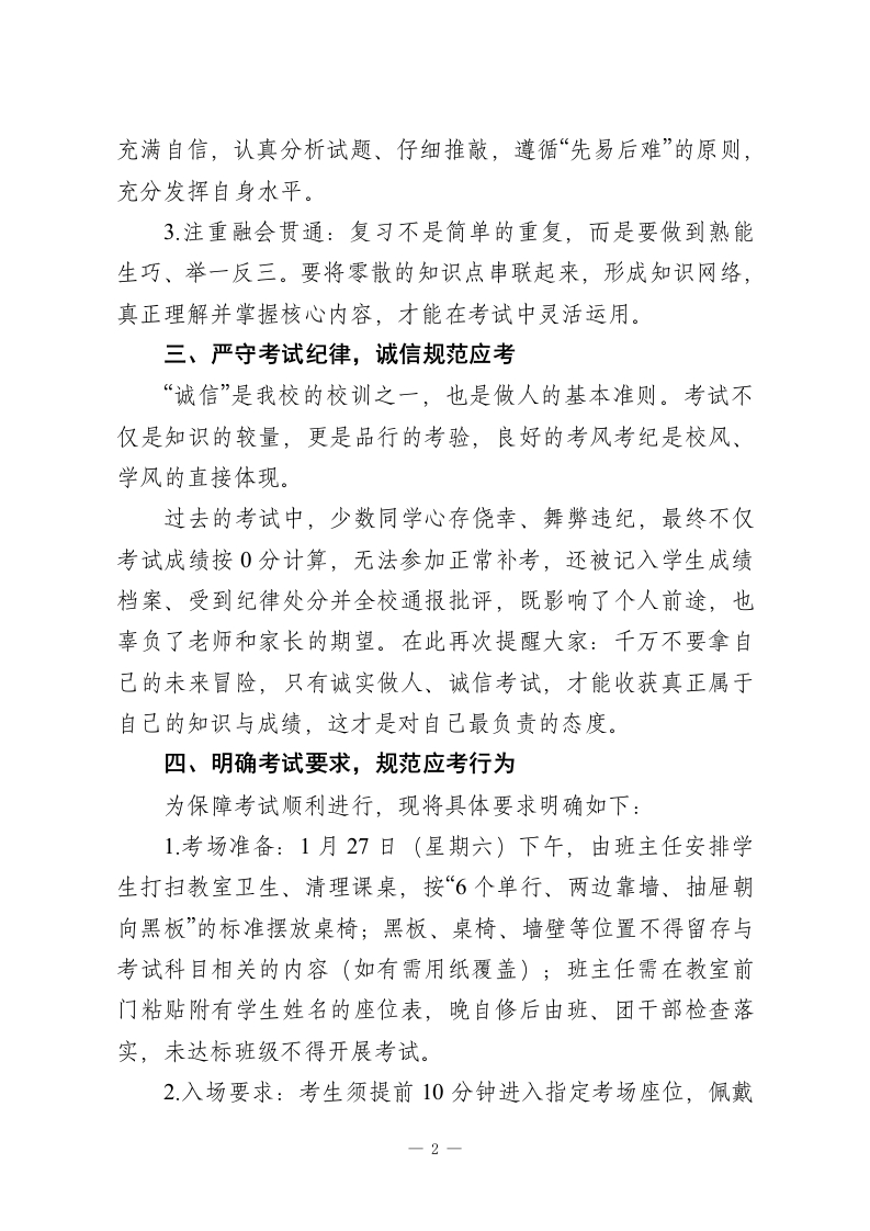 秋季第一学期期末复习考试动员校长讲话:把握当下勤复习,诚信应考启新程老师们、同学们:大家早上好!时光匆匆,本学期已进入第二十周,下周我们将正式迎来期末考试,本周起各考查科目也已进入最后一次测验阶段。在此关键节点,我想围绕考试安排、复习备考、考试纪律及具体要求,与大家做详细交流,希望能帮助大家高效冲刺、诚信应考。一、明确考试时间,做好时间规划本学期期末考试时间定于2026年1月26日(星期五)至1月27日(星期六),涵盖上下午多个场次。请同学们务必仔细核对各科考试时间,提前做好准备,避免因记错时间、迟到等情况影响考试。二、科学复习备考,高效冲刺提分“凡事预则立,不预则废”,期末复习时间紧、任务重,科学的规划是高效提分的关键。1制定可行计划:希望同学们在老师的指导下,梳理各科知识体系,将所学内容分类整理、系统复习,做到心中有数、有的放矢。针对薄弱环节重点突破,发现不懂的问题及时向老师、同学请教,切勿拖延。2.保持良好心态:既要重视考试,又不能过度紧张。考试既是对知识的检测,也是对意志的磨炼。考场上要沉着冷静、1