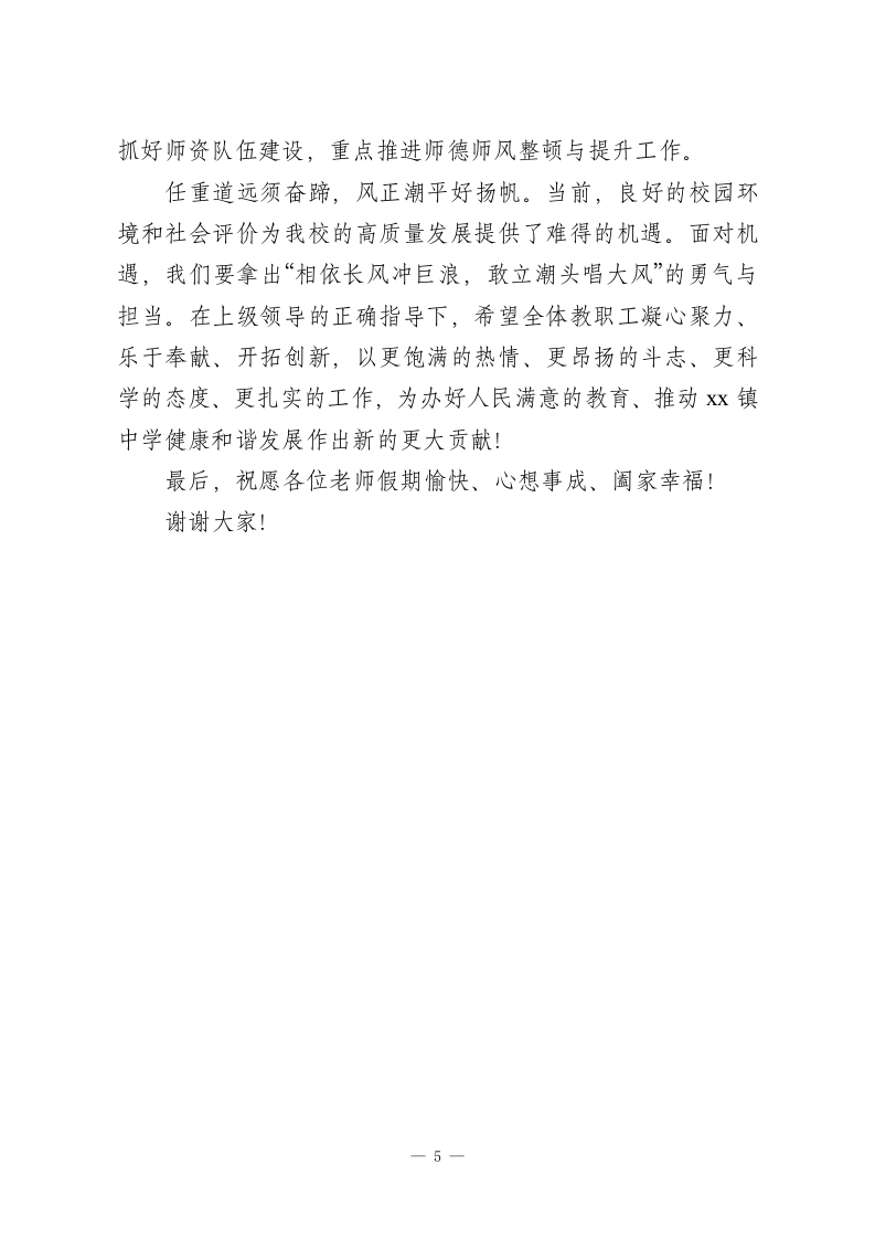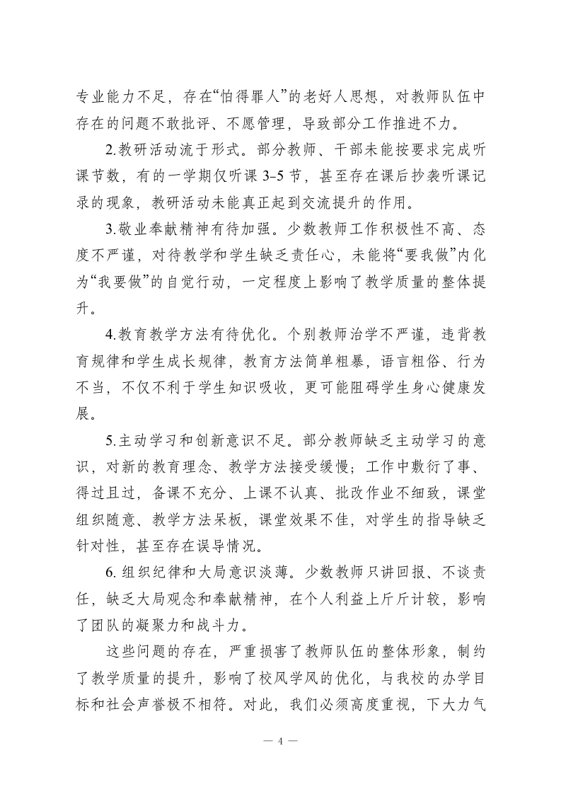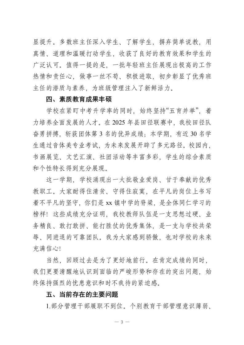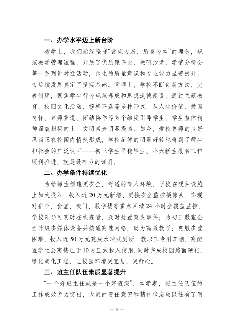 秋季第一学期期末教师大会校长讲话:总结过往凝共识,正视问题谋新篇各位老师:大家好!时光荏苒,本学期已近尾声。这一学期,我们全体教职工负重拼搏、团结协作,凭着对学生、对工作、对学校的高度负责,圆满完成并超额达成了学期初既定的各项奋斗目标。学校的内在凝聚力、办学活力持续增强,外部形象和社会口碑稳步提升,我们向领导、家长和社会各界交出了一份满意的答卷,为这一学期的工作画上了坚实的句号!回顾这一学期并肩走过的日子,我深知大家的辛劳与付出。除了完成繁重的教学任务,大家还全力配合学校落实各项阶段性工作,圆满完成了上级下达的各项指标。多少年轻老师顾不上照顾生病的孩子,多少中年老师无暇陪伴年迈的父母,还有老师带病坚守岗位…但大家始终坦然面对、认真履职,毫无怨言、任劳任怨。这正是教师职业道德最生动的诠释,也是学校不断发展进步的核心动力。所有成绩的取得,从来不是某个人的孤军奋战,而是我们这个集体同心协力的成果,是团队力量的最佳彰显。在此,我向大家致以最衷心的感谢:感谢大家对学校工作的全力支持,感谢大家对团队大局的坚定维护,更感谢大家对我个人工作的理解与包容!结合学校实际,我想和大家一同回顾本学期的亮点成绩,与大家共勉: