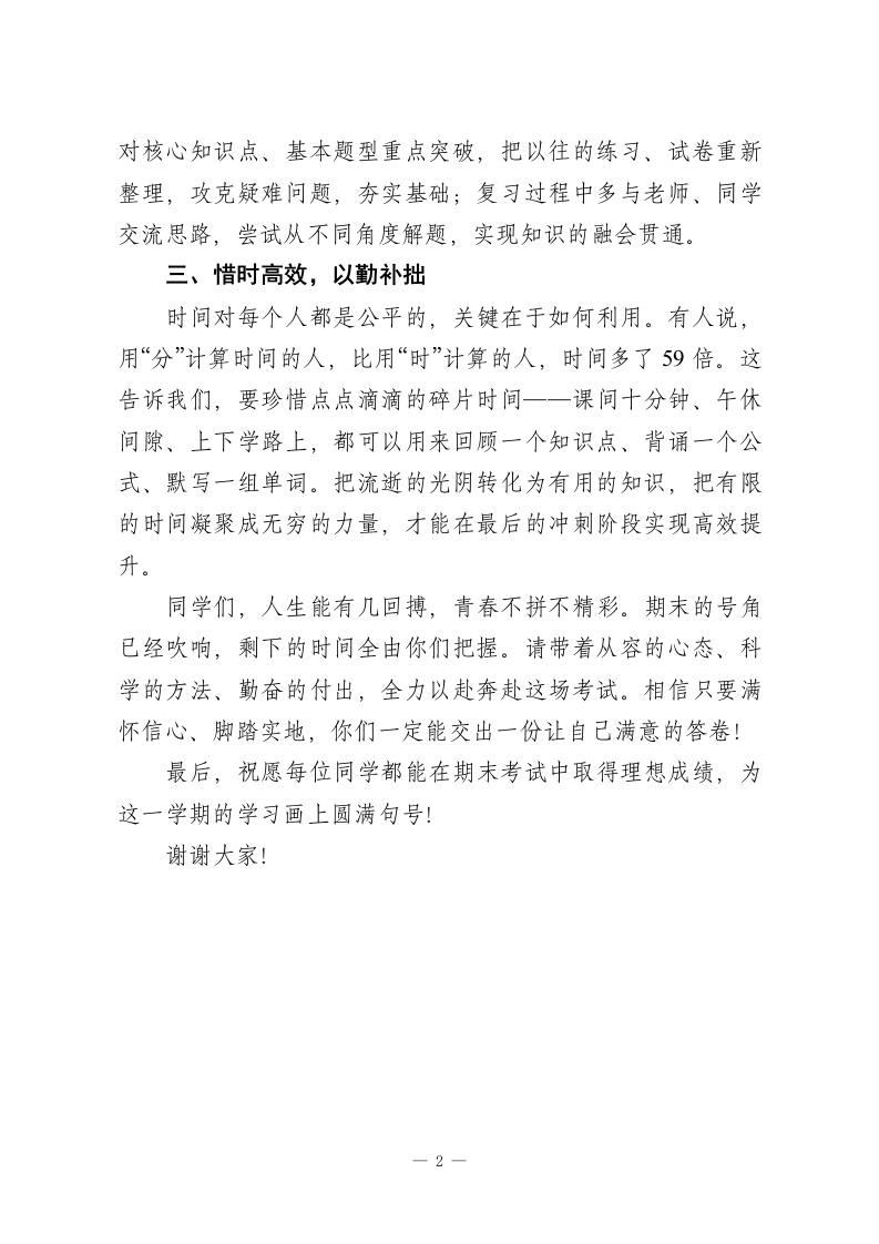 秋季第一学期期末考试复习迎考国旗下校长讲话:以从容之心,赴期末之考敬爱的老师、亲爱的同学们:早上好!迎着清晨的朝阳,我们踏入了2026年的第一个星期,也即将迎来期末考试的检验。这场考试,不仅是对一学期知识掌握程度的综合测评,更是对我们自信心、自觉性、意志力与诚信度的全面考验。我们未必人人都能成为顶尖的优胜者,但一定要做追求进步、超越自我的勇敢者。相信老师们已经为大家分享了不少复习妙招,今天,我想再和大家聊聊三点核心建议:一、从容自信,以稳应变考前适度紧张是正常的,但过度焦虑只会影响发挥。请大家调整好心态,用从容自信的状态迎接考试:考试前一晚,提前准备好笔、尺、橡皮等应考工具,早点休息,保证充足睡眠;进入考场后,深呼吸平复心情,拿到试卷先整体浏览,做到心中有数;答题时认真审题、规范书写,力求卷面整洁;做完后不要急于交卷,逐题细致检查,避免因粗心失分。从容应对,才能让自己的真实水平充分展现。二、科学规划,以实筑基“凡事预则立,不预则废”,扎实的准备是自信的底气。期未考试内容涵盖全学期知识点,复习时难免觉得千头万绪,这就需要我们做好科学规划:结合学科特点和自身情况,梳理知识框架,找准薄弱环节,制定针对性复习计划,做到有的放矢;1