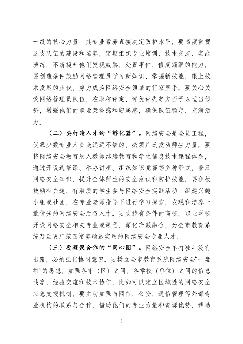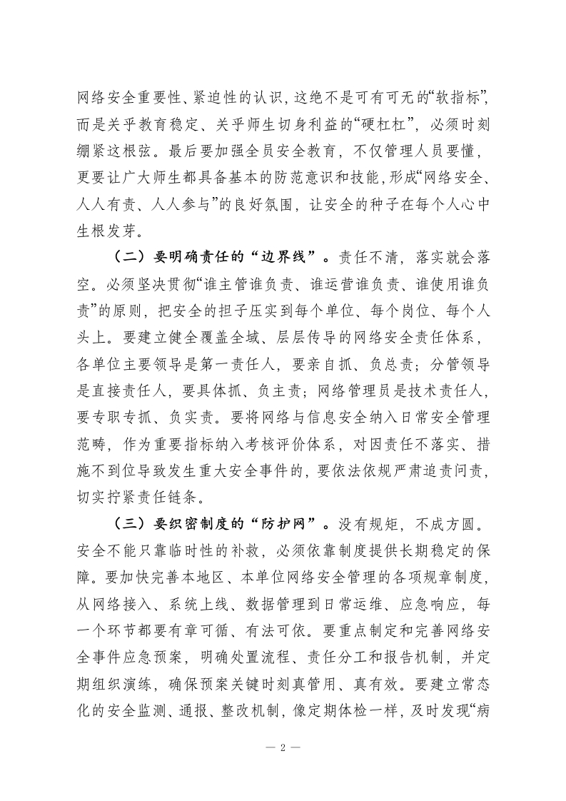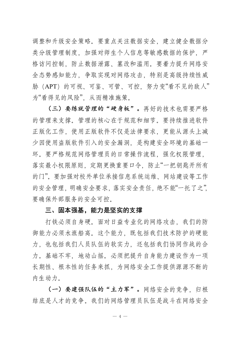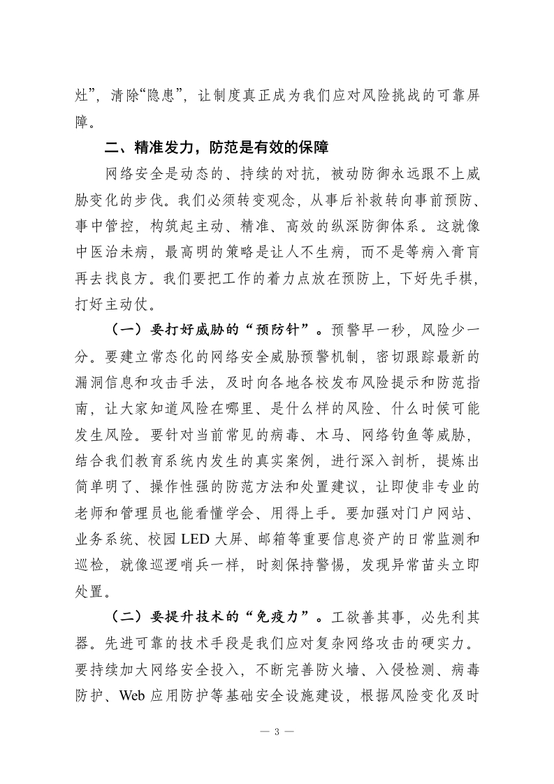 市教育局局长在全市教育系统网络安全管理工作会议上的讲话同志们:刚才,会议通报了近期网络与信息安全工作的总体情况,分析了当前面临的威胁态势,交流了实用的防范方法和处置建议,并就软件正版化、个人信息保护等专项工作进行了培训。这次会议的主要目的,就是要统一思想、明确任务、压实责任,共同筑牢全市教育系统网络安全的坚固防线。下面,我讲四点意见。一、坚守底线,安全是发展的前提网络安全是教育事业发展的基石,没有网络安全,教育信息化这座大厦就建不牢固,甚至可能顷刻崩塌。它和我们校园的物理安全同样重要,是绝对不能失守的阵地。我们必须深刻认识到,当前教育网络安全的形势严峻复杂,病毒、木马等威胁无时无刻不在窥探我们的漏洞,任何一丝侥幸心理、任何一点疏忽大意,都可能造成难以挽回的损失。因此,守好网络安全底线,是我们一切工作的基本前提,在这个问题上,没有折扣可打,没有退路可循。(一)要筑牢思想的“防火墙”。意识是行动的先导,思想上不设防,行动上就会漏洞百出。首先要解决“重建设、轻安全”的顽疾,绝不能认为信息化项目上了线就万事大吉,必须将安全理念贯穿于规划、建设、运行、维护的全过程,做到安全与信息化同步谋划、同步推进、同步落实。其次要持续深化对1-