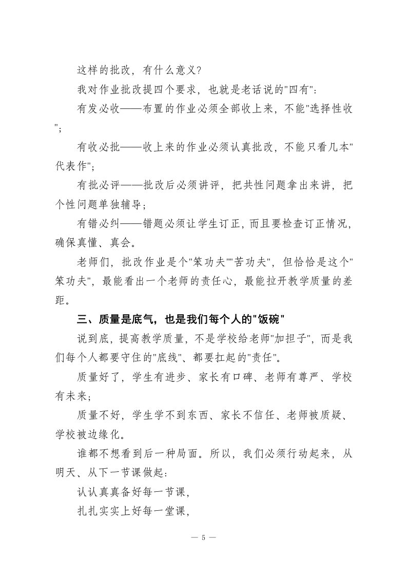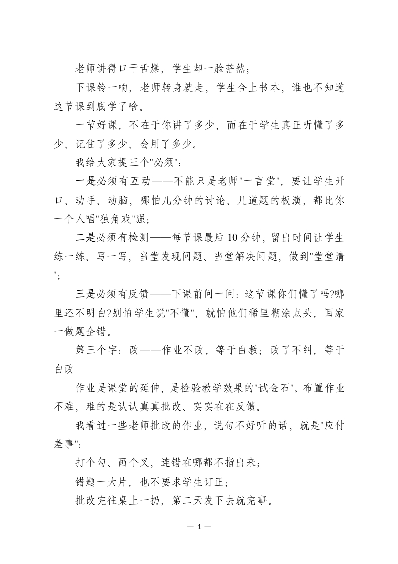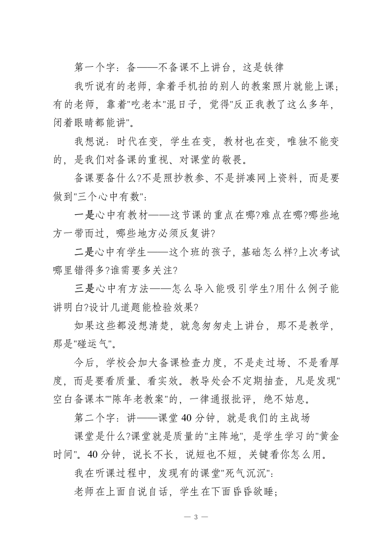 提升教学质量专题会议上,校长讲话:拿老教案糊弄新课堂,就是教育懒政!对不起学生也对不起自己!各位老师、同志们:大家下午好!今天把大家叫过来,专门开一个教学质量会,说实话我心里有点着急,有点上火。最近我推门听课听了好多节课,还和学生们、家长们聊了很多,发现了几个现象,让我既心疼又揪心。有些话憋在心里不舒服,今天一定要给大家讲清楚、说明白。开门见山,我把最狠的话撂在前面:不备课就上课,拿几年前的老教案照本宣科,这叫“凭经验教学”?这叫误人子弟!说得更难听点,就是拿孩子的时间、拿家长的信任在开玩笑!一、咱们先把实话说开:问题不是”不知道”,而是"不较真我知道,我们这个团队里大部分老师都是勤勤恳恳、辛苦辛苦的。早出晚归、带病上课、牺牲周末时间来辅导学生,这些我都看在眼里、记在心上。老师们,你们真的很不容易,学校感谢你们,家长也感激你们。但是话不能只说一半。我们也要正视另外一些让人不舒服的现象:有的老师,备课本上的字迹还是三年前的笔迹,PPT还是