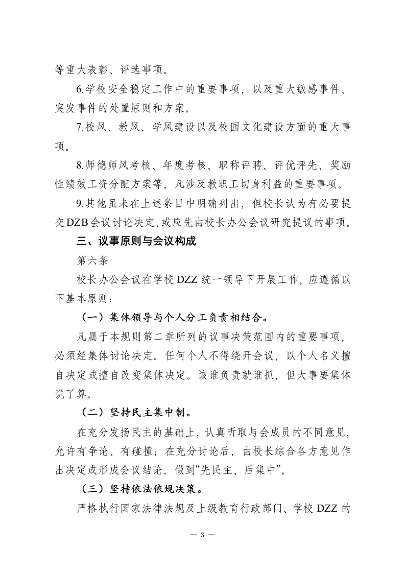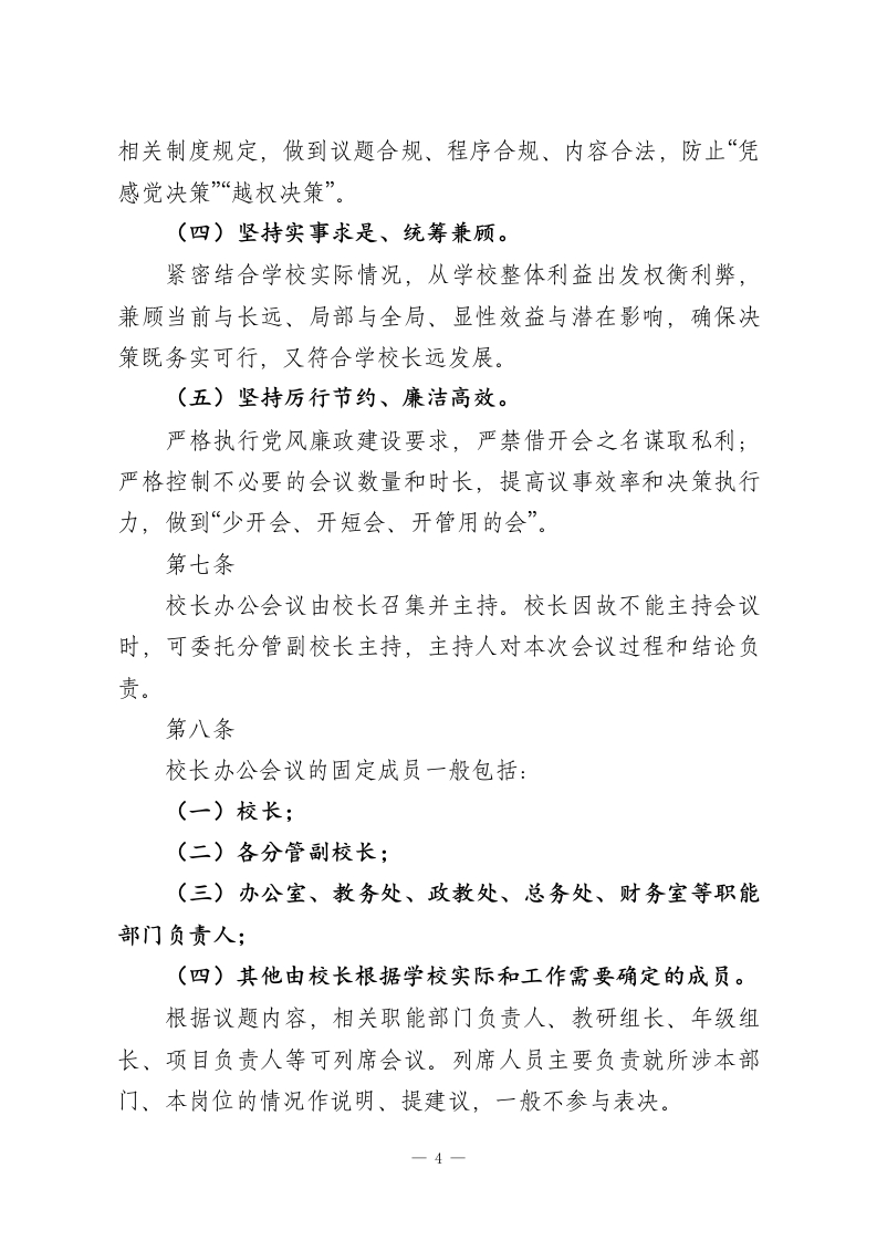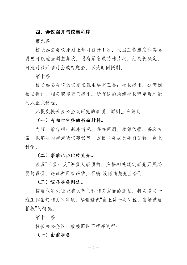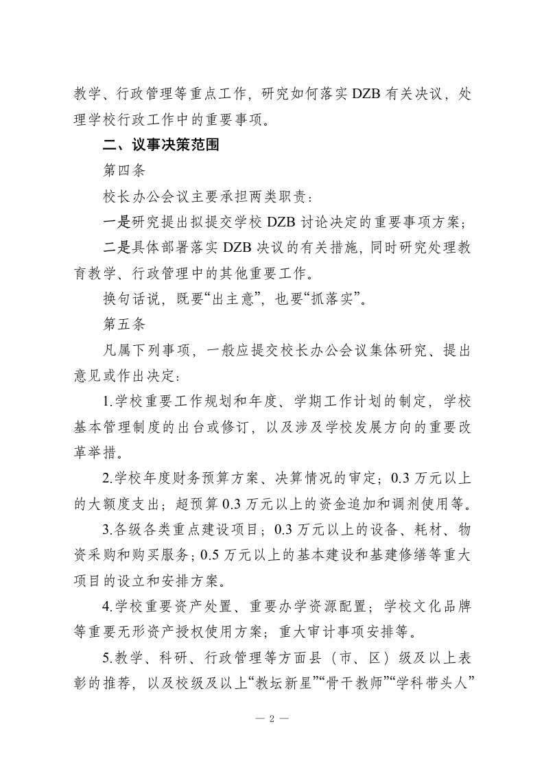 校长办公会议(校务会议)议事规则办事流程一、总则第一条为切实加强…,落实…的校长负责制,不断提升依法治校、科学决策、民主管理的能力和水平,推动学校行政管理更加制度化、规范化、流程清晰、效率更高,根据…等有关法规文件,结合学校实际,制定本规则。可以理解为:上面有大的制度框架,这里是我们学校校长办公会“怎么开、开什么、怎么定”的具体做法。第二条学校实行DZZ领导下的校长负责制。校长在学校DZB的领导下,依法依规行使职权,按照学校DZB的有关决议,全面负责学校教育教学、行政管理等各项工作。简单说,重大方向听DZZ的,具体工作由校长统筹负责。第三条校长办公会议是学校行政层面的主要议事和决策机构。开会的根本遵循是:坚持全面贯彻D的教育方针,坚持社会主义办学方向,落实立德树人根本任务,紧紧围绕学校改革、发展、稳定大局。通过科学决策、民主决策、依法决策,统筹推进学校教育1