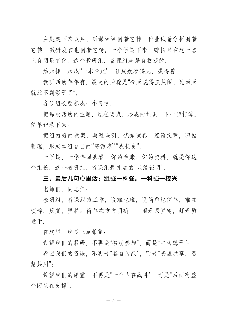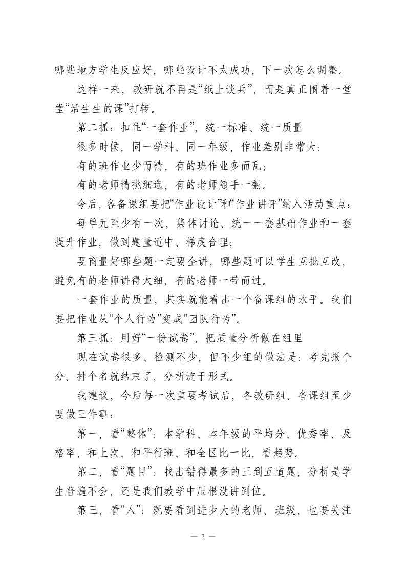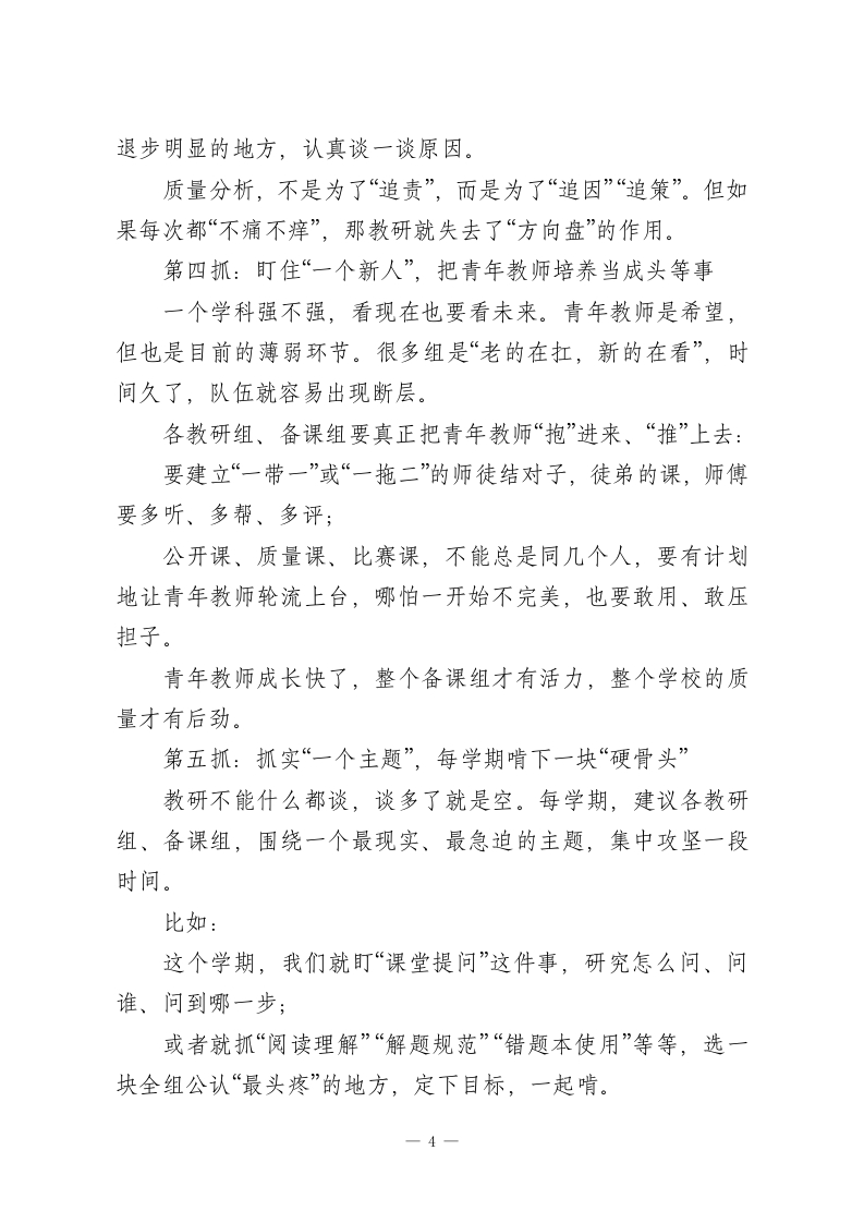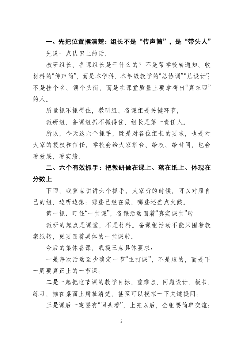 校长在全校教研组长、备课组长会议上的讲话:把教研从“会议室”拉回课堂的六个有效抓手!各位教研组长、备课组长、老师们:大家下午好!今天的会议标题写得挺正式,其实说到底就是想和大家坐下来,掏心窝子聊聊:我们的教研组、备课组,到底怎么样才能真正地“动”起来、“活”起来、“实”起来,不再是签到、开会、拍照,而是真正地对课堂有所帮助,对教学质量有所提升。我在楼道、办公室里也听过这样的话:“教研活动年年搞,开会文件堆成山,真正有用的不多。”虽然这话刺耳,但是也不是完全没有道理。我们的教研活动里,确实有“走过场、装样子”的情况:有的时候组长一个人讲,其他人低头玩手机:有的时候传达文件五分钟,闲聊半小时:有的时候每次都在讨论“下一次公开课谁来上”,讨论来讨论去,还是那几个人。今天,我不想再给大家灌一堆概念,也不想把责任都往你们身上压。我就换个角度,从“怎么干才更有用”的角度,跟大家说说我心里想抓的六个“实在抓手”。这六个抓手,如果我们真能盯住、抓紧、做到,我相信,教研活动一定会不一样,教学质量也一定会不一样。一1