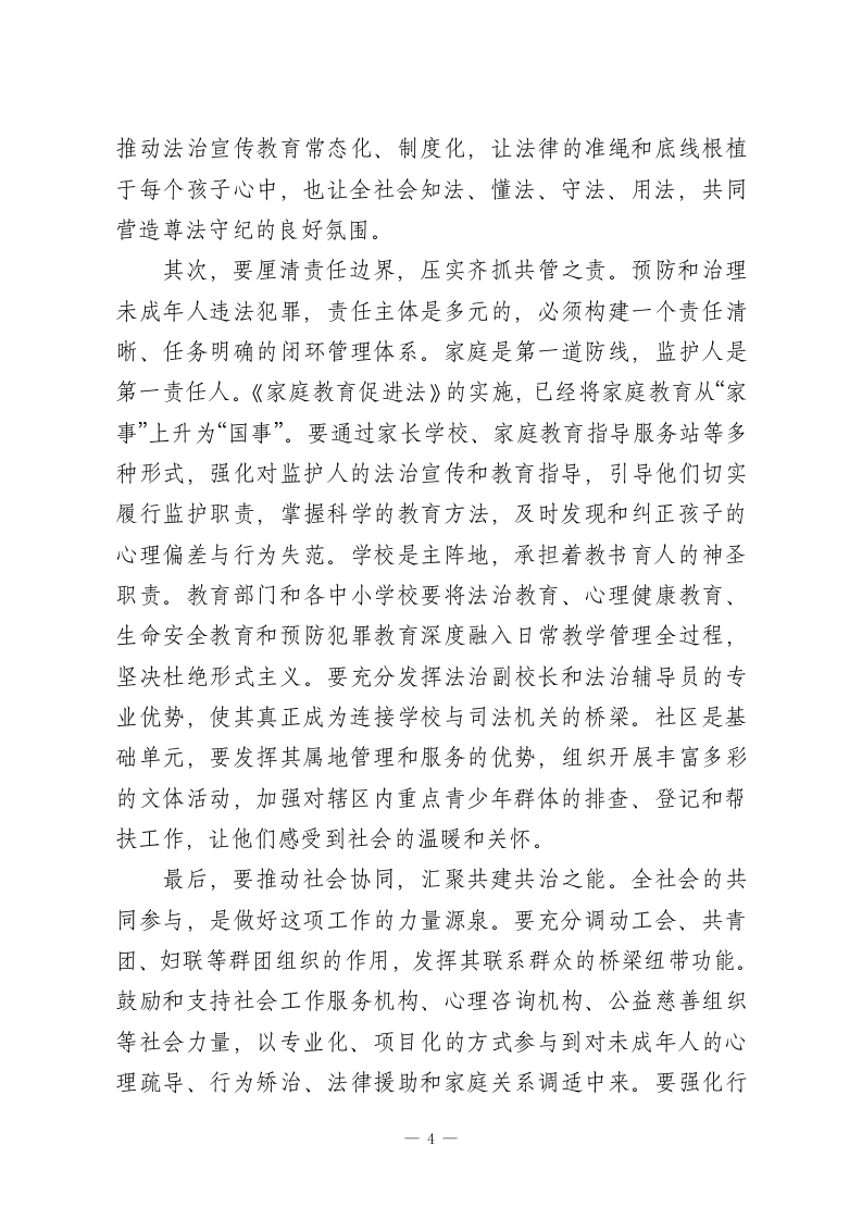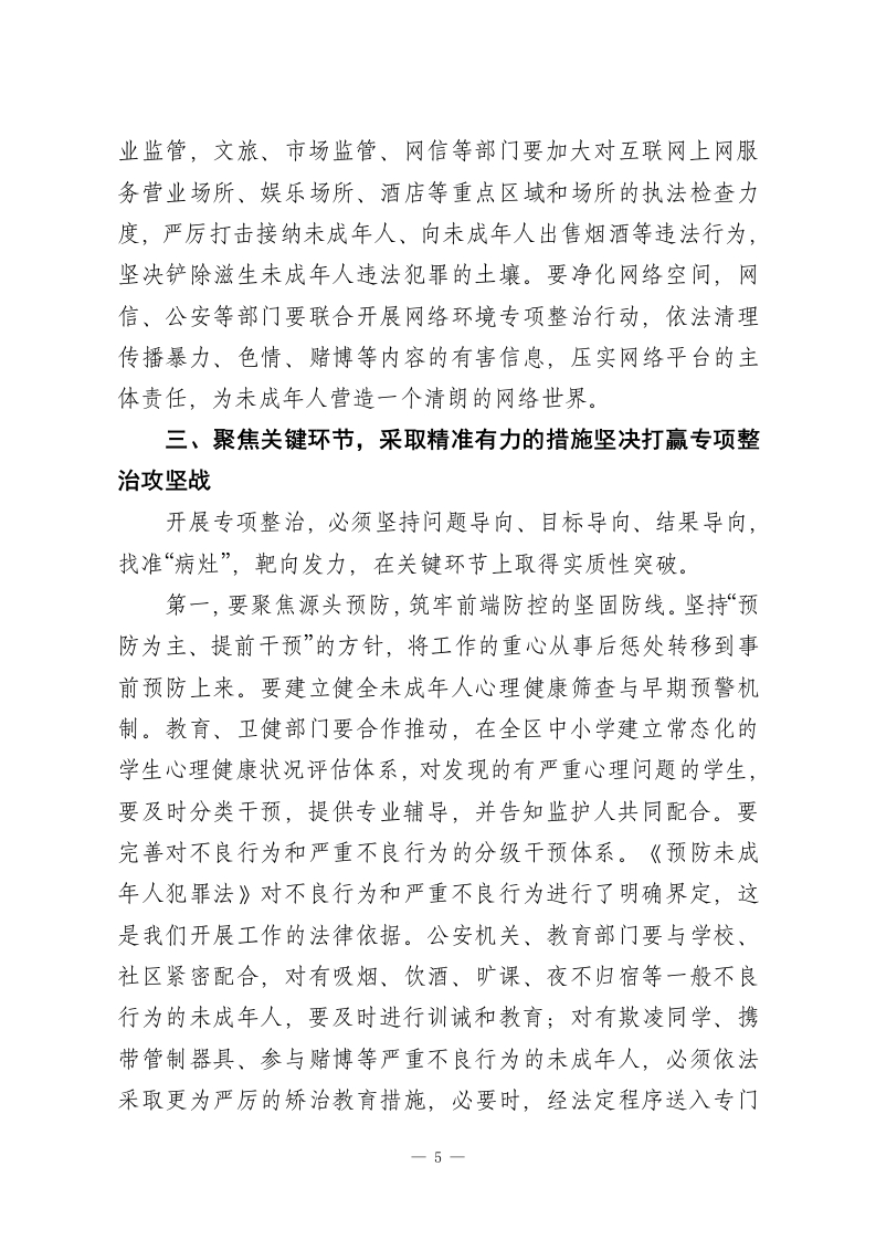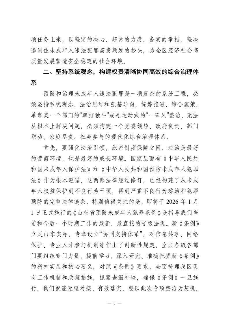 在XX区未成年人违法犯罪专项整治工作会议上的讲话同志们:今天我们召开这次全区未成年人违法犯罪专项整治工作会议,主要任务是深入分析当前我区面临的严峻形势,查找工作中存在的短板与不足,研究部署下一阶段全区加强和改进未成年人违法犯罪预防与治理的重点工作。刚才,XX分局、XX院、XX院的负责同志分别从各自职能角度,深刻分析了当前形势,提出了很好的意见建议,我都赞同,请大家在工作中认真抓好贯彻落实。下面,我再讲三点意见。一、正视严峻挑战,深刻认识新时代未成年人保护与犯罪治理的极端重要性未成年人是国家的未来、民族的希望。做好未成年人违法犯罪的预防和治理工作,不仅关系到每一个家庭的幸福安宁,更直接关系到社会大局的和谐稳定与国家长治久安的根基。近年来,区委、区政府始终将未成年人保护工作摆在突出位置,各相关部门履职尽责、协同配合,社会各界广泛参与、积极作为,构建了具有我区特色的防护体系。例如,检察机关牵头探索建立的“点线面”三位一体保护路径,通过组建专业化未检办案队伍、打造“一站式”办案救助中心、联动多方力量搭建社会化救助平台等方式,在实践中取得了良好成效,为保护未成年人合法权益、预防和减少犯罪发挥了积极作用。在肯定成绩的同时,我们必须清醒地看到,当前我区未成1
