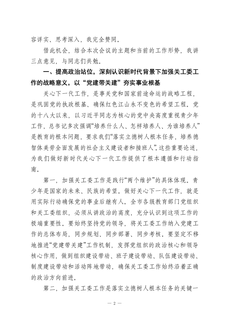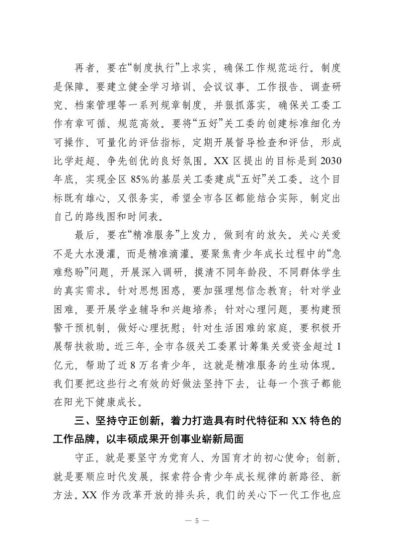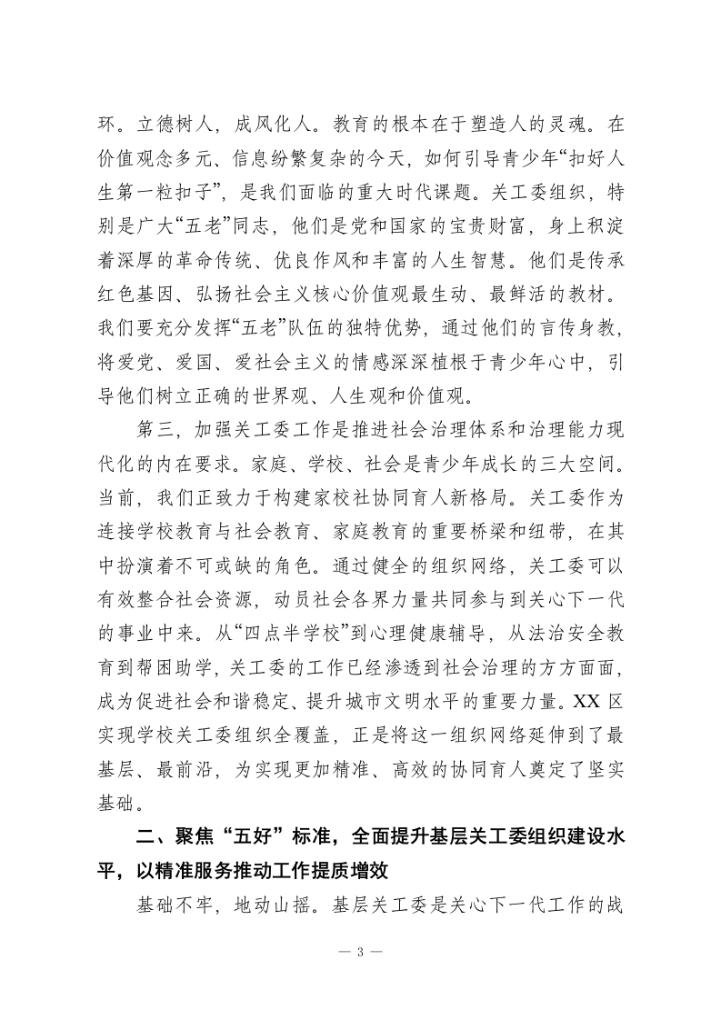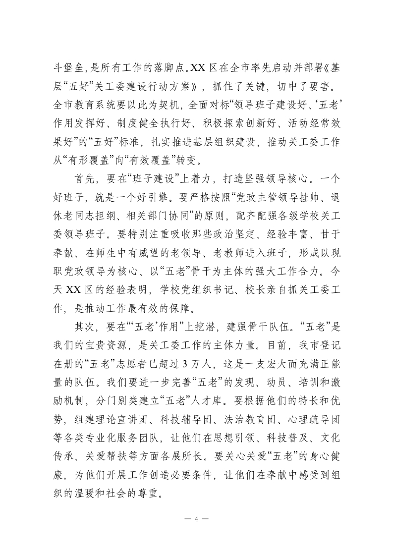 在XX市教育系统关工委工作现场会上的讲话同志们:今天,我们怀着对下一代成长的深厚情感和沉甸甸的责任,在此隆重集会,共同召开XX市教育系统关工委工作现场会、XX区教育系统关工委工作会议以及“五好”基层关工委建设工作培训会。这次会议,既是过去一段时间以来,特别是XX区教育系统关工委工作成果的一次集中检阅和经验交流,更是面向未来,对标更高要求,全面深化我市关心下一代事业高质量发展的一次思想动员和行动部署。首先,我代表XX市委、市政府,向长期以来辛勤耕耘、无私奉献在关心下一代工作战线上的广大“五老”同志、教育工作者和各级关工委干部,致以最崇高的敬意和最诚挚的感谢!刚才,我们共同见证了XX区教育系统关工委组织全覆盖的揭牌仪式,这不仅是一个简单的仪式,更是一个庄严的宣告。它标志着XX区在全市率先实现了197所公民办中小学关工委组织的百分之百覆盖,为全市教育系统关工委的组织建设树立了标杆,提供了宝贵经验。这一刻,我们筑牢了关心下一代工作的组织基石,推动这项事业迈入了体系化、网络化、专业化的崭新发展阶段。同时,XX同志系统解读了“五好”基层关工委的建设方案,XX同志、XX同志分别代表XX区教育局党组和区关工委作了很好的发言,XX同志的讲话更是为我们下一步的工作指明了方向,提出了殷切期望。大家的发言准备充分、内1