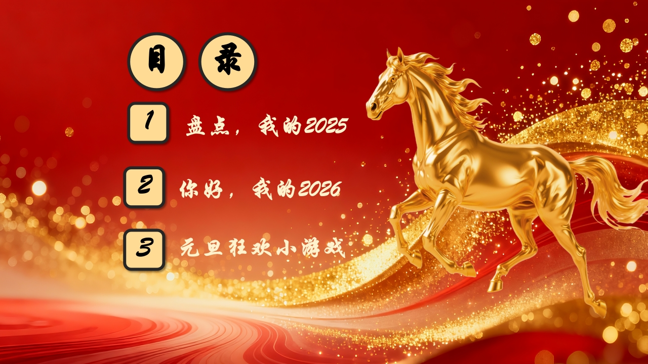 2026马年元旦主题联欢晚会:一马当先,元旦同欢tangqi883小时前发布关注私信24.95MB48页04015 第1页 / 共48页 第2页 / 共48页 第3页 / 共48页 第4页 / 共48页 第5页 / 共48页 试读已结束,还剩43页,您可下载完整版后进行离线阅读 2026马年元旦主题联欢晚会:一马当先,元旦同欢此内容为付费资源,请付费后查看¥9.9¥19.9VIP会员免费立即购买您当前未登录!建议登陆后购买,可保存购买订单付费资源© 版权声明本站是一个信息分享及获取的平台,不确保部分用户上传资料的来源及知识产权归属,资料由老师投稿,公开渠道整理,网友上传,如果侵犯到您的权益,请联系客服删除THE ENDPPT课件 文本预览 2026新年伏乐马当先ITE AND FORGE AHEAD元旦同欢再见2025,你好20261 查看更多 收起部分 喜欢就支持一下吧点赞15 分享QQ空间微博QQ好友海报分享复制链接收藏