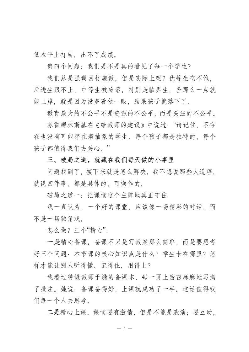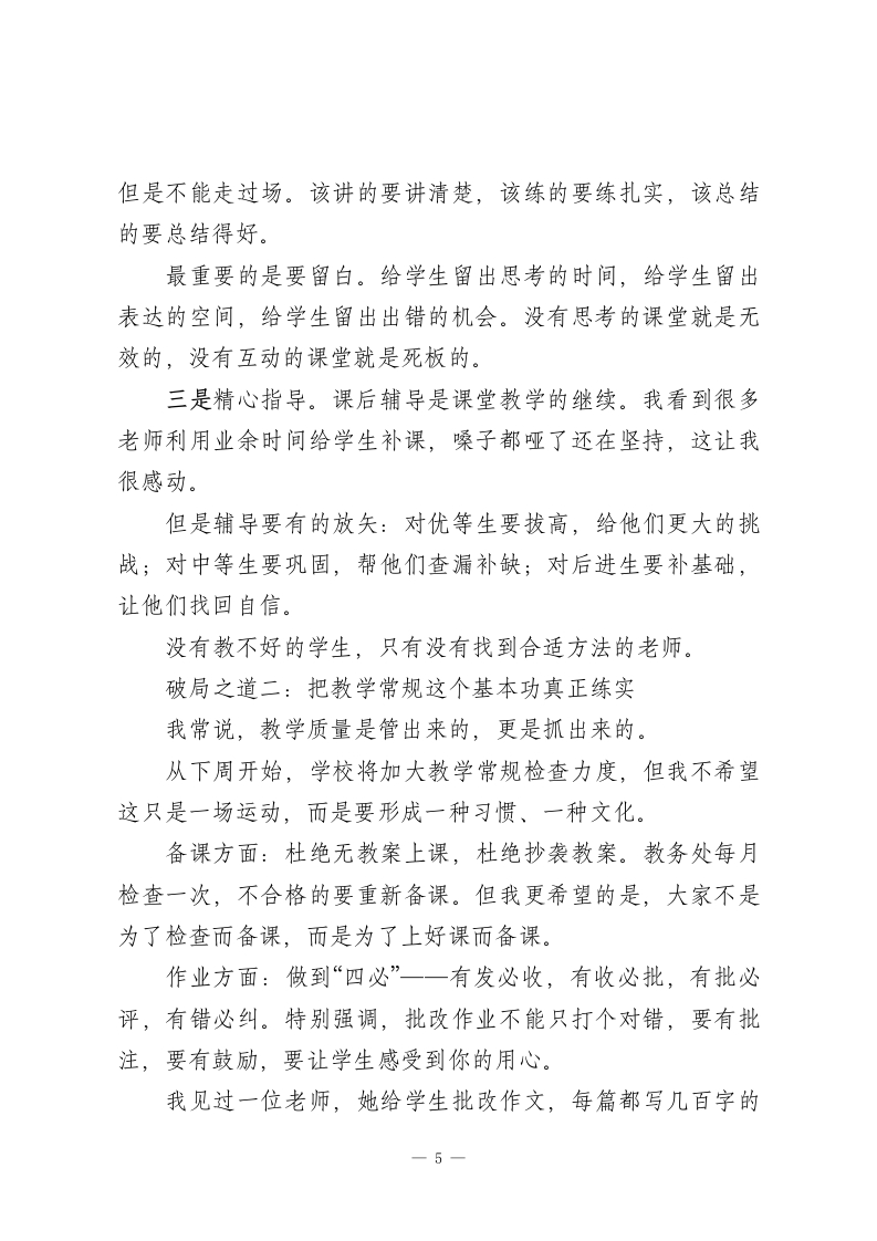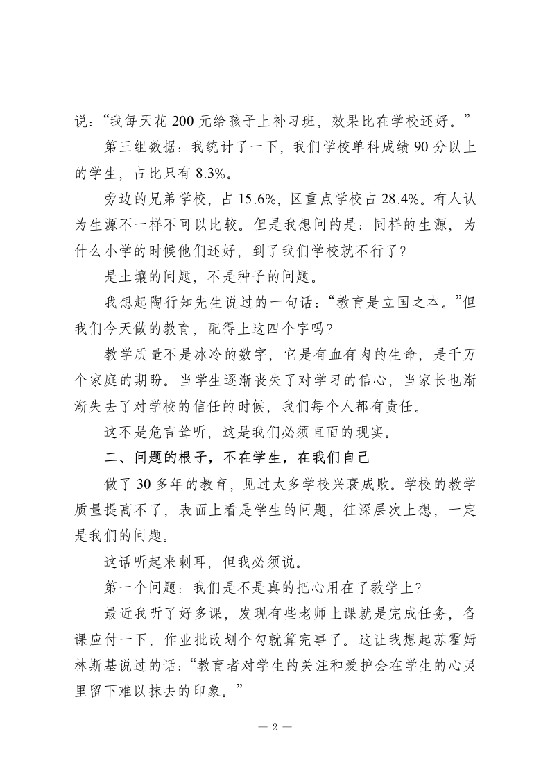 137名学生总分不到300分,质量分析会校长拍案而起:“是土壤出了问题!”附4个破局之道各位老师好!今天我们召开全校教学质量分析会,目的很明确,就是要把脉问诊,找出问题,对症下药,提高教学质量。刚才几位主任、年级组长就本学期的教学情况做了详细的分析,数据详实,问题找得准,措施也很具体,听后很有启发。下面我结合学校的情况谈几点看法。一、数据背后,藏着我们不愿面对的真相先说几个数字。第一组数据:我们学校有137名学生,这次期中考试总分不到300分。300分是怎样的水平?也就是说每科平均只有40多分。孩子们坐在教室里听讲,但是感觉好像在另一个世界里一样。他们的眼神告诉我:老师讲的我听不懂;听不懂的越积越多;越积越多就越不想听了。这是一个恶性循环,而我们正在眼睁睁看着它发生。第二组数据:本学期开学到现在,我们收到了23次家长投诉教学质量的电话。去年同期只有8次。投诉的内容有:老师上课照本宣科、作业批改不认真、孩子的问题没人管。有一位家长直言不讳地1