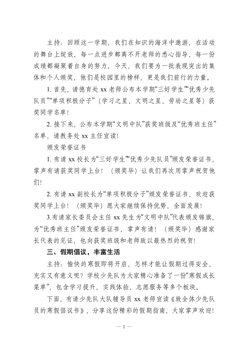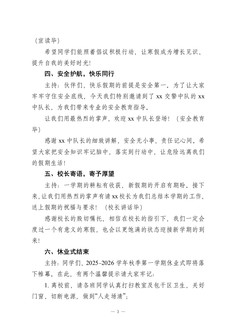 2025-2026学年秋季第一学期学生休业式主持词时间:2026年1月X日地点:学校操场主持:xx(女)参加人员:全校师生、家长代表一、主持人宣布休业式开始尊敬的家长代表,敬爱的老师们,亲爱的同学们:大家上午好!我是主持人Xx。冬日的阳光温暖明亮,一学期的书香萦绕心间。当课堂上的琅琅书声暂歇,当作业本上的字迹画满句号,我们终于迎来了期盼已久的寒假。今天,我们欢聚在操场,带着一学期的收获与成长,隆重举行2025-2026学年秋季第一学期休业式。首先,进行庄严的升旗仪式,请旗手做好准备!(稍作停顿)下面我宣布:1.2025-2026学年秋季第一学期休业式升旗仪式现在开始,全体立正!2.出旗,奏乐!(待旗手就位)3.升国旗,奏唱国歌!全体行注目礼,少先队员行队礼!4.礼毕,请坐下!二、表彰先进,见证成长-1