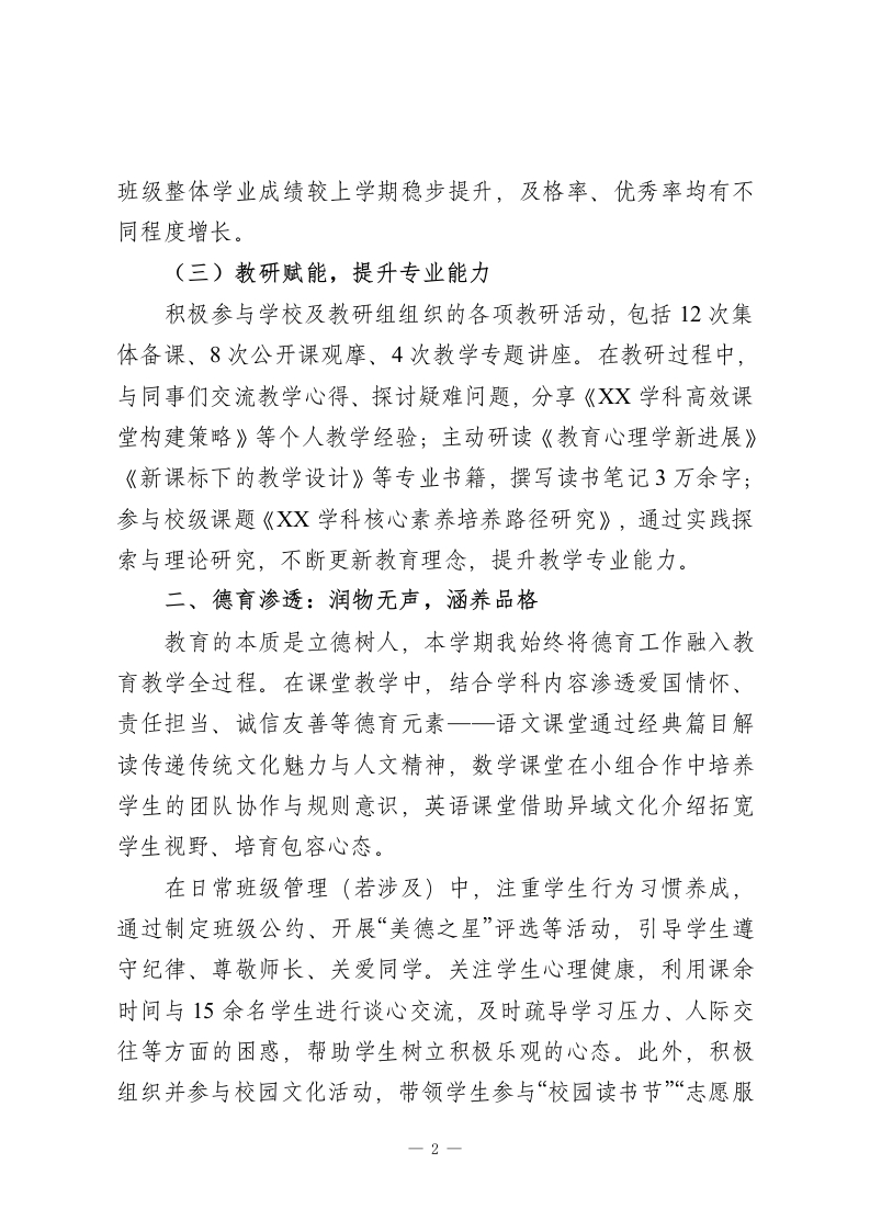 2025-2026学年秋季学期教师期末工作总结:以马年奋进之姿,践立德树人初心本学期已近尾声,值此2026新春将至之际,我对本学期的教育教学、班级管理、个人成长等工作进行全面复盘总结,既梳理收获与亮点,也正视不足与短板,为新学期工作蓄力赋能。一、教育教学:深耕课堂,提质增效(一)精准备课,优化教学设计本学期,我始终秉持“以生为本”的教学理念,立足教材与新课标要求,结合学生认知规律与学情差异,开展精准化备课。课前深入研读教材、教参及前沿教学案例,明确每节课的核心目标与重难点;课中采用情境教学、小组合作、问题驱动等多样化教学方法,打破传统课堂的沉闷氛围,激发学生主动参与的积极性。针对不同层次的学生,设计分层任务与练习,让基础薄弱的学生夯实根基,让学有余力的学生拓展提升,确保课堂教学“因材施教”。(二)注重反馈,强化课后落实课后及时批改作业与练习,建立“错题档案”,精准捕捉学生知识漏洞与易错点,通过课堂讲评、个别辅导等方式针对性答疑解惑。本学期共开展4次阶段性检测,每次检测后均进行全面数据分析,梳理班级整体薄弱环节与学生个体问题,调整后续教学策略。同时,利用课后服务时间为学生提供个性化辅导,累计辅导时长超80小时,帮助20余名学生攻克学习难点,1