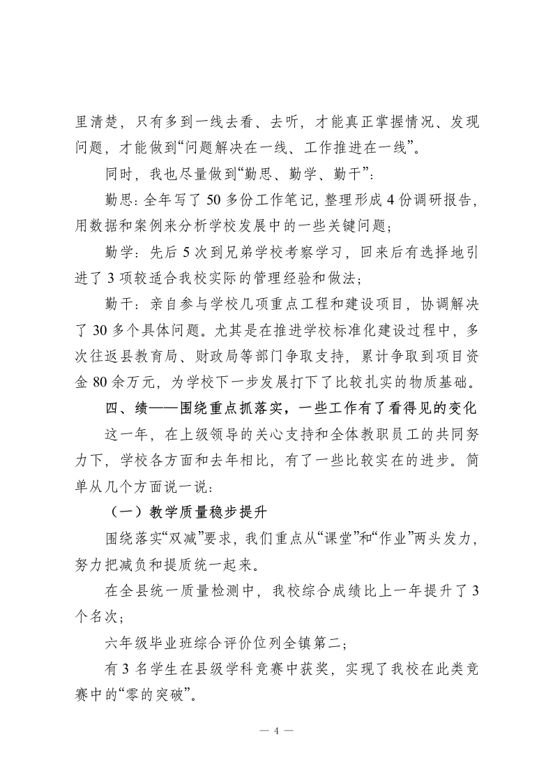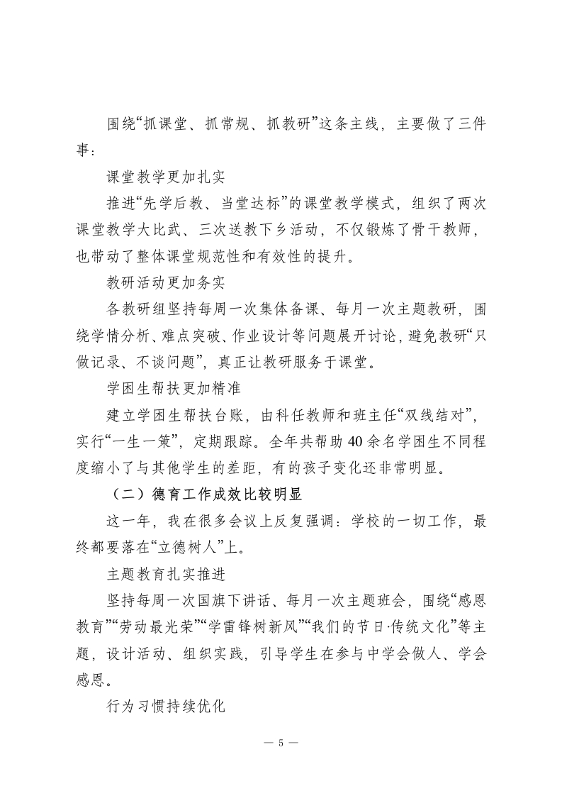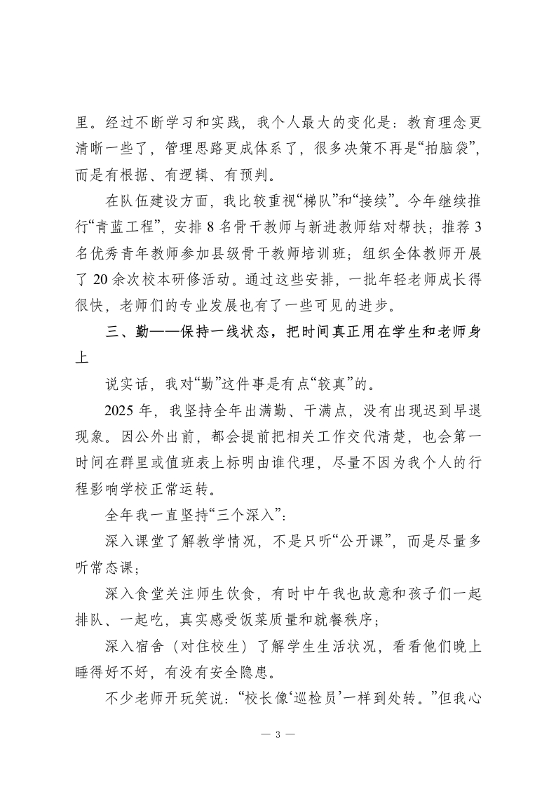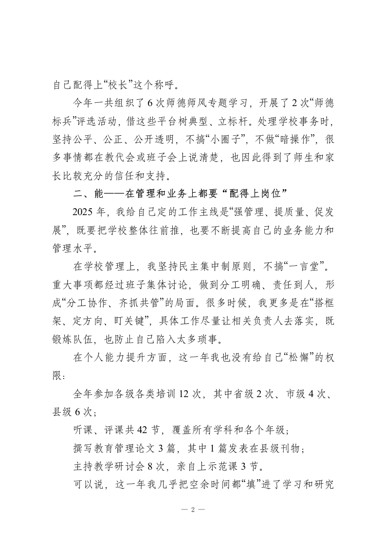 2025年度农村学校校长德、能、勤、绩、廉述职报告:工作上我重视“勤思、勤学、勤干”!各位领导、各位老师:时间过得很快,转眼2025年的工作已经接近尾声。按照上级要求和学校安排,我想借这个机会,从德、能、勤、绩、廉五个方面,把这一年的履职情况跟大家做一个比较完整的汇报,也算是对自己这一年的一次梳理和盘点。有哪些做得不够、做错的地方,也请大家直说,我虚心接受。一、德一一把“做人”和“育人”放在第一位作为一所农村学校的校长、D支部书记,我始终把政治品德和职业道德看得很重。2025年,我继续用…来对标自己的言行,尽量做到心中有方向、脚下不走偏。平时工作中,我一直提醒自己:先做人,再做事。“以德服人、以诚待人”,不是挂在嘴上的,而是落在具体事情里。面对农村教育资源相对薄弱的现实,我和全体教职工一起,坚持“扎根农村、奉献教育”的信念,尽我们的力量,让农村孩子也能在家门口享受到相对优质、温暖的教育,这一点我始终当作自己的职责和底线。在师德师风建设方面,我尽量做到以身作则、带好头。严格遵守教师职业道德规范,注意自己的每一句话、每一个动作,做到不说损害老师尊严的话、不做有损教师形象的事,努力让1