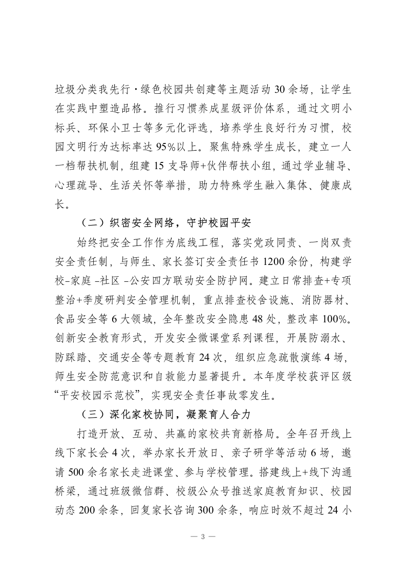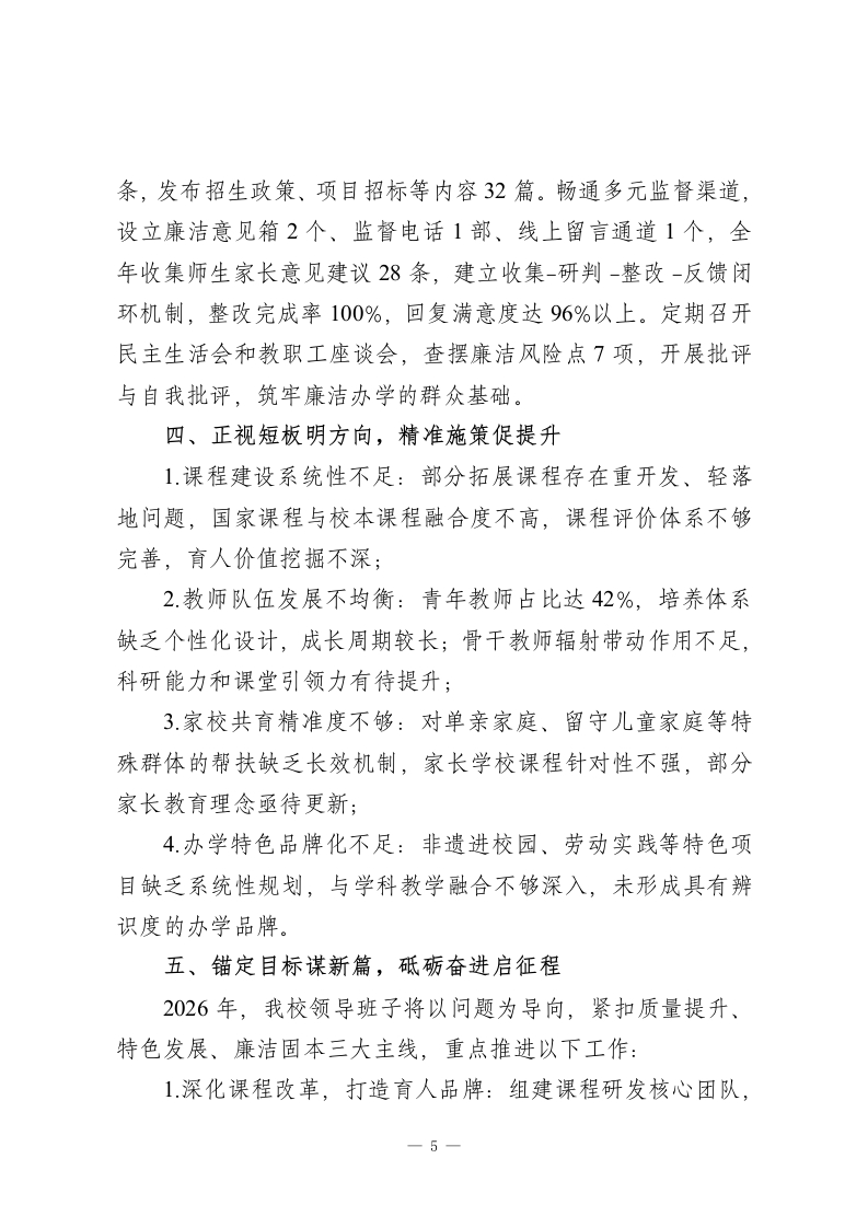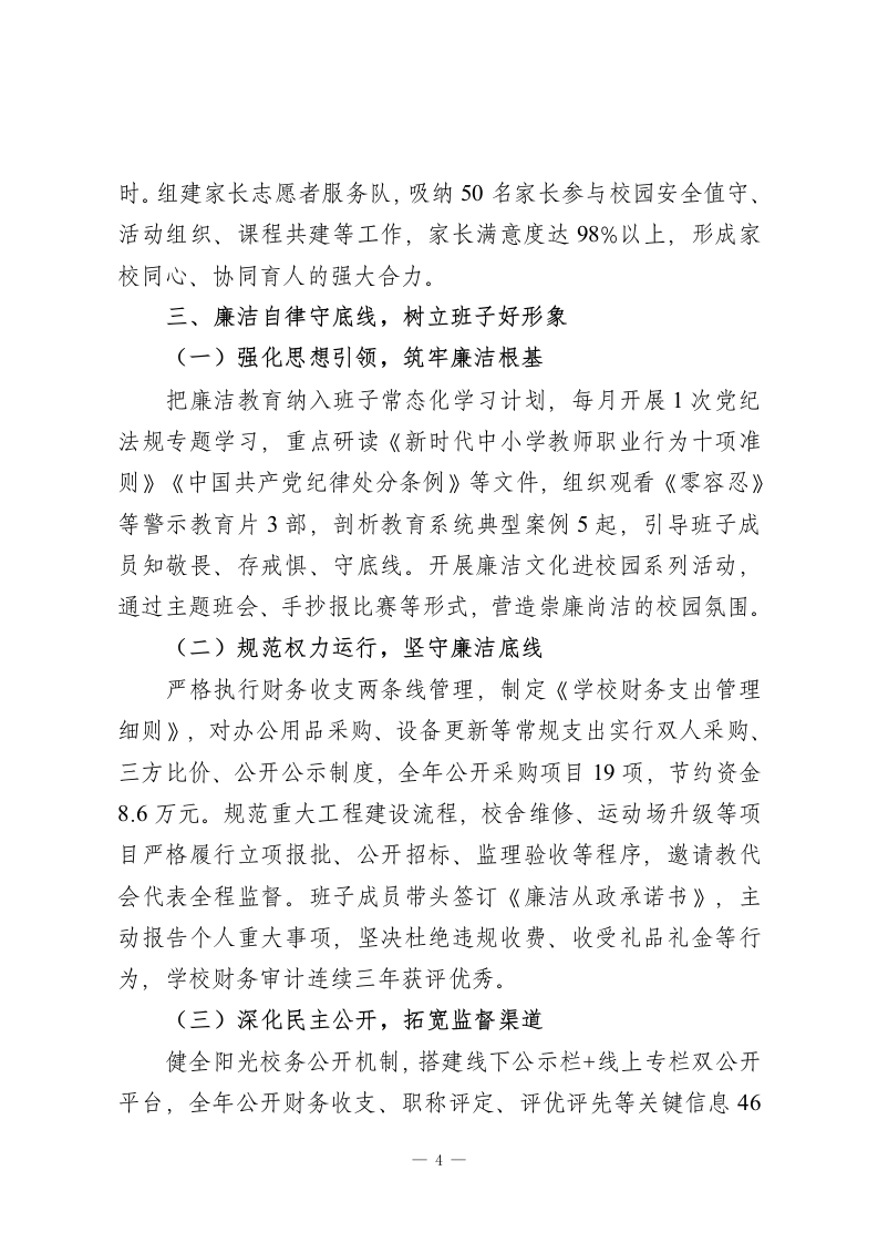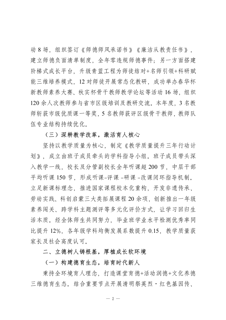 2025年度学校领导班子述职述廉述综报告尊敬的各位领导、全体教职工:2025年,我校领导班子锚定办人民满意的优质教育目标,在上级教育主管部门的科学指导下,传承为每个孩子的幸福成长奠基的办学初心,以精管理、强队伍、提质量、育新人、守廉洁为主线,团结带领全体师生攻坚克难、锐意进取,各项工作取得阶段性成效。现将本年度班子履职情况、廉洁建设成效及综合发展状况报告如下,恳请各位评议监督。一、精耕管理提质效,夯实办学硬支撑(一)优化治理体系,构建闭环管理以规范化、精细化管理为抓手,重构决策-执行-监督-反馈全链条治理体系。修订完善《学校行政管理章程》,细化班子会、中层例会、教代会三级议事规则,明确28项三重一大事项清单及决策流程,全年召开班子议事会18次、教代会3次,所有重大事项均通过议题征集-集体研讨-民主表决-结果公示四步流程,从源头上杜绝一言堂。创新推行月度工作清单+季度效能评估机制,将教学常规、安全管理等工作纳入量化考核,全年开展专项督导22次,建立问题整改台账36项,实行挂账销号、回头看复核,管理效能实现质的飞跃。(二)聚力队伍建设,锻造育人铁军构建师德铸魂+专业赋能双轮驱动的教师发展体系。一方面强化师德师风建设,开展师德标兵巡讲、教育初心分享会等活1