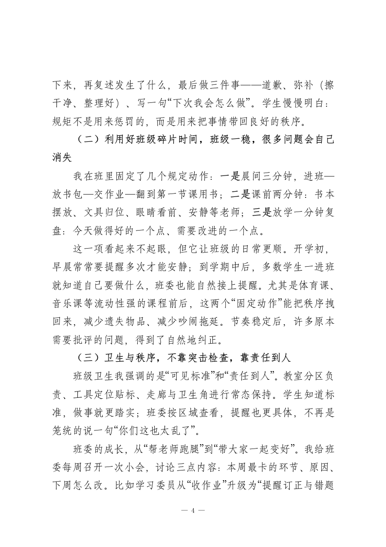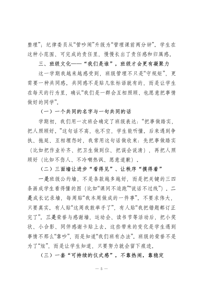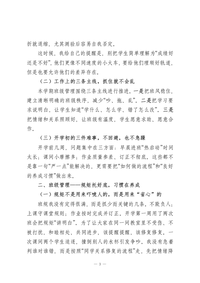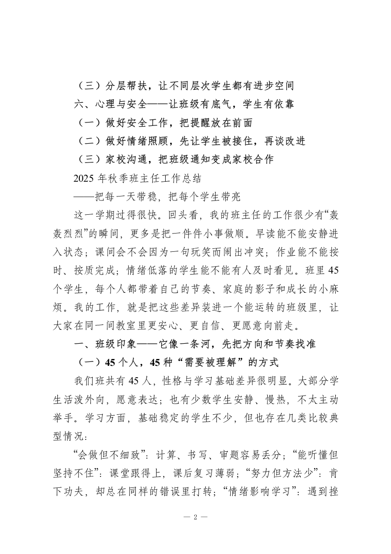 2025年秋季班主任工作总结一把每一天带稳,把每个学生带亮一、班级印象一一它像一条河,先把方向和节奏找准(一)45个人,45种“需要被理解”的方式(二)工作上的三条主线,抓住就不会乱(三)开学初的三件难事,不回避,也不急躁二、班级管理一一规矩托好底,习惯在养成(一)规矩不是用来吓唬人的,而是用来“省心”的(二)利用好班级碎片时间,班级一稳,很多问题会自己消失(三)卫生与秩序,不靠突击检查,靠责任到人三、班级文化一一“我们是谁”,班级才会更有凝聚力(一)一个共同的名字与一句共同的话(二)三面墙让进步“看得见”、让秩序“摸得着”(三)一套“可持续的仪式感”,不靠热闹,靠稳定四、育人落点一一德育放进生活中,成长放进日常里(一)每周一件“看得见的好事”,坚持美好发生(二)活动开展,把班级真正带出良好气象五、学习支持一一不只盯分数,更盯“学习成长”(一)抓好课堂习惯:会听、会记、会问,才是真的“学进去”(二)分层作业管理,从“交齐”走向“做对、做懂”-1-