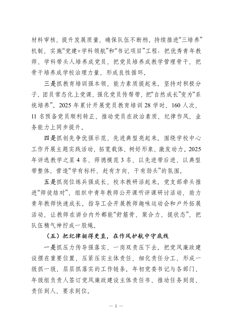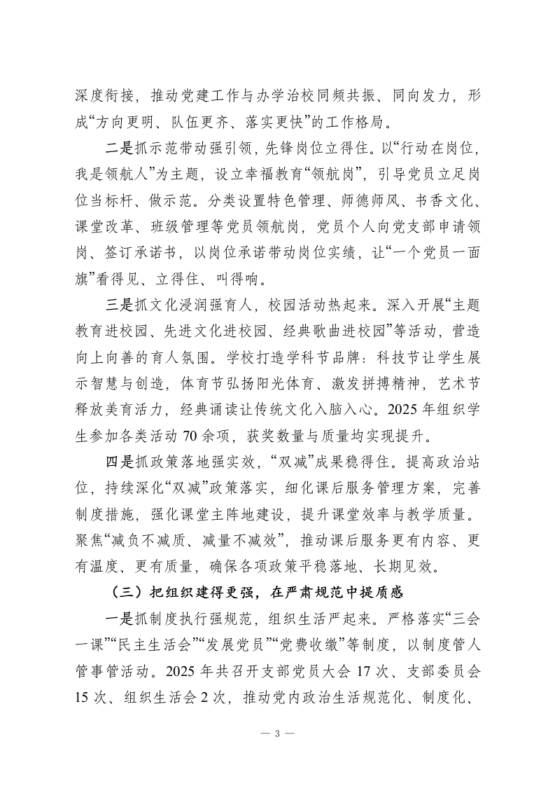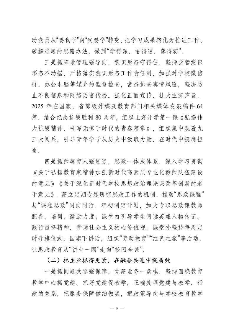 2025年学校党建工作总结报告2025年,是全面贯彻党的二十大精神的关键一年,也是“十四五”规划的收官一年。一年来,学校党总支坚持以习近平新时代中国特色社会主义思想为指导,深入学习贯彻党的二十大和二十届三中、四中全会精神,全面落实党的教育方针和全国教育大会精神,扎实开展深入贯彻中央⑧项规定精神学习教育,牢牢扛起立德树人根本任务,把党建优势转化为治理效能、把政治引领转化为育人实效,推动学校各项工作稳中有进、进中提质。现将全年党建工作总结如下。一、工作情况(一)把旗帜举得更高,在凝心铸魂中强根本一是抓首要任务强领学,理论武装不断档。坚持把学习贯彻习近平新时代中国特色社会主义思想作为首要政治任务,校党支部理论学习中心组坚持每月至少学习1次、每季度至少研讨1次,系统学习《论教育》《习近平治国理政(第五卷)》等内容。严格落实“三会一课“主题党日”等规定动作,制定年度学习计划,坚持每周1次、每次不少于半小时集中学习,依托“学习强国”、校园公众号、微信交流群等平台常态推送学习内容,做到“学在日常、抓在经常、用在平常”。二是抓常态长效强转化,学用贯通见真章。把党的二十大精神和二十届三中、四中全会精神、二十届中央纪委四次全会精神、全国教育大会精神等作为重点内容,强化党员政治教育、忠诚教育和形势政策教育。组织开展“学习强国”积分竞赛,推1