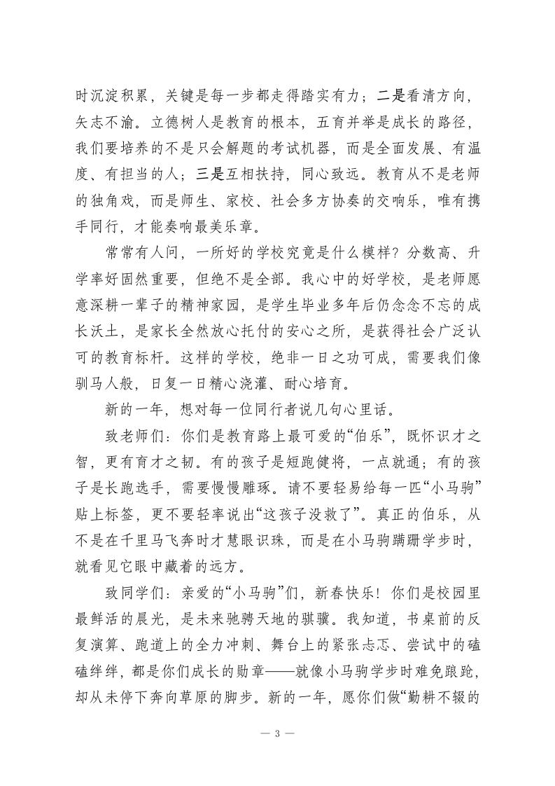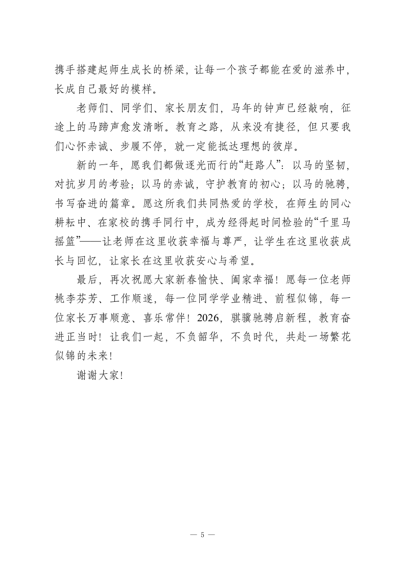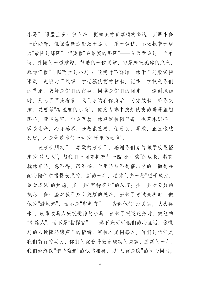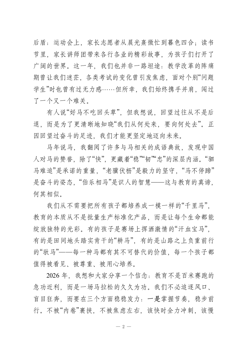 2026马年校长新春致辞:感谢你们始终做学校最坚定的“牧马人”尊敬的各位老师、亲爱的同学们、尊敬的家长朋友们:大家新春好!2026年马年的第一缕阳光照进校园,我站在这里,心中涌起的是激动,是感慨,更是对未来的无限憧憬。今天,我想和大家聊聊“马”这个字,聊聊我们的教育,聊聊我们共同的梦想。回望2025,三百六十五个日夜的深耕细作,在校园的时光卷轴上刻下了太多温暖与奋进的印记。去年开学典礼上,我曾说“教育不是注满一桶水,而是点燃一把火”,这一年,我亲眼见证了无数火焰在校园各处炽热燃烧。课堂上,张老师为让学生读懂“圆周率”,带着孩子们用绳子量遍校园所有圆形物体;李老师为激发写作兴趣,把作文课搬到了田野阡陌、市井菜场:王老师为辅导竞赛生,连续三个月每晚坚守至深夜十点…你们就像慧眼识珠的伯乐,以专业的眼光、无限的耐心,发现每一个孩子身上独特的光芒。赛场上的身影同样令人动容:我们的学生在市级运动会上打破尘封十年的跳远纪录,在数学竞赛中斩获一等奖,在艺术展演中以一曲《龙的传人》技惊四座。更让我铭记的是,小刘同学在接力赛中不慎摔倒时,队友们没有丝毫犹豫,先一同冲过终点线,再折返回来扶起他一一这一幕并肩前行的温暖,比任何奖牌都更加珍贵。家校同心,其利断金。家长们的支持始终是我们最坚实的-1