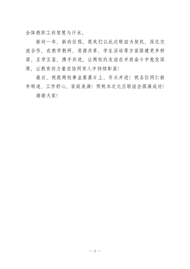 2026年元旦两校联谊初中校长讲话:携手育新苗,友谊伴征程尊敬的Xx主任、亲爱的Xx二中各位同仁:大家新年好!在2025年即将收官、2026年如约而至的美好时刻,我们欢聚一堂,共赴这场温馨的元旦联谊会。此刻,暖意融融、情谊绵长,我谨代表本校全体教职员工,向远道而来的各位贵宾致以最热烈的欢迎!向一年来深耕教育、默默奉献的两校同仁,致以最诚挚的感谢和新年的美好祝福!Xx二中作为区域普教标杆,办学底蕴深厚、育人成果丰硕,是无数学子向往的成长沃土;我校深耕职业教育领域,以技能赋能、实践育人为特色,成为培育技术人才的重要阵地。两校虽育人赛道不同,但怀揣着对教育的赤诚与坚守,肩负着立德树人的共同使命,如同并蒂莲开,在xx教育的沃土上各自芬芳、彼此守望。我们同沐一方教育春风,共担一份育人责任,“为党育人、为国育才”的初心,让我们的心紧密相连。回望2025年,两校都在高质量发展的道路上收获满满。我校持续优化办学模式,新增3个省级重点实训基地,教师在职业技能教学竞赛中斩获12项省级奖项,学生技能大赛获奖人数较上年提升30%,特色专业建设成效显著。而xx二中在中高考中再创佳绩,本科上线率稳步攀升,多位教师获评省级骨干教师,校园文化建设与素质教育齐头并进,赢得了社会广泛赞誉。这些成绩的取得,离不开上级部门的悉心指导,更凝聚着两校1