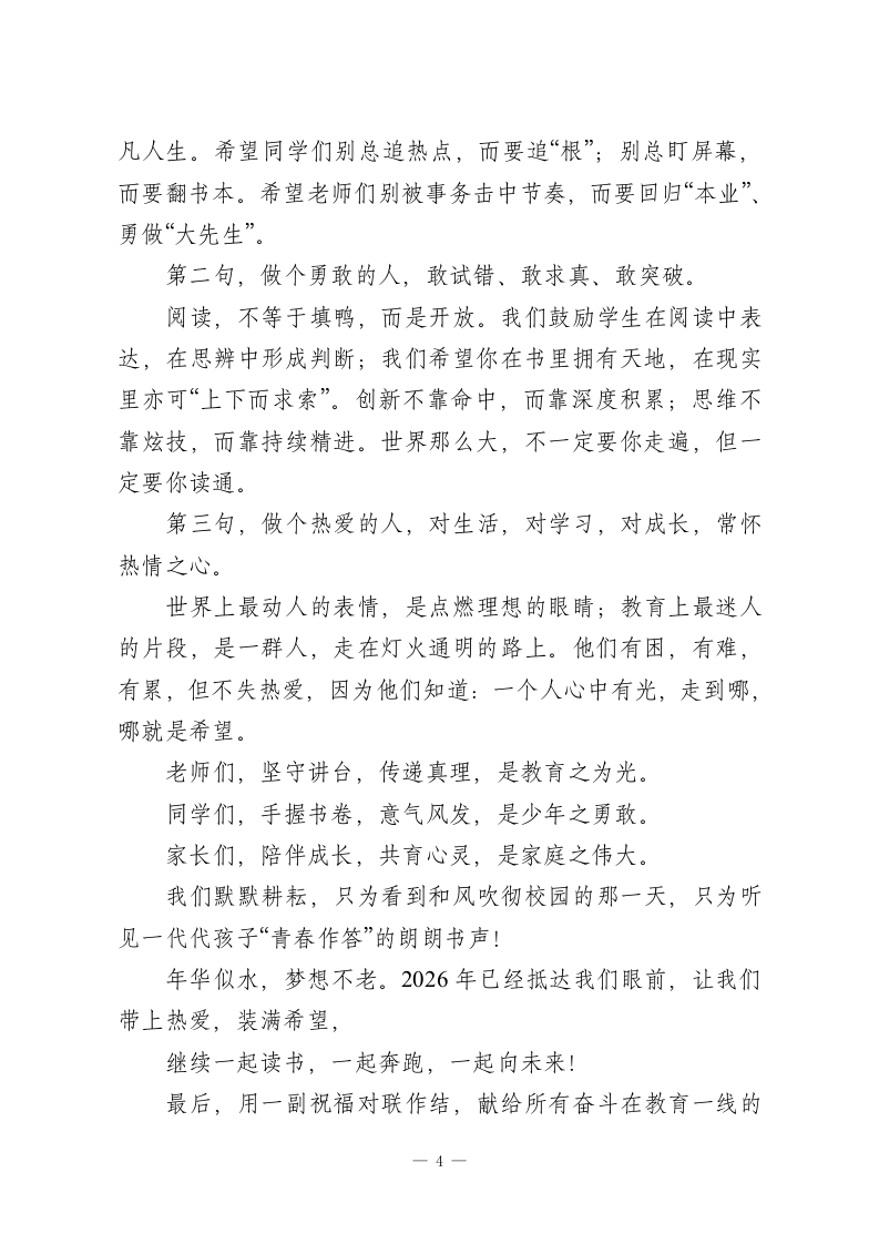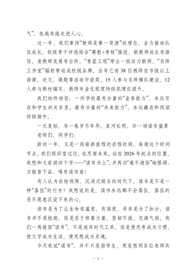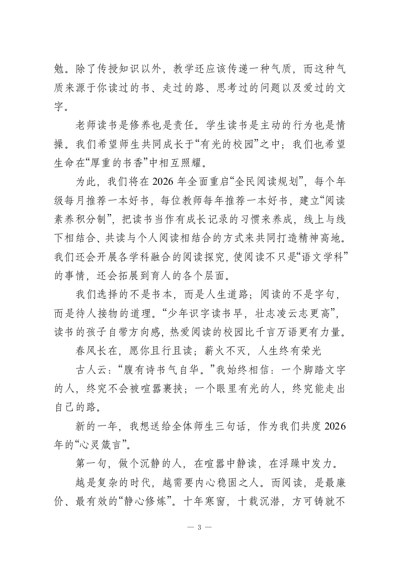 不是落伍,而是力量!校长元旦致辞点名:2026,最该坚持的,是读书!各位老师、亲爱的同学们:大家新年好!瑞马呈祥迎喜庆,梅开瑞气启新图。在这万象更新、四序初开的美好时节,我们欢聚一堂,辞别满载收获与感动的2025年,喜迎朝气蓬勃、充满希望的2026年。值此元旦佳节来临之际,我谨代表学校,向一年来辛勤付出、默默耕耘的广大教职工,向朝气蓬勃、勇攀高峰的全体同学,以及长期以来关心、支持学校发展的家长朋友和社会各界人士,致以最衷心的感谢与最诚挚的新年祝福!刚刚走过的2025年,是我们深耕教育主业的一年,是走得踏实、收获厚实、步伐坚实的一年。我们坚持以“办人民满意教育”为目标,精雕细刻每一节课堂,坚定推进课堂改革:从课堂到课后,从“双减”到“提质”,从教学文本到情境体验,教学提质焕发内在活力,课堂新样态频频绽放。在区教研活动中,我校获评“课堂实效提升示范校”;在市级教学质量监测中,我校多科成绩实现“稳定提升”,赢得了越来越多的认可与喝彩。这一年,我们更注重德育驱动,构建“全链条”育人体系:“大思政”教育深入推进,全年累计开展主题德育活动近百场;“书香校园”建设扎实推进,一项项读书活动让“阅读成为习惯、文字照亮人生”;仪式育人、生态育人、文化育人体系初步成形,育人方式越来越贴近学生成长的真实需求一教育越来越“接地1