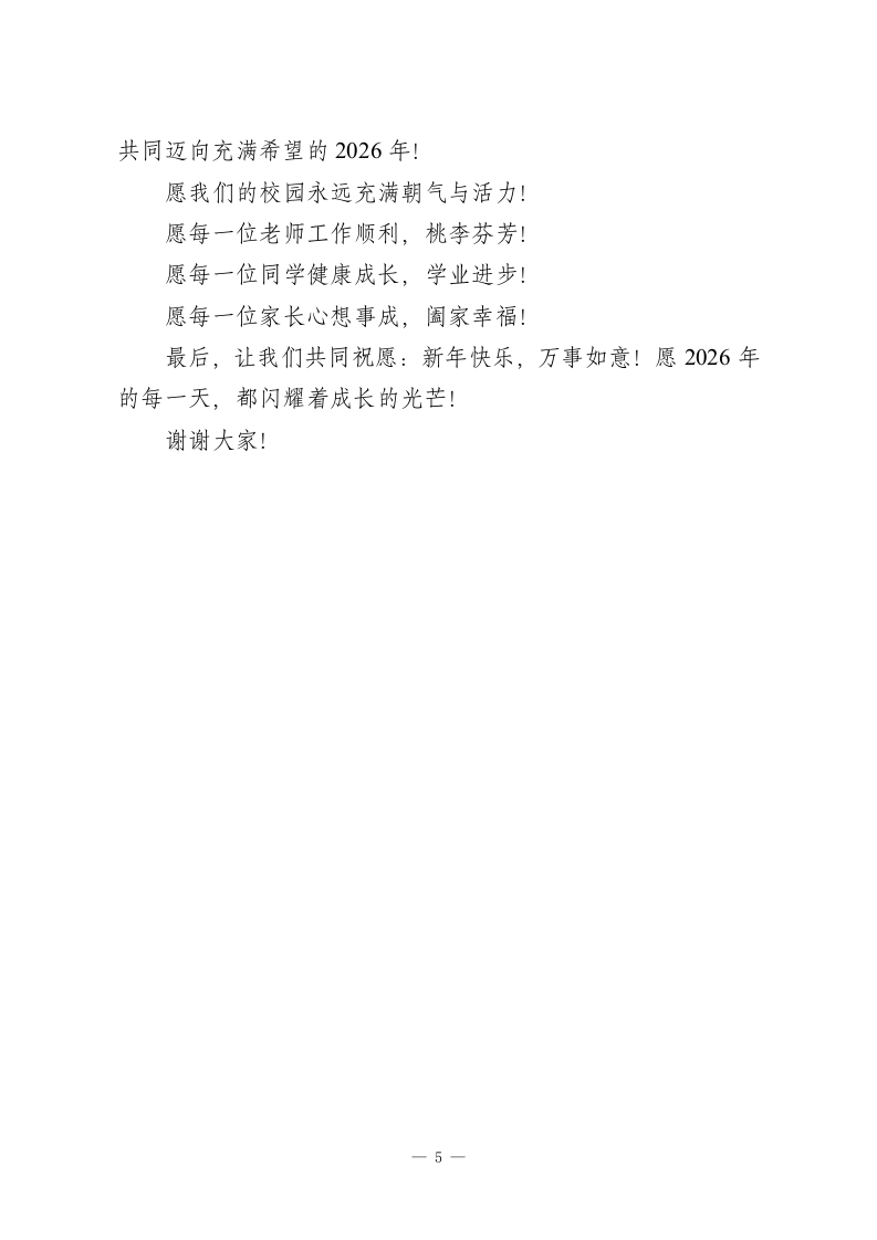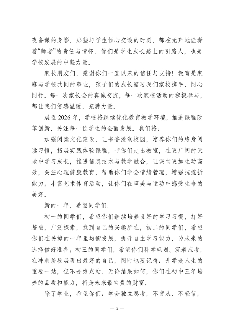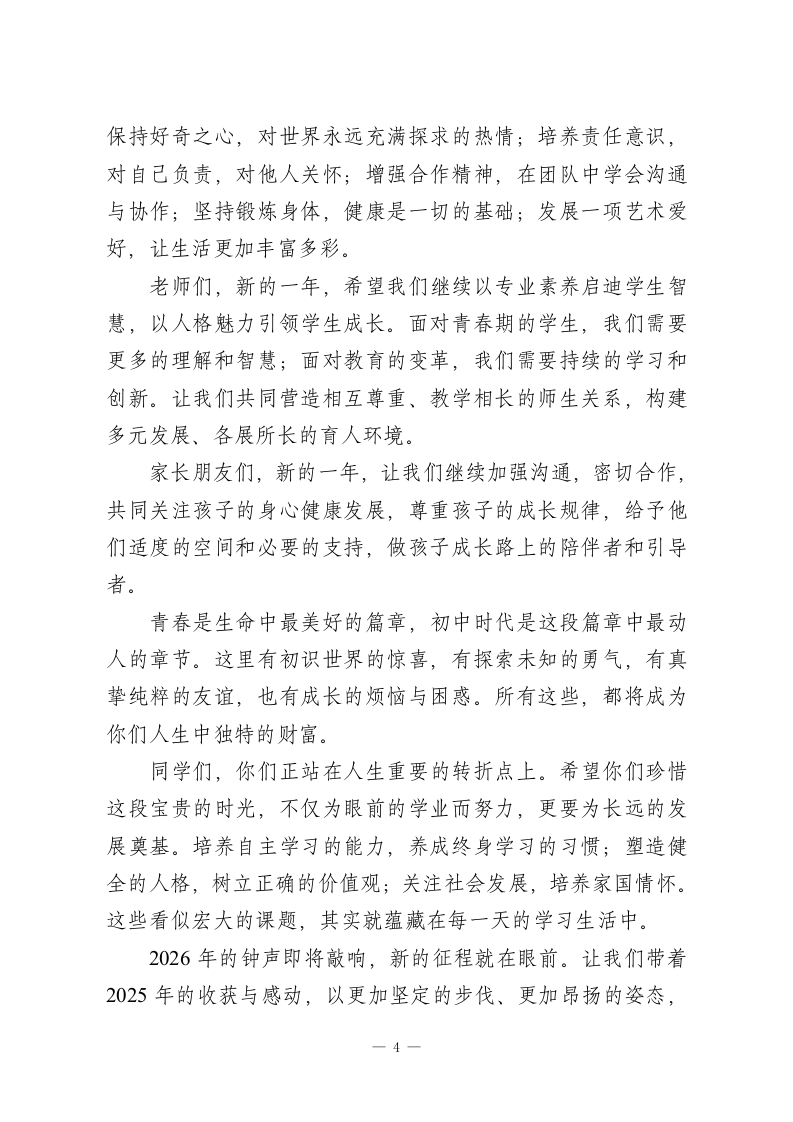初中校长2026年元旦致辞:愿2026年的每一天,都闪耀着成长的光芒当时光的年轮即将刻下2026年的第一圈印记,当冬日的暖阳洒满校园的每个角落,我们怀着激动与期盼,共同迎接新年的到来。在此,我谨代表学校,向所有孜孜不倦的老师们,向所有朝气蓬勃的同学们,向所有关心支持学校工作的家长朋友们,致以最诚挚的新年祝福和最美好的节日问候!回望2025年,我们的校园里充满了成长的芬芳和奋进的气息。这一年,每一天都见证着变化,每一个角落都记录着美好。清晨,教室里传来朗朗读书声;课间,操场上跃动着青春的身影;午后,实验室里闪烁着求知的眼眸;傍晚,艺术教室里流淌着灵动的音符。这一切,编织成我们初中时代最珍贵的记忆画卷。还记得吗?春天里,我们开展“校园植物观察”活动,同学们拿着笔记本,仔细观察每一片叶子的脉络,记录每一朵花的绽放。生物老师说:“观察是科学的第一步。”你们的认真和专注,让这个春天格外动人。夏日里,科技节如期而至。纸桥承重比赛中,几张普通的A4纸在你们手中变成坚固的桥梁:机器人编程展示中,小小的机器人按照指令完成一个个任务;创意发明大赛上,你们的奇思妙想让评委老师赞叹不已。这些时刻,我们看见了创新精神的萌芽。秋天是丰收的季节。运动会上,你们挥洒汗水,为班级荣一1-