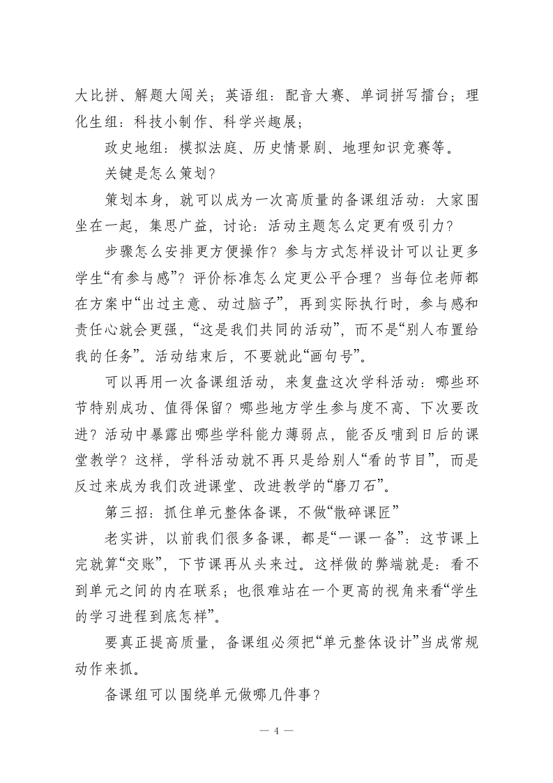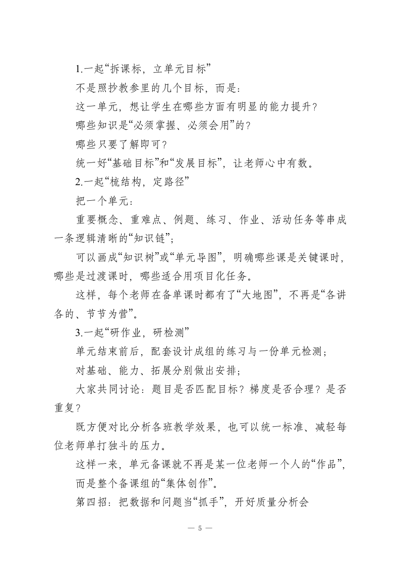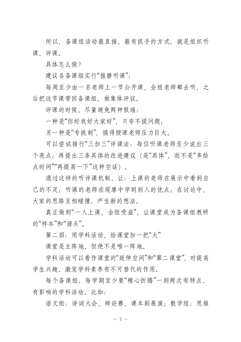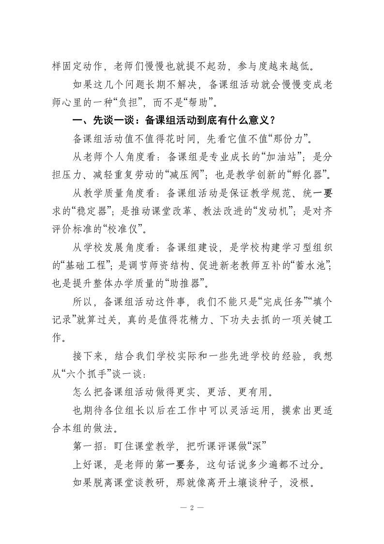 从“教研”走向“高效”|校长为教研组长、备课组长提出提升质量的6个抓手各位教研组长、备课组长、各位老师:大家好。今天把大家请到一起,想聊的不是新概念,也不是高大上的理论,而是一个我们年年讲、月月做、天天遇到的老话题一一备课组活动怎么才能真正“见效”。为什么说是老话题?因为备课组活动是学校教研的“基本款”,每个学校都有、每年都搞、每月都有安排。那为什么今天还要专门拿出来说?一方面,新课改在往前推、教育高质量发展的要求在往上提,另一方面,备课组活动本身的内涵和外延也在不断变化一以前只是“对一对教案“分一分任务”,现在我们希望它能成为真正的专业共同体,需要新的思路和做法,让这个“老阵地”活起来、强起来。刚才我在办公室转了一圈,听到有老师半开玩笑地说一句:“备课组活动年年搞,形式大于内容,有用的不多。”这话听着有点扎心,但也不完全是空穴来风。我们实事求是地看一看:有的备课组活动,签到5分钟、闲聊30分钟,再散会,各忙各的;有的备课组长,把活动当成“上传下达”的时间,只布置任务、不组织研究;有的备课组,一年到头就那几1