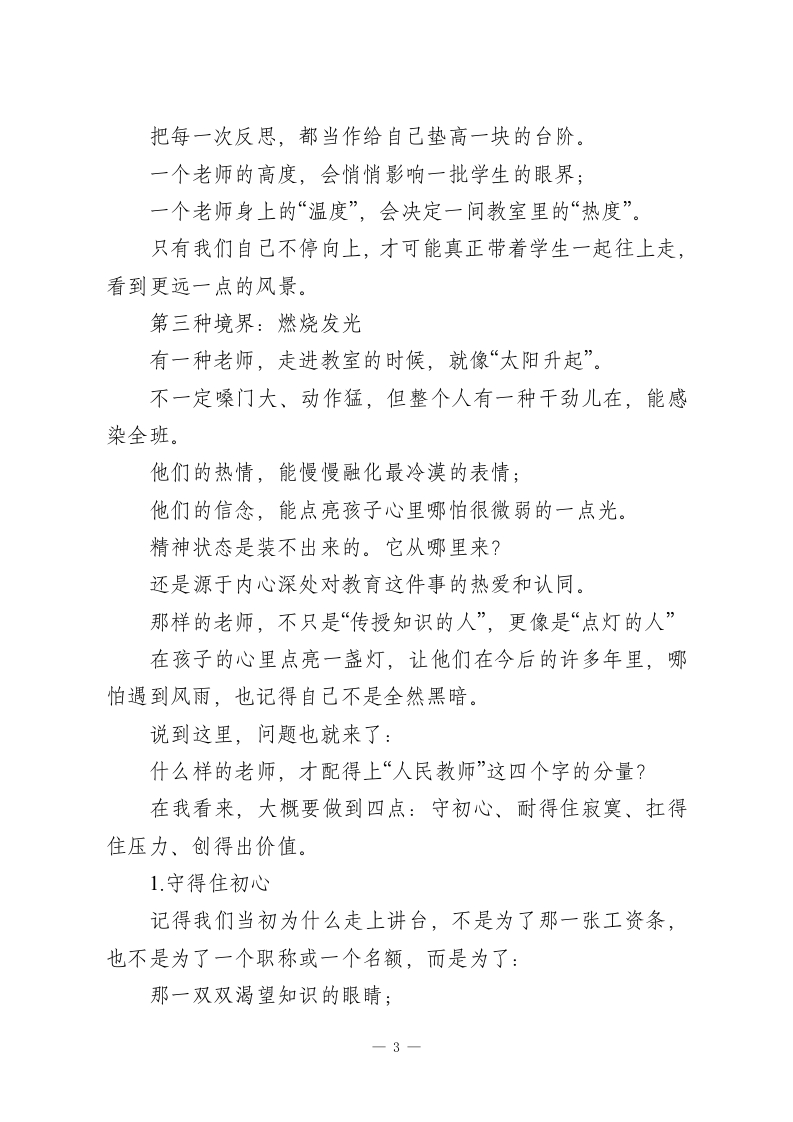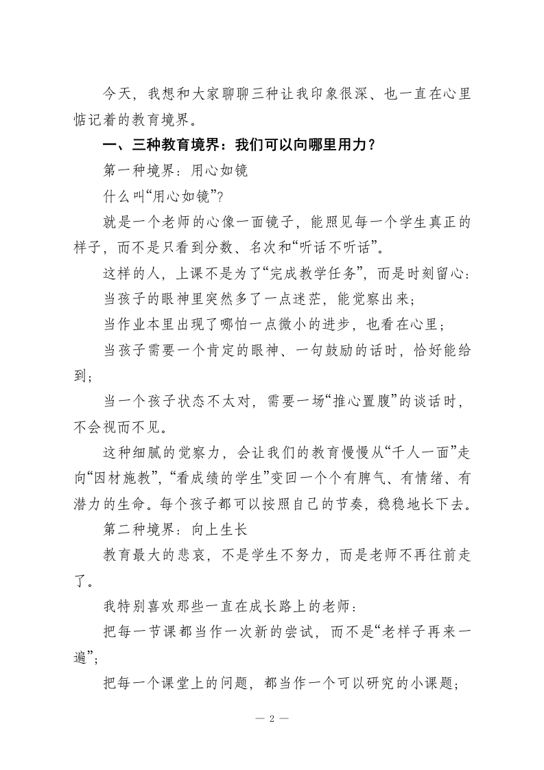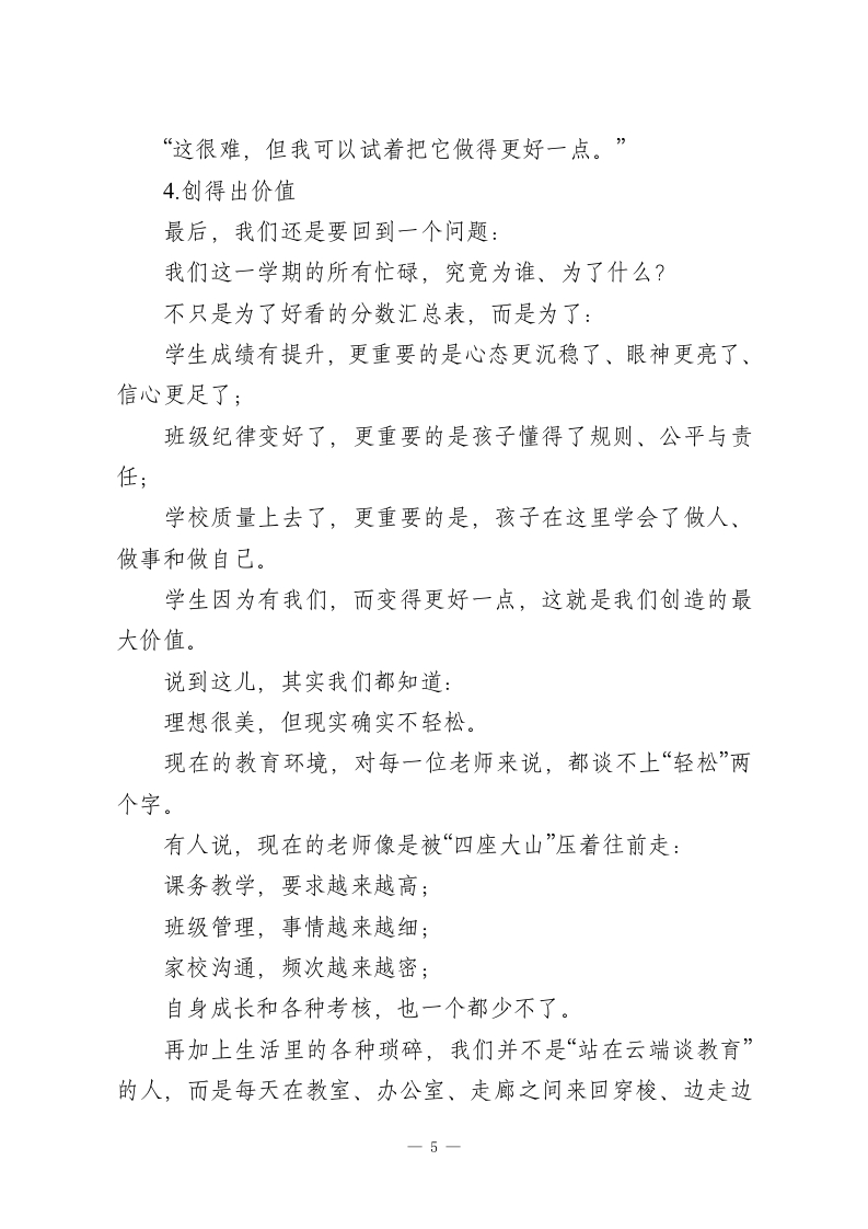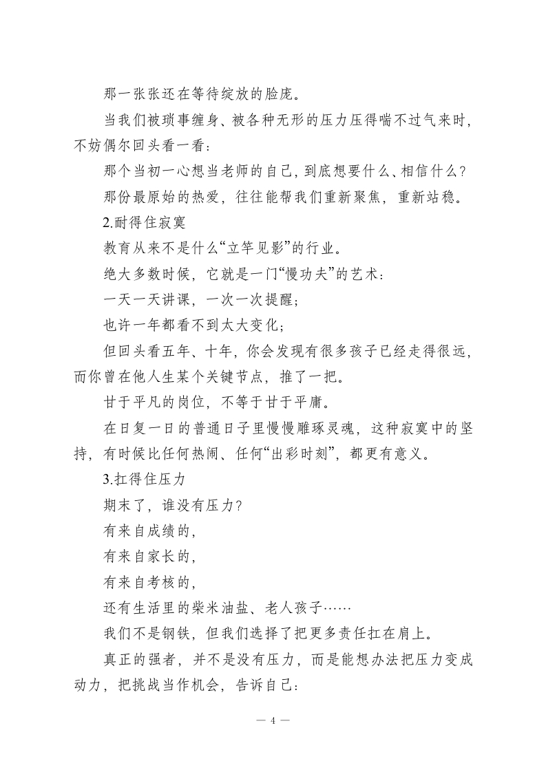 期末教师动员会上,校长讲话:看着窗外一年四季的变化,我想起了一句话各位老师、各位同志:大家好。一转眼,又到了学期尾声。站在这个时间点上,再看看教室外一年四季的轮换,很容易想到一句话:教育,其实就是一场和时间赛跑的修行,而期未,就是这场修行中的一块“试金石它在表面上考的是分数、成绩,其实深层上也在考:我们的教学水平到底扎不扎实?我们的教育初心是不是还在?孩子们这一路有没有真正长成自己该有的样子?在开头,我想先对在座的每一位老师说一声:辛苦了,真心的那种。这一个学期,大家用清晨的第一缕阳光迎接学生,用深夜办公室的灯光陪伴作业和备课,用一点点耐心、一点点积累守护着孩子的成长。很多付出,是看不见写不进汇报里的是多看一眼的眼神,是多问一句的话语,是对一个问题多备了一种讲法。你们的每一份坚持,都是学生向上的“脚手架”;你们的每一滴汗水,都在学校的发展史上留下了痕迹。但我更想说的是:真正优秀的教育者,不只是“付出很多”,而是“在付出之外,还特别在意这份付出最后变成了什么”。孩子因为遇见我们,变得不太一样了这,才是教育最动人的地方。1