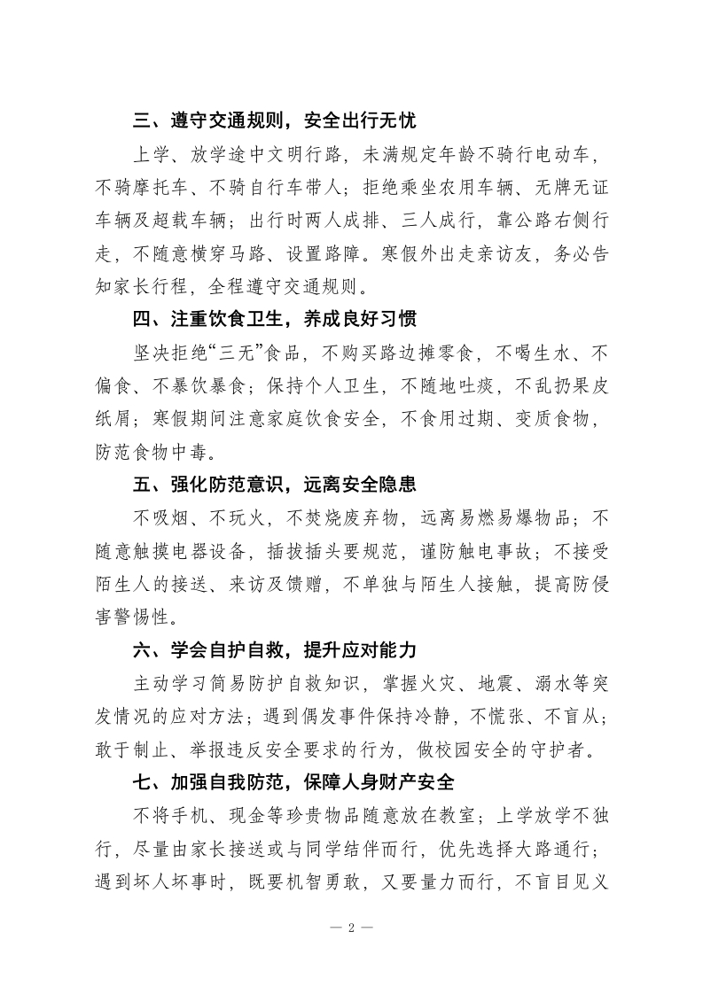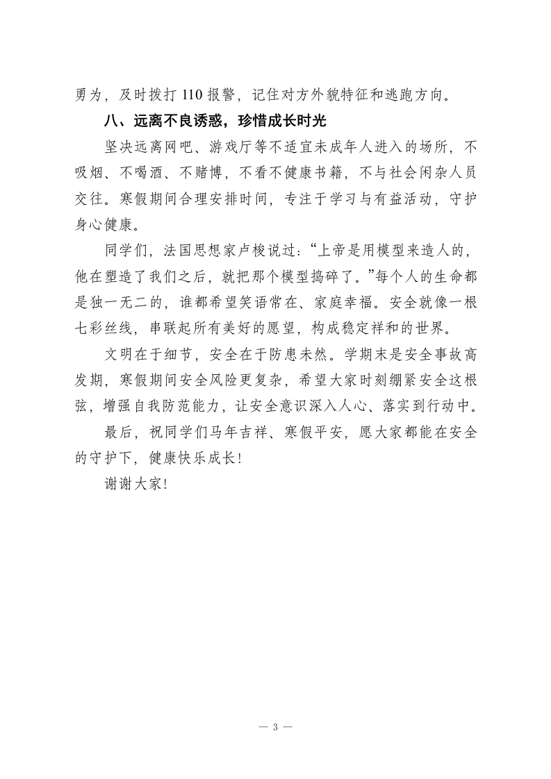 秋季学期安全教育会议校长讲话:以文明养德,以安全护行同学们:生命对于每个人都只有一次,安全是守护生命最坚实的屏障。现实生活中,有些同学可能因多次疏忽却未遭遇意外,就忽视安全的重要性,但数据不会说谎一一近年来全国中小学每年非正常死亡人数超1.6万人,平均每天有40多名同学离世,这意味着每天都有一个班级从校园里“消失”。校园安全关乎每位师生的成长与发展:关系到同学们能否健康成长、顺利完成学业,关系到老师们能否在宁静安全的环境中教书育人。做好安全工作是学校各项工作的基础,必须长抓不懈、落到实处。结合学期末及寒假安全重点,我提出以下八点要求:一、涵养文明素养,杜绝校园冲突团结同学、和睦相处,学会用沟通化解矛盾,严禁打架、骂人等不文明行为。骂人、打架不仅是低素质的表现,更可能引发严重后果。不因小事争吵,不参与校园内外暴力行为,争做文明有礼的学生,共同维护和谐校园氛围。二、严守课间规范,防范意外伤害课间不进行剧烈运动,避免追逐嬉戏、打闹攀爬;行走时遵守“右行礼让”规则,不拥挤、不抢道;不在教室门前、走廊等区域打球、踢球,不做危险游戏,防止磕碰、摔倒等意外发生。