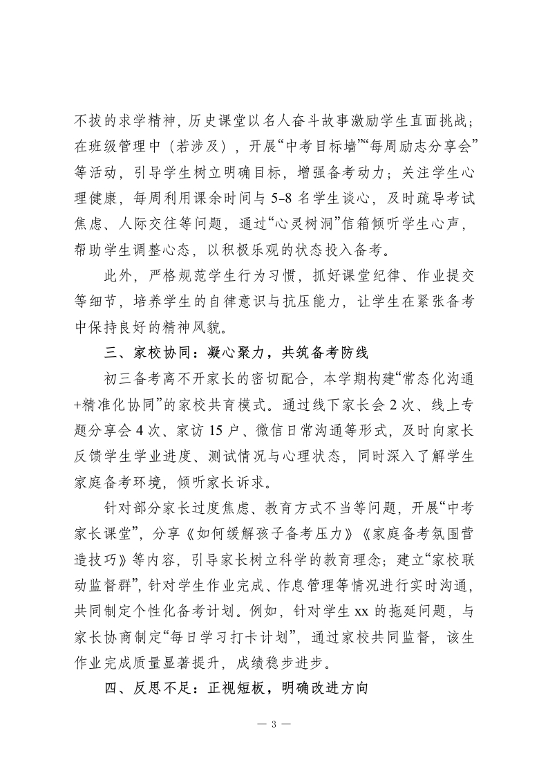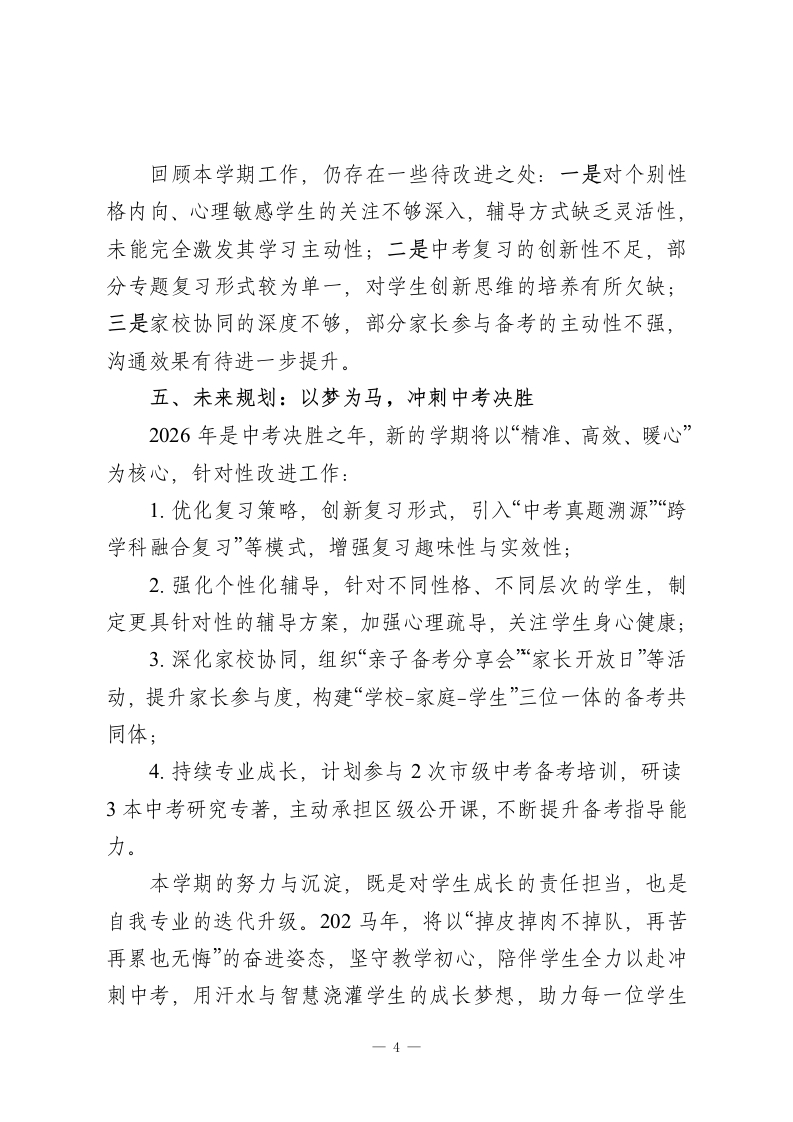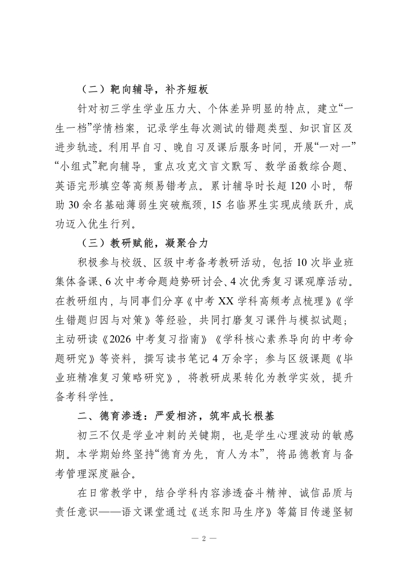 秋季学期初三毕业班教师期末工作总结:以笃行赴使命,以奋进育新苗本学期已至尾声,2026年的脚步悄然临近。作为初三毕业班的教师,这一学期既是深耕教学、助力学生冲刺中考的关键阶段,也是自我沉淀、不断成长的修行之路。现将本学期教育教学、班级管理、家校协同及个人成长等工作全面复盘,总结经验、正视不足,为新学期的中考冲刺工作筑牢根基。一、教育教学:精准发力,护航中考冲刺(一)深耕课堂,提质增效本学期聚焦中考核心目标,立足新课标与学情实际,构建“高效课堂+精准复习”的教学模式。课前深入研读中考真题与命题趋势,结合学生知识短板,制定分层教学方案;课中采用“考点精讲+例题解析+限时训练”的节奏,通过问题驱动、小组研讨等形式,激发学生主动思考,确保课堂知识吸收率;课后针对不同层次学生设计个性化作业,基础薄弱生侧重知识点巩固,学有余力生侧重拓展拔高,避免“一刀切”。同时,注重学科核心素养培养,将中考考点与生活实际、学科思维相结合,引导学生从“会做题”向“会思考”转变。本学期共开展16次中考专题复习课、8次模拟测试,每次测试后及时进行数据化分析,精准定位班级共性问题与学生个体漏洞,调整复习策略,班级学科平均分较上学期提升12%,优秀率提升8%。一1