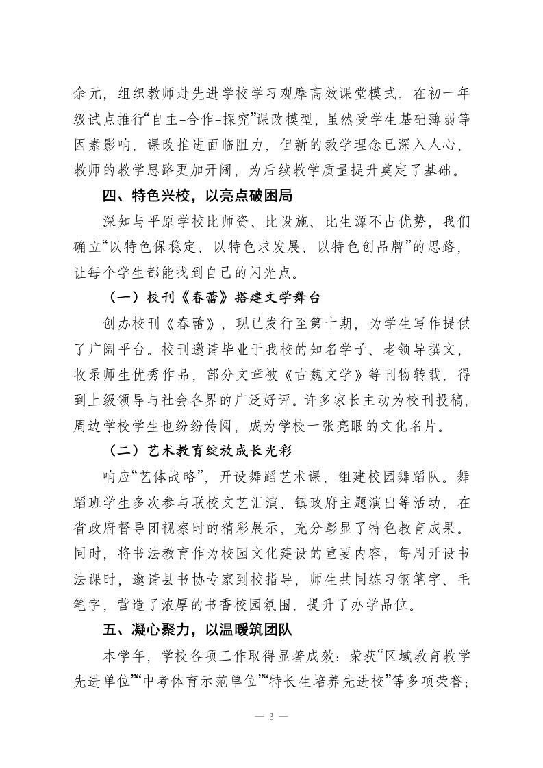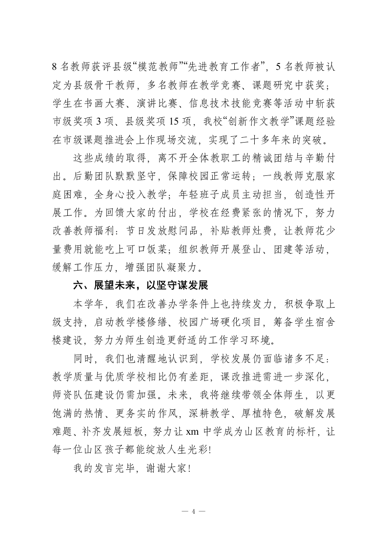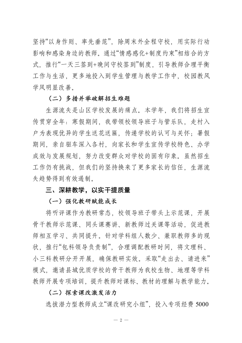秋季学期初中乡村校长年度工作汇报发言:守初心献山区,育桃李谱新篇尊敬的各位领导、各位老师:时光荏苒,本学期已圆满落幕。自2025年9月接任xm中学校长一职以来,我始终怀揣对山区教育的赤诚,以“不亏待每位教师、不放弃每位学生、不失信每位家长、不辜负每位领导”为初心,扎根这片教育沃土,与全体教职工并肩作战,在困境中探索,在坚守中前行。现将本学年工作情况汇报如下。一、扎根山区,以初心扛使命x中学作为山区农村薄弱校,面临诸多现实挑战:部分教学楼设施陈旧,校园基础设施有待完善;交通不便,师生出行多有不便;师资结构失衡,50岁以上男教师、45岁以上女教师占比近30%,年轻教师流失风险较高;学生中留守儿童、单亲家庭子女、困境家庭子女占比大,家庭教育缺失问题突出。面对这样的校情,我深知肩上的责任重大。但我更看到,留下来的教师怀揣着对教育的热爱与奉献精神,坚守岗位不离不弃;学生们虽身处困境,却依然渴望知识、向往未来。这坚定了我扎根山区、办好教育的决心,也让我更加明确:必须走出一条适合山区学校的特色发展之路,让山区孩子也能享受到优质教育资源。二、率先垂范,以行动聚合力(一)以身作则守校育人针对学校住校教师少、部分教师家校往返频繁的问题,我一1