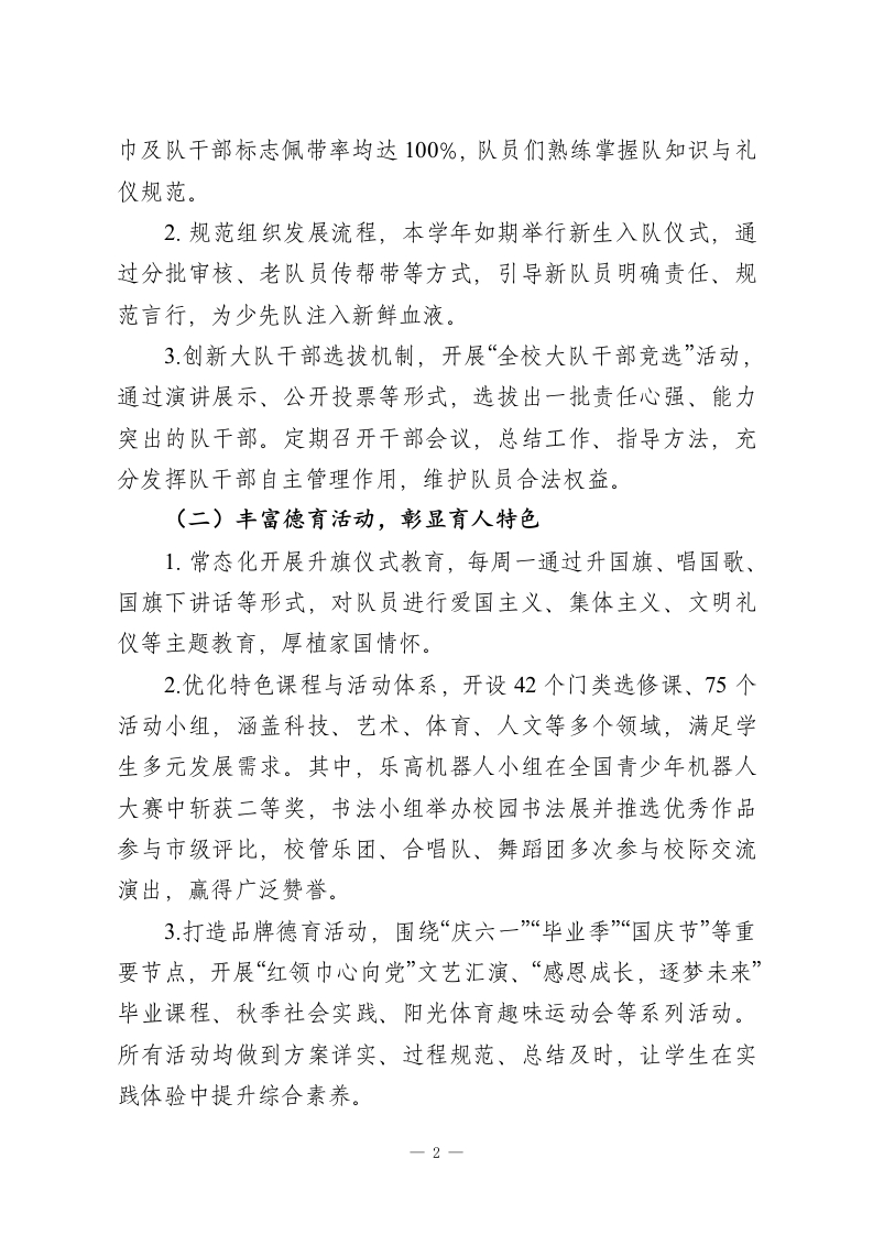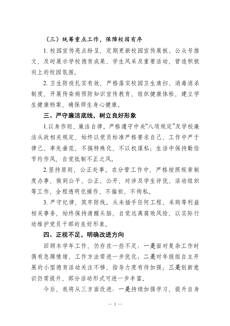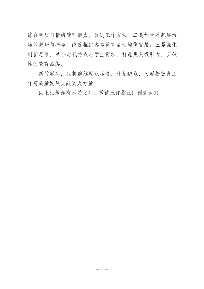 秋季学期德育分管副校长述职报告:履职尽责勇担当,深耕德育促成长尊敬的各位领导、同志们:大家好!本学期,我始终秉持“立德树人”根本任务,以“务实创新、廉洁自律”为准则,认真履行分管职责,统筹艺术教育、少先队工作、校园宣传、卫生防疫及德育活动等各项任务。在领导的关心支持与同事们的协作配合下,各项工作稳步推进、成效显著。现将本学年履职情况及廉洁自律表现汇报如下,恳请批评指正。一、强化理论武装,筑牢思想根基本学年,我坚持把政治理论学习摆在首位,深入学习党的教育方针及最新政策文件,深刻领会“五育融合”育人理念,不断提升自身思想政治素养与党性修养。始终秉持“讲政治、守信念、重团结”的原则,自觉贯彻民主集中制,大事讲原则、小事讲风格,主动向领导同事学习、向实践学习,不断拓宽工作思路、提升履职能力,确保分管工作始终与学校发展方向保持一致。二、聚焦主责主业,抓实分管工作(一)夯实少先队建设,筑牢德育阵地1优化少先队室功能,结合新时代少先队员特点,打造“红色教育+实践创新”的队室文化,使其成为队员们学习、交流、成长的重要平台。规范少先队组织管理,新队员入队率、红领1