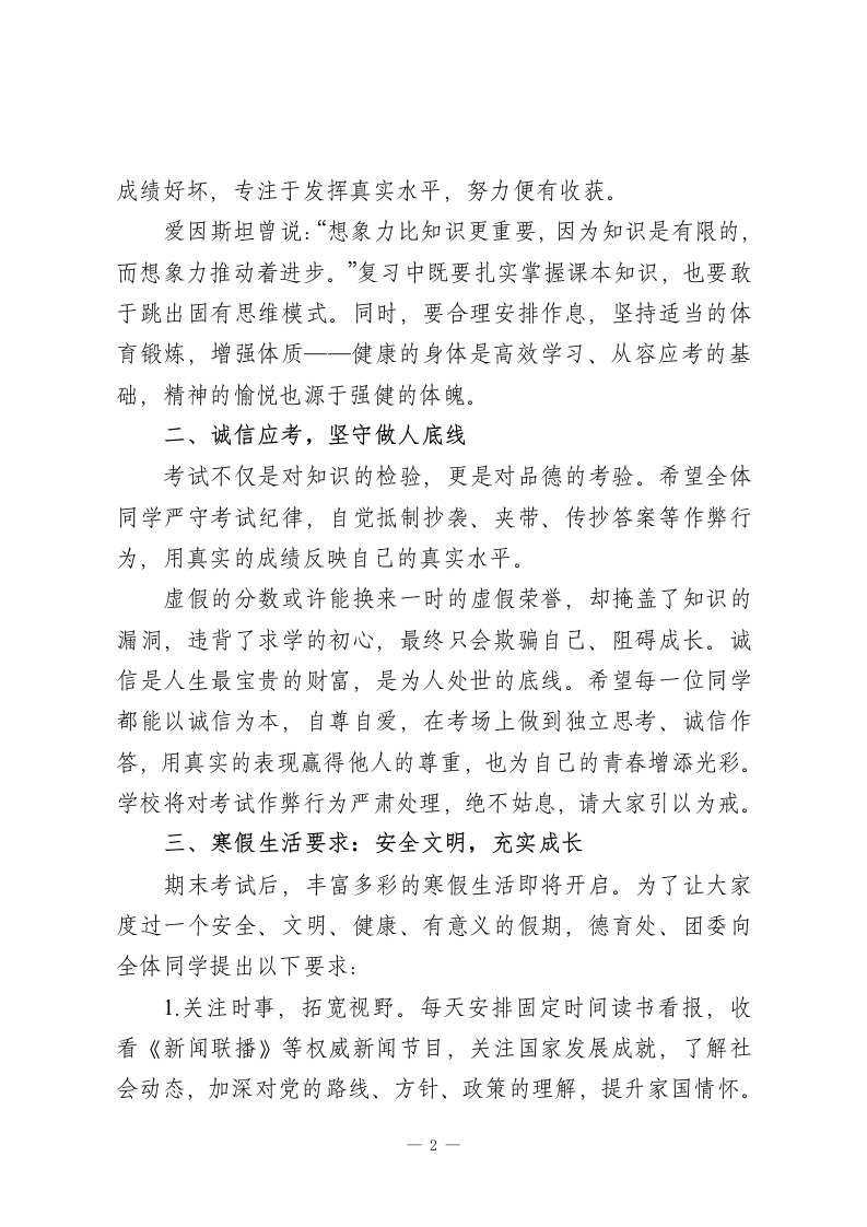 秋季学期德育副校长期末考试励志讲话:诚信应考显真章,笃行逐梦启新程同学们:2026年的钟声余音未散,我们已迈入紧张而关键的期末复习冲刺阶段。以饱满的热情、扎实的准备迎接期末考试,用优异成绩为这一学期画上圆满句号,是我们共同的心愿。希望每一位同学都能全力以赴,在考场上展现真实水平,在假期中收获充实成长。一、科学复习,高效冲刺备考复习阶段是知识沉淀、能力提升的黄金时期,大家要把握核心方法,做到事半功倍:1.强化重点突破。聚焦各科核心知识点、高频考点和基础题型,对以往练习进行系统梳理,分类解决疑难问题,确保重点内容过关,不留知识盲区。2.精准取舍发力。明确复习主线,提纲挈领梳理知识框架,避免盲目刷题、面面俱到。针对自身薄弱学科和薄弱环节集中发力,同时保持优势学科的稳定水平。3.激活多元思维。熟练掌握公式、定理等基础内容,在理解的基础上灵活运用;解题时尝试从不同角度分析思路,遇到困惑及时向老师、同学请教,拓宽解题视野,避免思维僵化。4.保持自信从容。相信自己一学期的积累与付出,复习时不急躁、不焦虑,考试时沉着镇定、认真细致。不必过度纠结1