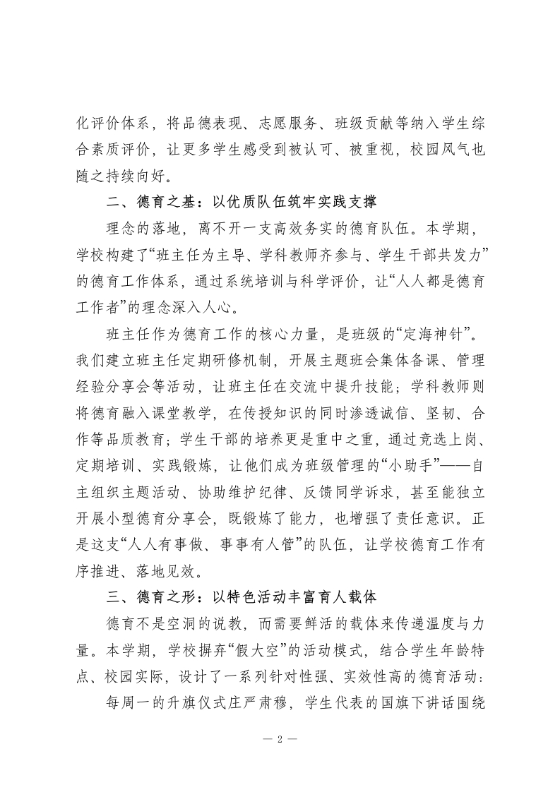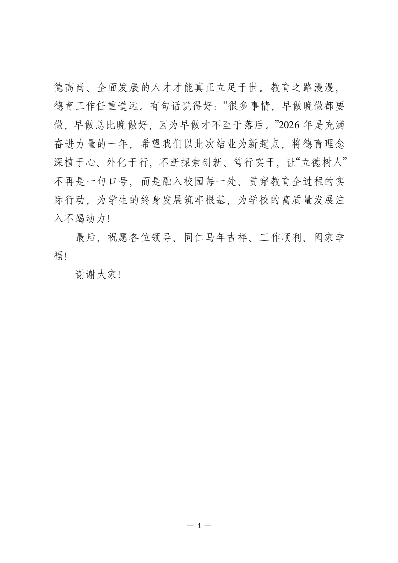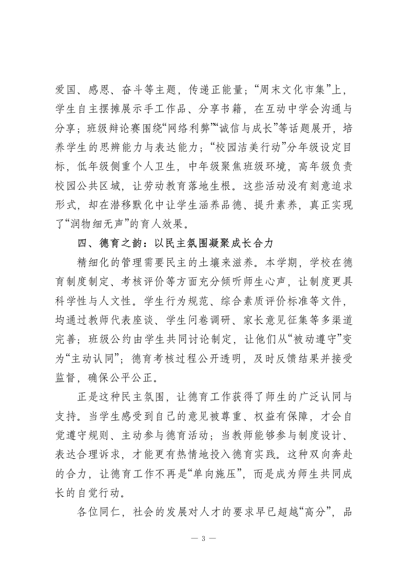 秋季学期结业典礼上德育副校长讲话:早行笃行立根本,德育铸魂育新人尊敬的各位领导、各位同仁:大家上午好!冬日的晨光虽带着寒意,却挡不住我们此刻心中的不舍与感悟。今天,我们为本学期画上圆满句号,也为这段充实的教育征程梳理收获、沉淀思考。回望这一学期,学校在德育工作中探索前行,既收获了成长与认可,也对“立德树人”的真谛有了更深刻的体悟。接下来,我想结合本学期的实践与反思,与大家分享几点心得。一、德育之魂:以先进理念引领成长方向教育的本质是唤醒人、成就人。本学期,学校打破“唯成绩论”的局限,确立“以生为本、全面发展”的德育理念一校门口“校园因你而美,成长为你而来”的标语,办公室里“耐心育桃李,微笑待同仁”的警示语,都在时刻提醒我们:教育不仅要关注分数,更要关注学生的品格养成、心灵成长。反观当下部分教育现状,一些学校仍深陷升学率的焦虑,嘴上高喊“德育为先”,行动上却把教学成绩作为唯一标尺。久而久之,成绩薄弱的学生被忽视、自我放弃,成绩优异的学生滋生骄傲情绪、缺乏同理心,校园管理陷入被动。其实,“立德”方能“树人”,只有班风正、学风纯,学生才能在健康的氛围中潜心向学,学校才能实现可持续发展。这一学期,我们通过优1