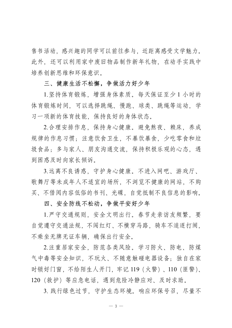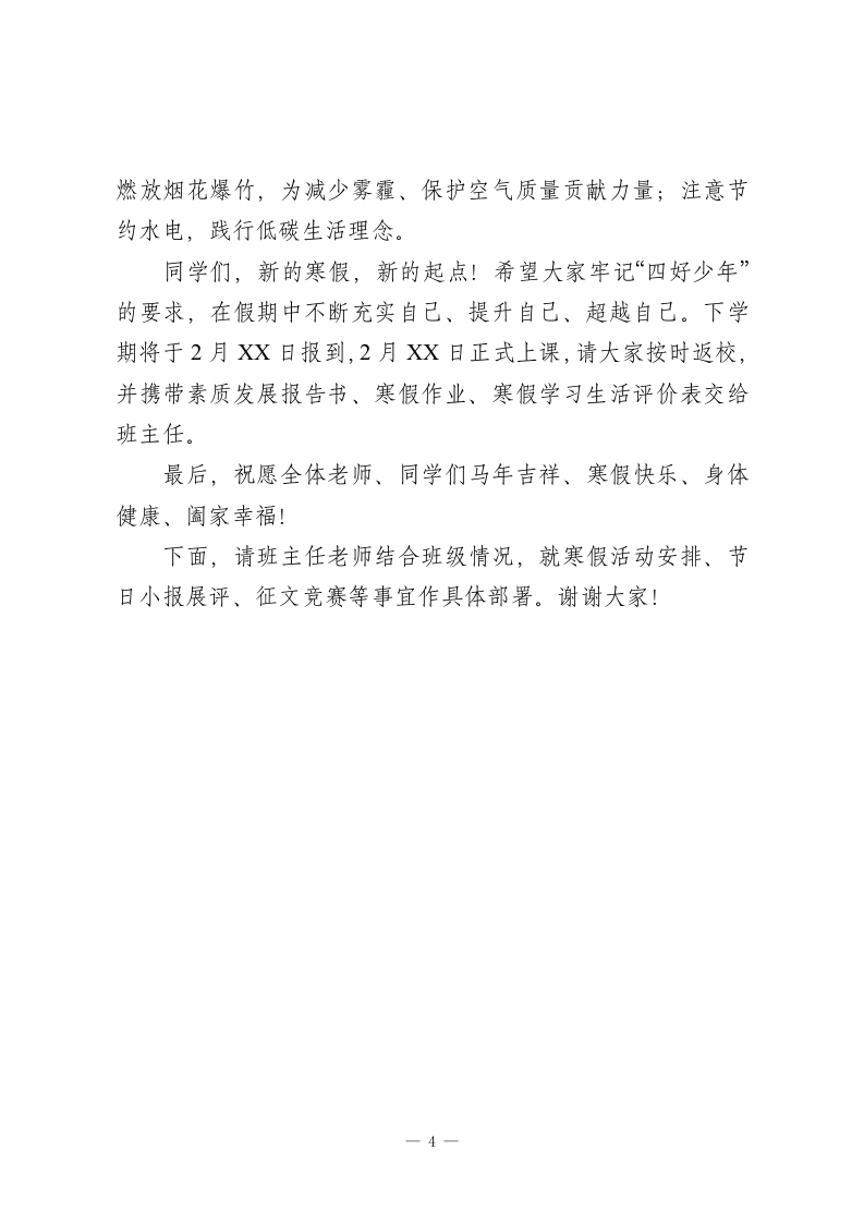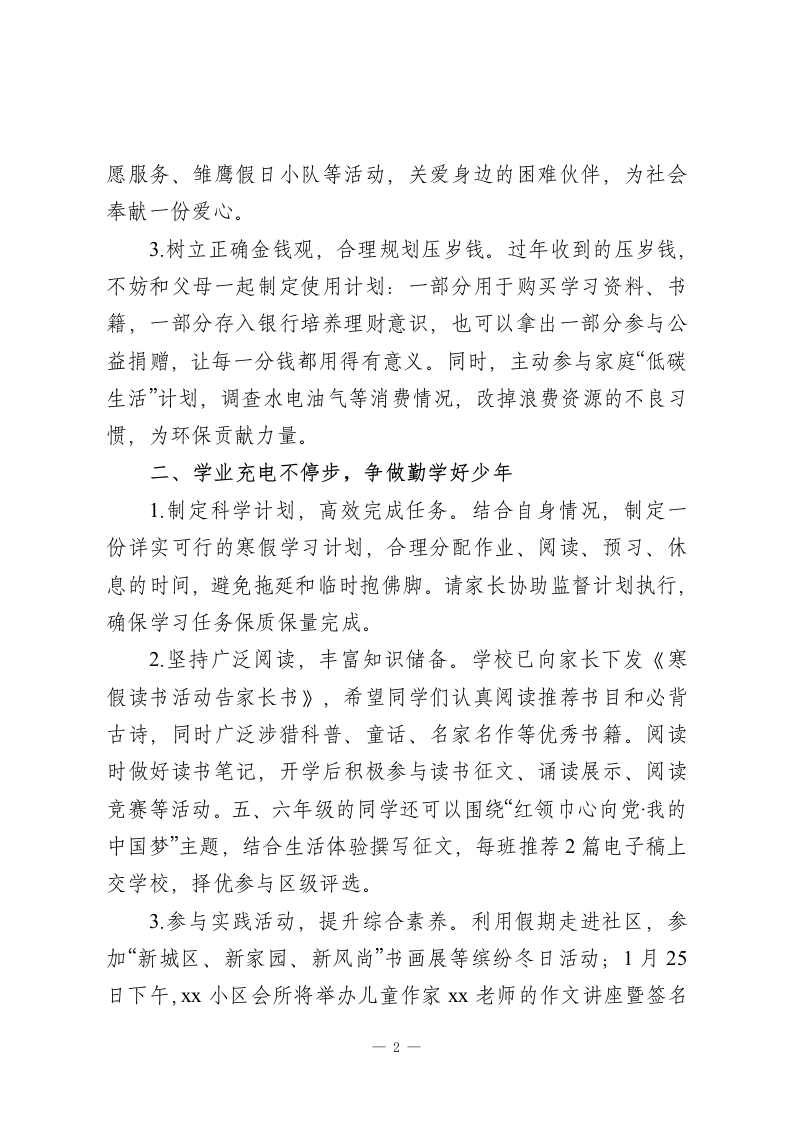 秋季学期末寒假休业式校长讲话:以马年奋进之姿,争做寒假“四好少年”敬爱的老师们、亲爱的同学们:大家早上好!冬日暖阳映校园,欢声笑语盼假期。明天,我们期盼已久的寒假就要正式开启了!在此,我谨代表学校,向一学期来辛勤耕耘、无私奉献的全体老师们致以最衷心的感谢!向勤奋好学、在各方面取得进步的同学们,致以最热烈的祝贺!寒假是放松身心的时光,更是成长赋能的契机。2026年是充满活力与奋进的一年,学校希望每一位同学都能以龙马精神为指引,争做“品德好、学业好、健康好、安全好”的寒假四好少年,度过一个健康、快乐、安全、有意义的假期。下面,我给大家提几点具体建议:一、品德修行不打烊,争做文明好少年1.传承传统文化,品味节日内涵。这个寒假恰逢除夕、春节、元宵三大传统佳节,希望同学们积极参与写春联、剪窗花、学唱民俗歌谣、搜集节日传说等活动,感受中华传统文化的魅力。用文字、画笔或镜头记录节日里的温暖瞬间,制作成节日小报,开学后参与学校的展评活动。2.践行感恩担当,分担家庭责任。主动关心父母长辈,每天做一些力所能及的家务,比如扫地、洗碗、整理房间、为长辈捶背等,用实际行动回报家人的养育之恩。积极参与社区志1