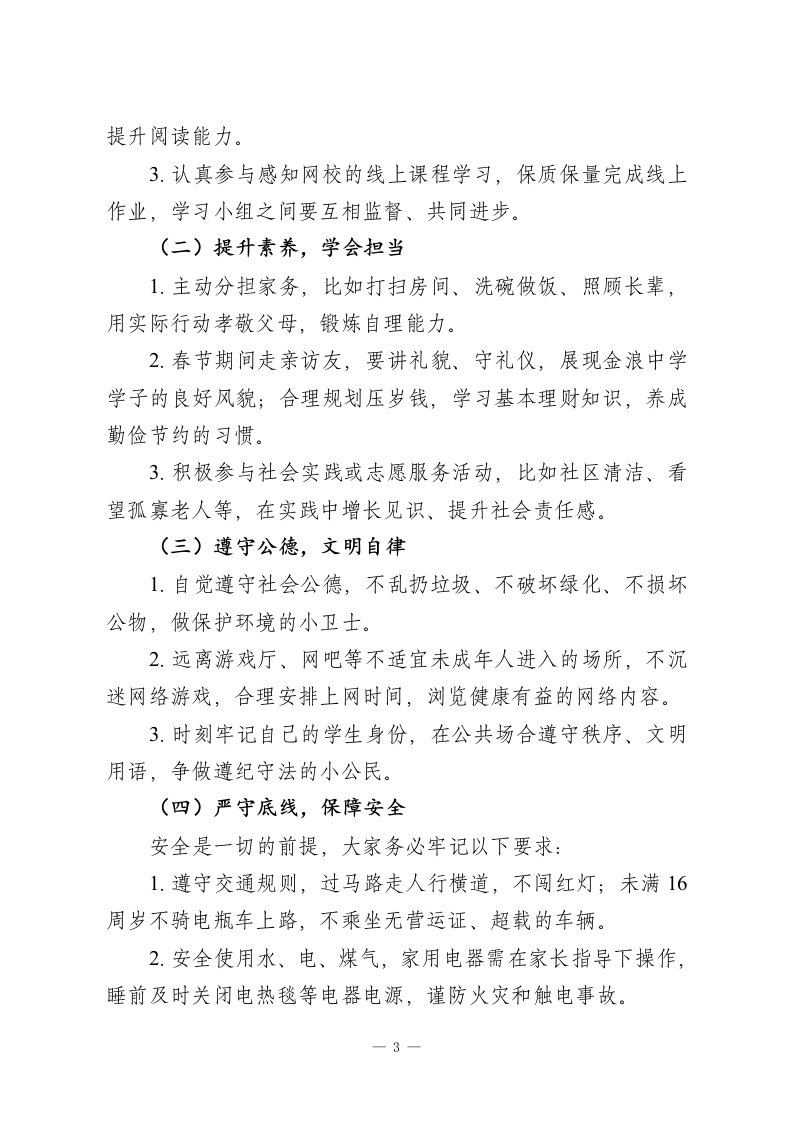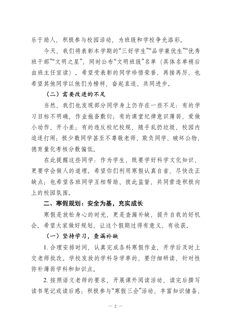 秋季学期末寒假休业式校长讲话:总结成长收获,共度充实寒假老师们、同学们:大家上午好!岁月匆匆,本学期已接近尾声,愉快的寒假即将开启。回顾这一学期,我们在忙碌中收获成长,在拼搏中积蓄力量,每一份付出都有回响,每一段时光都值得铭记。在此,我谨代表学校,向辛勤耕耘、无私奉献的全体老师致以衷心的感谢!向刻苦学习、奋勇争先的全体同学表示热烈的祝贺!今天,我主要和大家交流两方面内容:一是回顾本学期的成长与收获,二是聊聊如何度过一个安全、充实、有意义的寒假。一、学期总结:在拼搏中成长,在收获中前行这一学期,学校办学条件持续优化,新增2个智慧教室、1个学科探究实验室,为教育教学提供了更坚实的保障;教师队伍不断精进,多位老师在市级教学竞赛、课题研究中获奖,课堂教学质量稳步提升。全校师生齐心协力,赢得了家长的信任与社会的认可,这一切都离不开大家的共同努力。(一)学生成长亮点纷呈同学们在德智体美劳各方面均取得显著进步:在市级学科竞赛、科技创新大赛、文艺展演中,共有32名同学获奖,充分展现了金浪学子的综合素质;在德育量化考核中,涌现出一大批品学兼优的学生一一他们刻苦钻研、成绩优异,关心集体、1