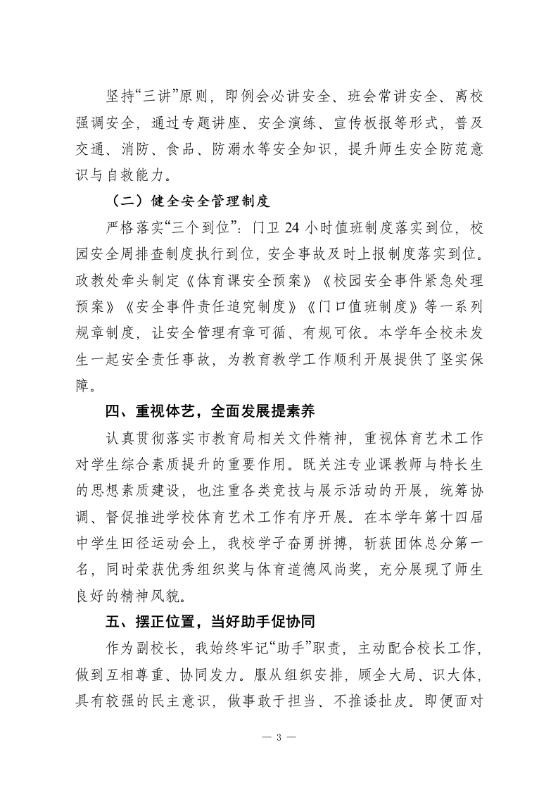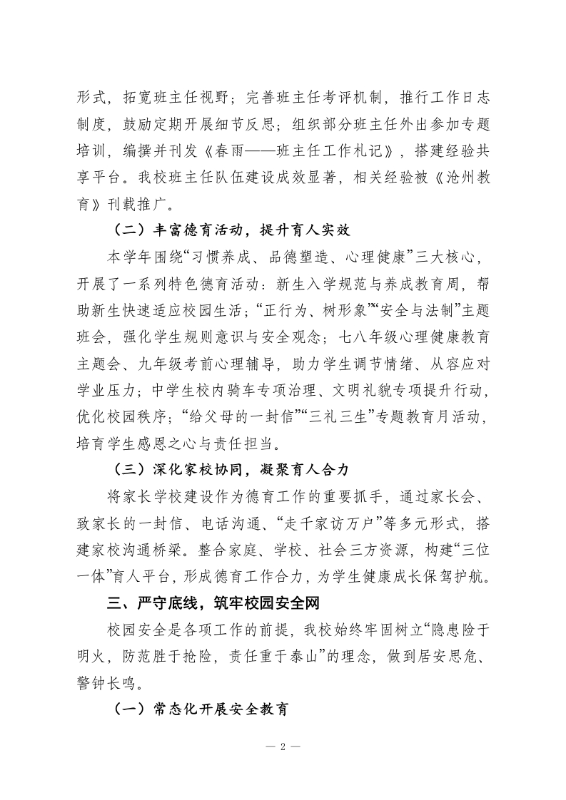 秋季学期末会议分管德育工作副校长讲话:勇担职责强德育,擬心聚力助发展各位领导、老师们:大家好!作为分管学校德育工作的副校长,本学期,我始终秉持“立德树人”根本任务,与政教处同事携手,统筹推进学生德育教育、校园文化建设、体育艺术发展、法制教育及校园安全等工作。现将本学年工作情况汇报如下,恳请大家批评指正。一、坚守初心,率先垂范强自身为更好履行岗位职责,我坚持把学习放在首位,主动钻研德育政策、管理知识与业务技能,做到“要求教师做到的,我先做到;要求师生学习的,我先学习”。工作中,始终以共产党员标准严格要求自己,既讲学习、讲政治、讲正气,也讲原则、讲团结、讲奉献,秉持强烈的事业心与责任感,作风果断、做事公道、为人谦虚,找准自身定位,妥善处理各方关系,全力推动德育工作落地见效。二、深耕德育,多措并举育新人(一)强化队伍建设,夯实德育根基1.加强政教管理团队建设,坚持每周召开政教例会,聚焦工作重点、难点,强化成员的大局意识、责任意识与服务意识,持续提升工作能力与效率。2.重点打造高素质班主任队伍:通过定期组织经验交流会、观看专题培训光盘、学习专家前沿理念、发放成长提升材料等1